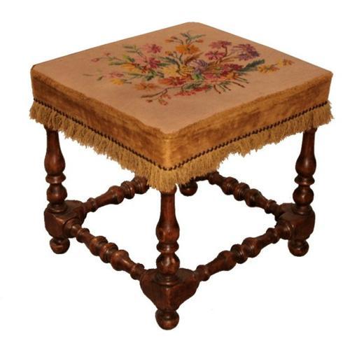 French Louis XIII (Renaissance) style solid walnut foot stool with original 19th-century tapestry. From the Rhone Valley.