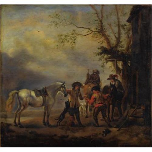 <B>Circle of PHILIPS WOUWERMAN </B></I>(Dutch 1619-1668)<BR><I>A Hunting Party Departing from an Inn</B></I><BR>Oil on beveled oak panel<BR>10-5/8 x 11-3/4 inches (27.0 x 30.0 cm)<BR>Initialed lower left:<I> W</B></I><BR>Wax seal on verso<BR> <B>Condition Report:</B> Overall good condition<BR><BR><b>Shipping:</b> Requires 3rd Party Shipping (<a target="_blank" href="http://www.heritageauctions.com/common/shipping.php">view shipping information</a>)