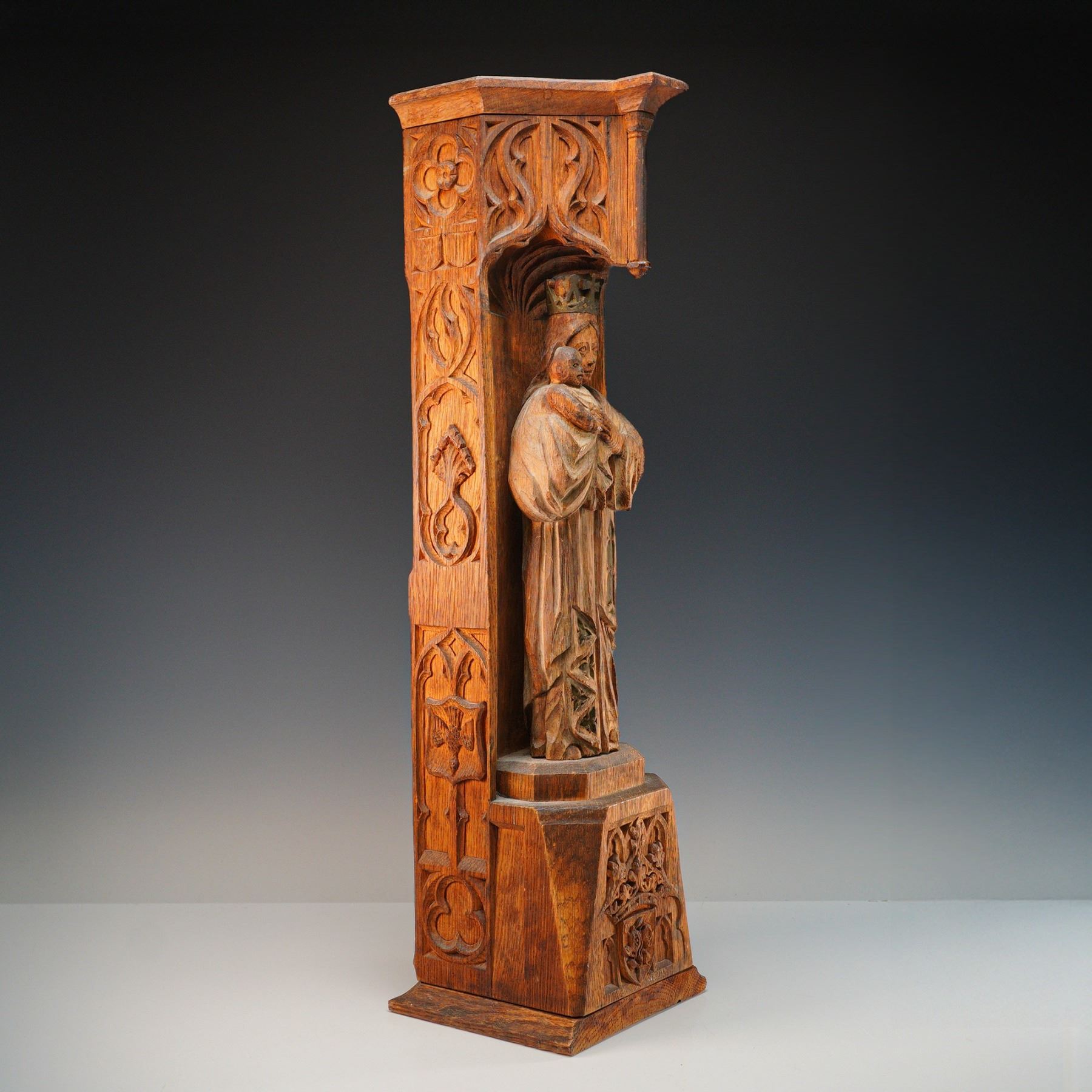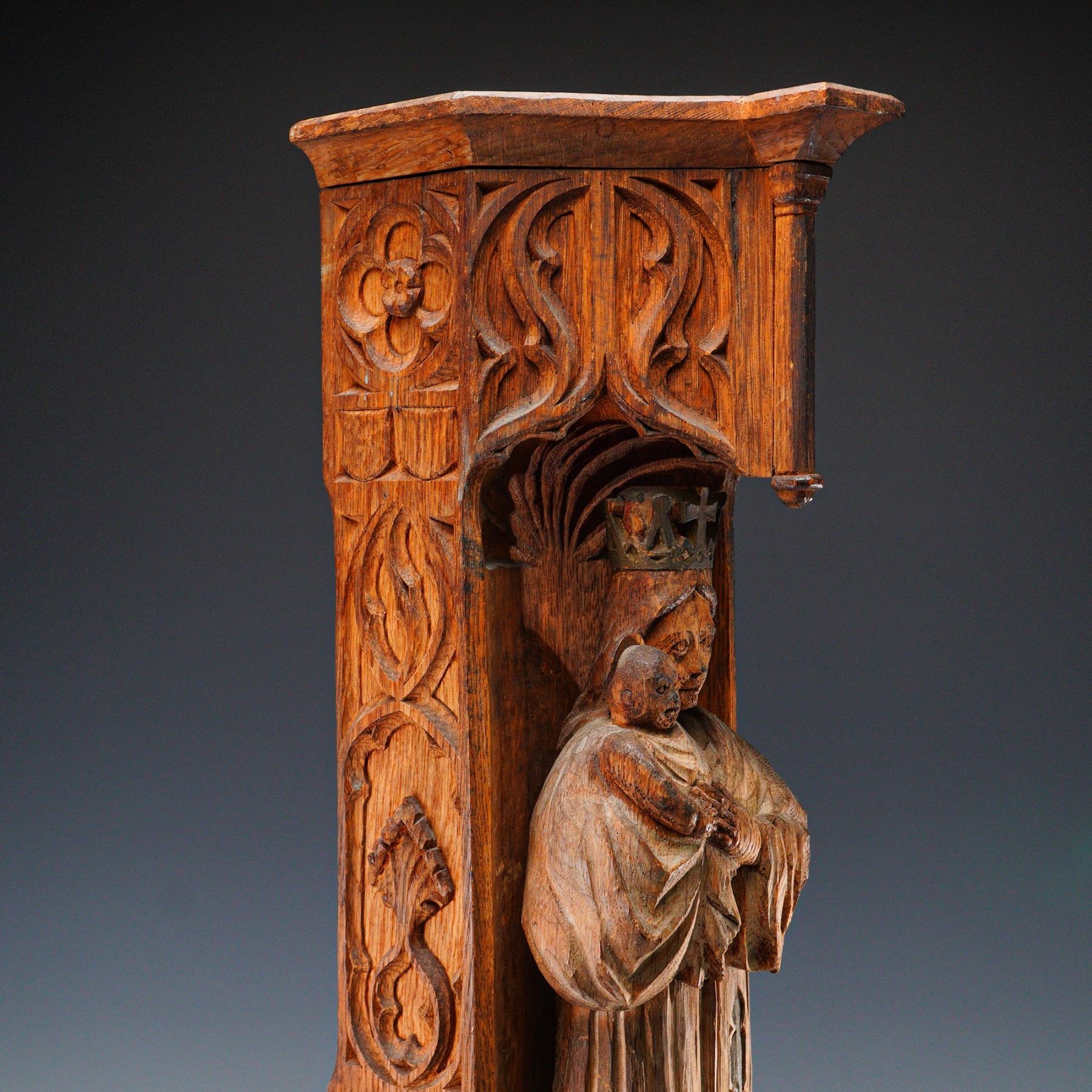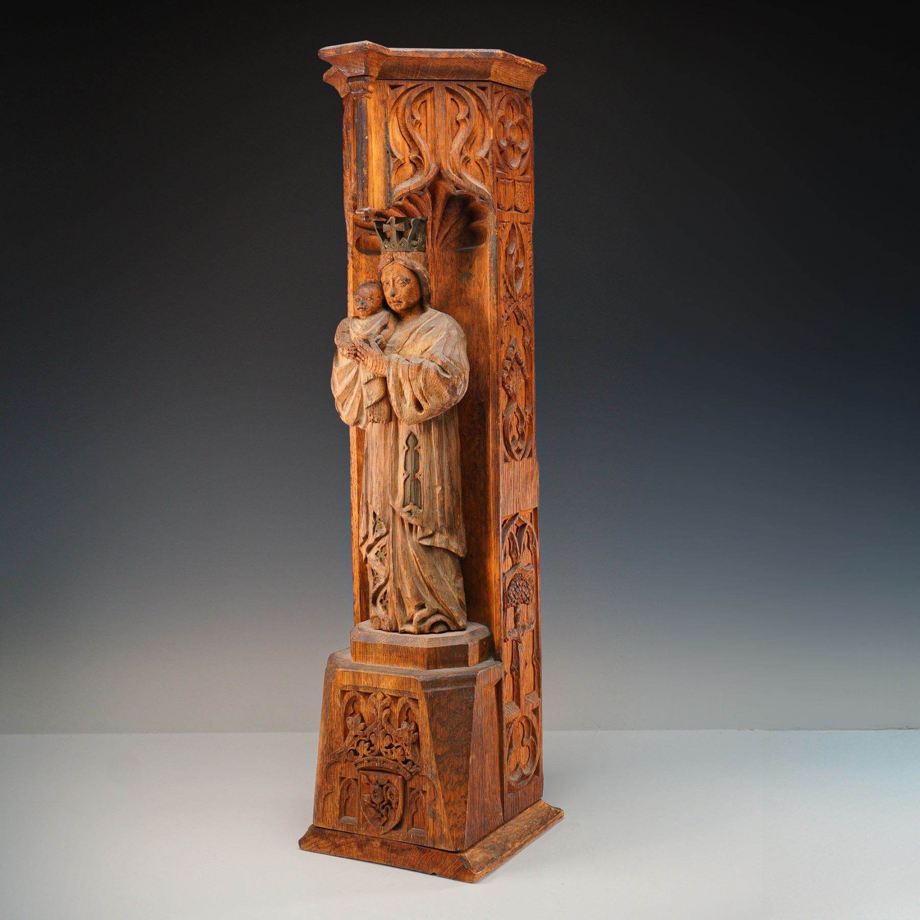 An impressive and finely executed Gothic Revival wall-mounted niche, hand-carved in oak and depicting the crowned Madonna and Child in high relief. The Virgin Mary is shown standing beneath a canopied arch, robed in long flowing garments and holding the infant Christ. The figures are carved directly into a vertical architectural panel with deeply carved tracery, floral motifs, and heraldic elements, including a gothic-style crest with flowering branch near the base. The architectural form resembles a miniature cathedral buttress or column, with pointed arch details and crocketed spandrels. The side panels are adorned with repeated quatrefoil and stylized vinework patterns. The carving is clearly the work of a skilled artisan, with a naturalistic sense of volume and ecclesiastical symbolism throughout. Likely English or Northern European in origin, and produced in the late 19th to early 20th century, during the height of the Gothic Revival movement. These devotional carvings were often used in churches, chapels, or private oratories.