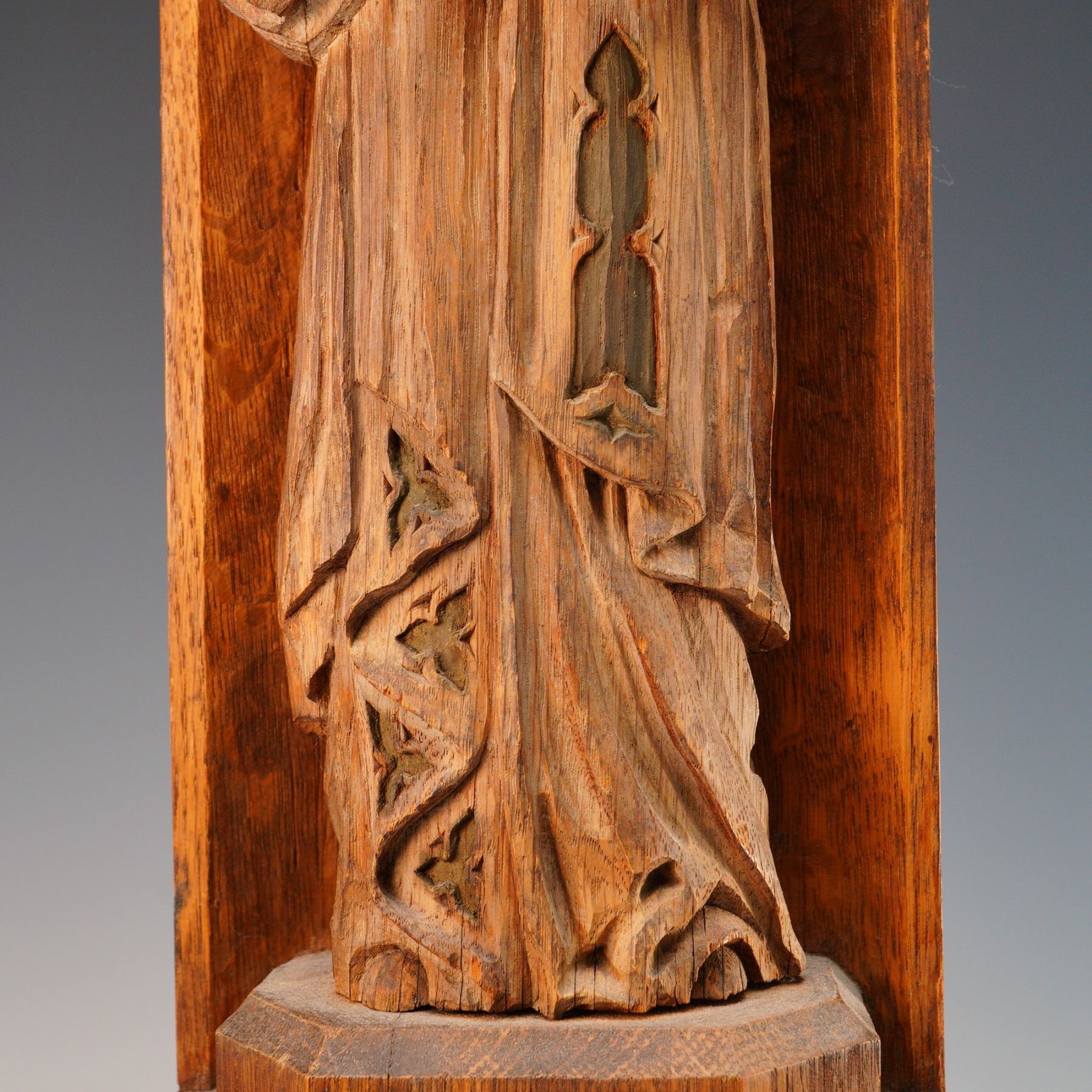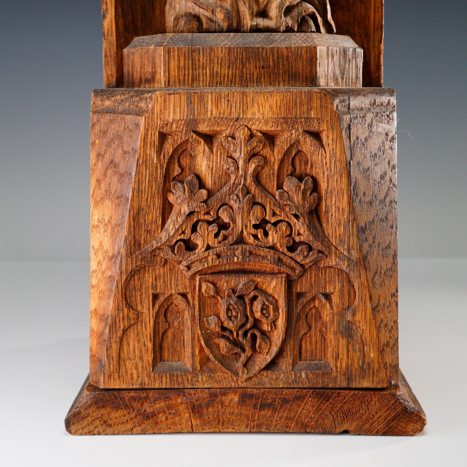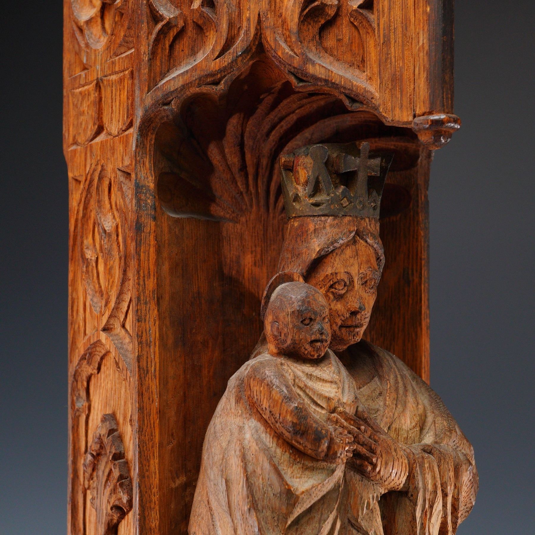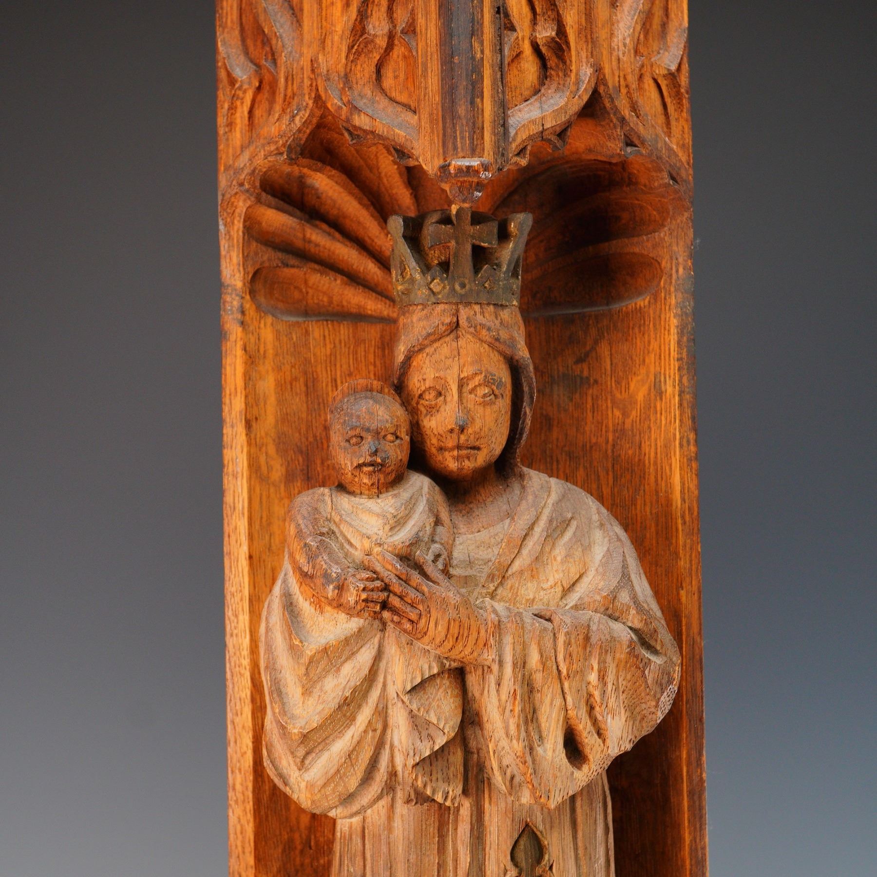An impressive and finely executed Gothic Revival wall-mounted niche, hand-carved in oak and depicting the crowned Madonna and Child in high relief. The Virgin Mary is shown standing beneath a canopied arch, robed in long flowing garments and holding the infant Christ. The figures are carved directly into a vertical architectural panel with deeply carved tracery, floral motifs, and heraldic elements, including a gothic-style crest with flowering branch near the base. The architectural form resembles a miniature cathedral buttress or column, with pointed arch details and crocketed spandrels. The side panels are adorned with repeated quatrefoil and stylized vinework patterns. The carving is clearly the work of a skilled artisan, with a naturalistic sense of volume and ecclesiastical symbolism throughout. Likely English or Northern European in origin, and produced in the late 19th to early 20th century, during the height of the Gothic Revival movement. These devotional carvings were often used in churches, chapels, or private oratories.