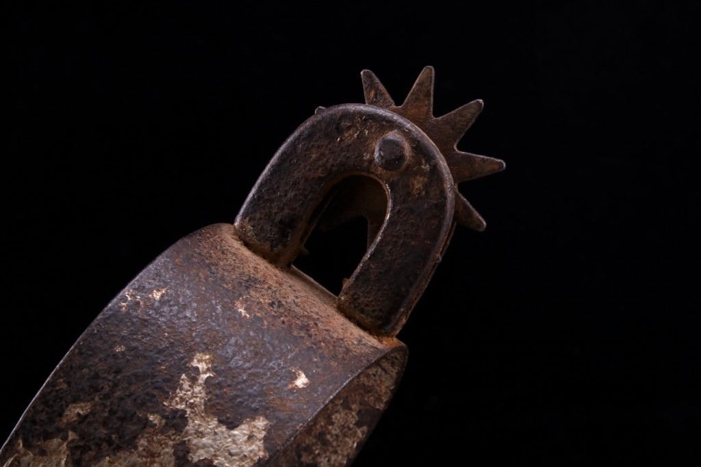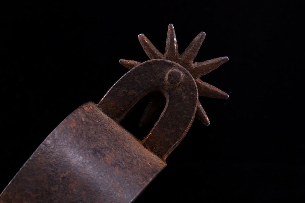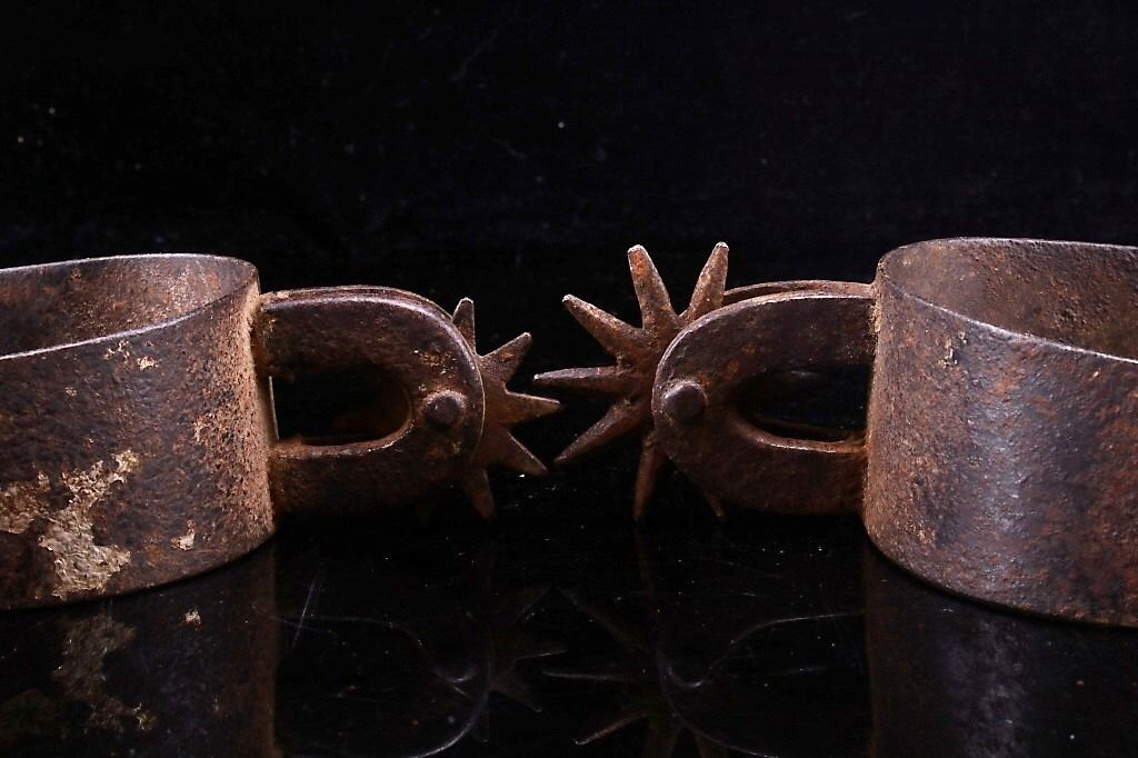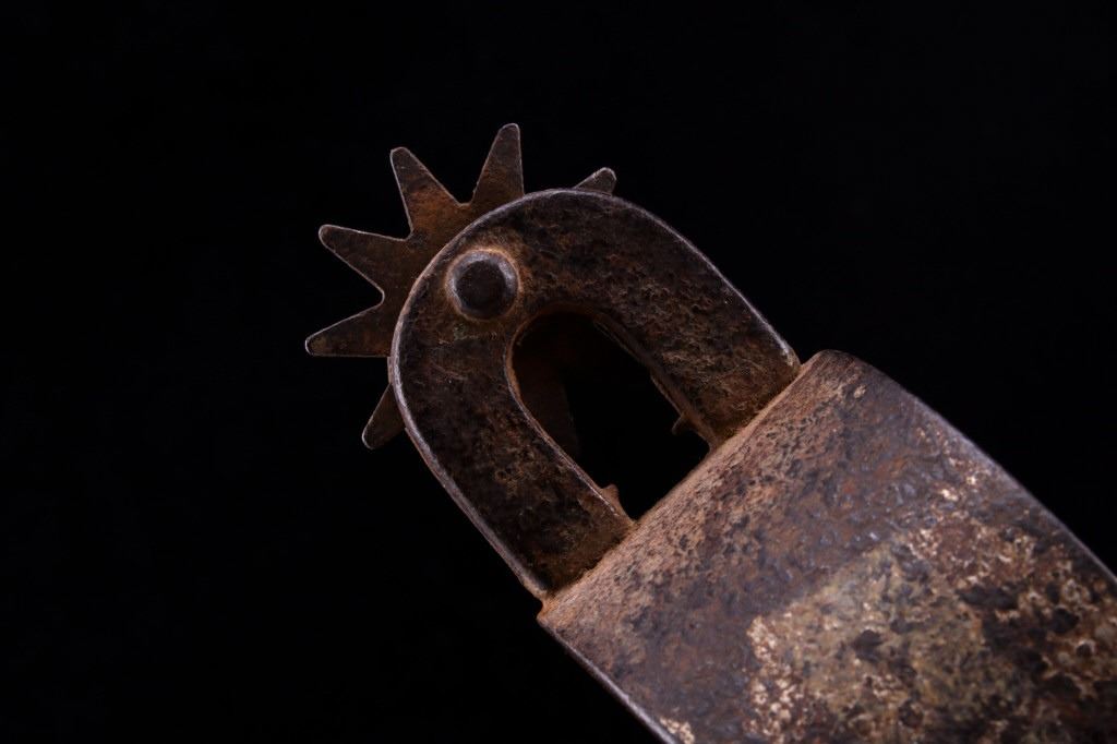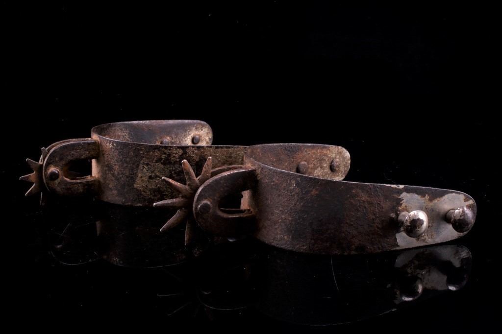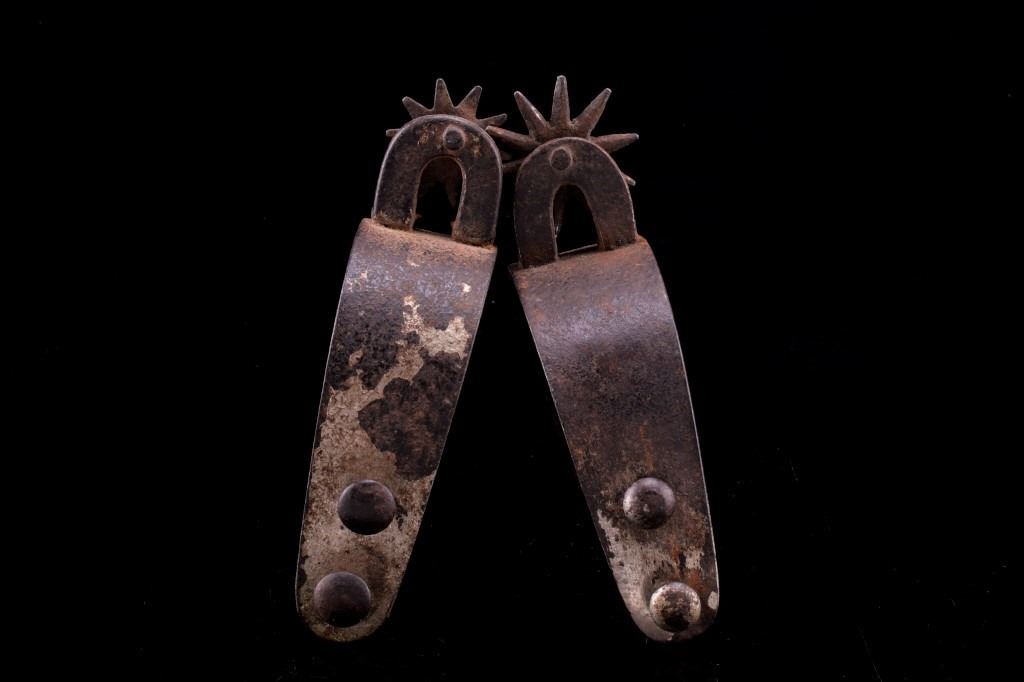 Featured in this lot is this set of hand forged, banded steel vaquero spurs, circa 19th century. The spurs show excellent construction from banded steel and were forged from one piece of steel. The spurs feature double spur strap lags and 20 sunburst rowels. The condition of these spurs is good, with no obvious signs of damage and some oxidation consistent with the age of the spurs. The measurements of these early spurs are 5" x 3 3/4" x 1 1/4".