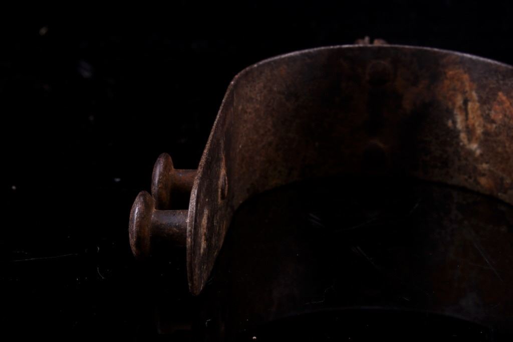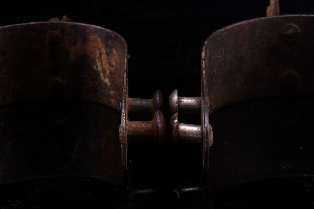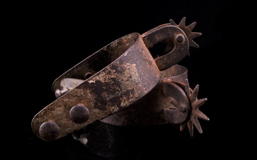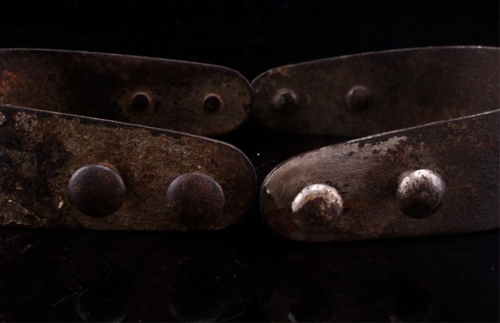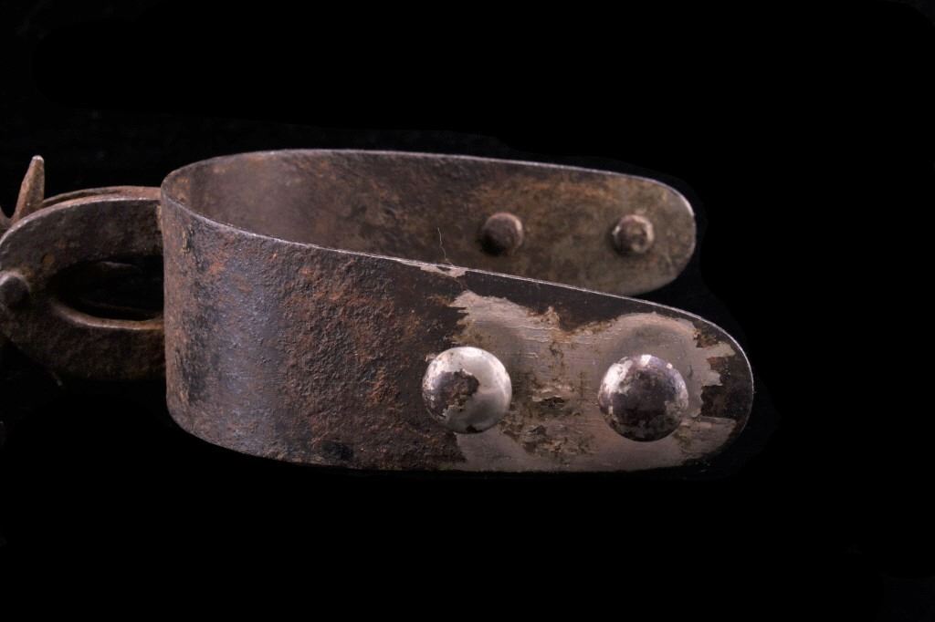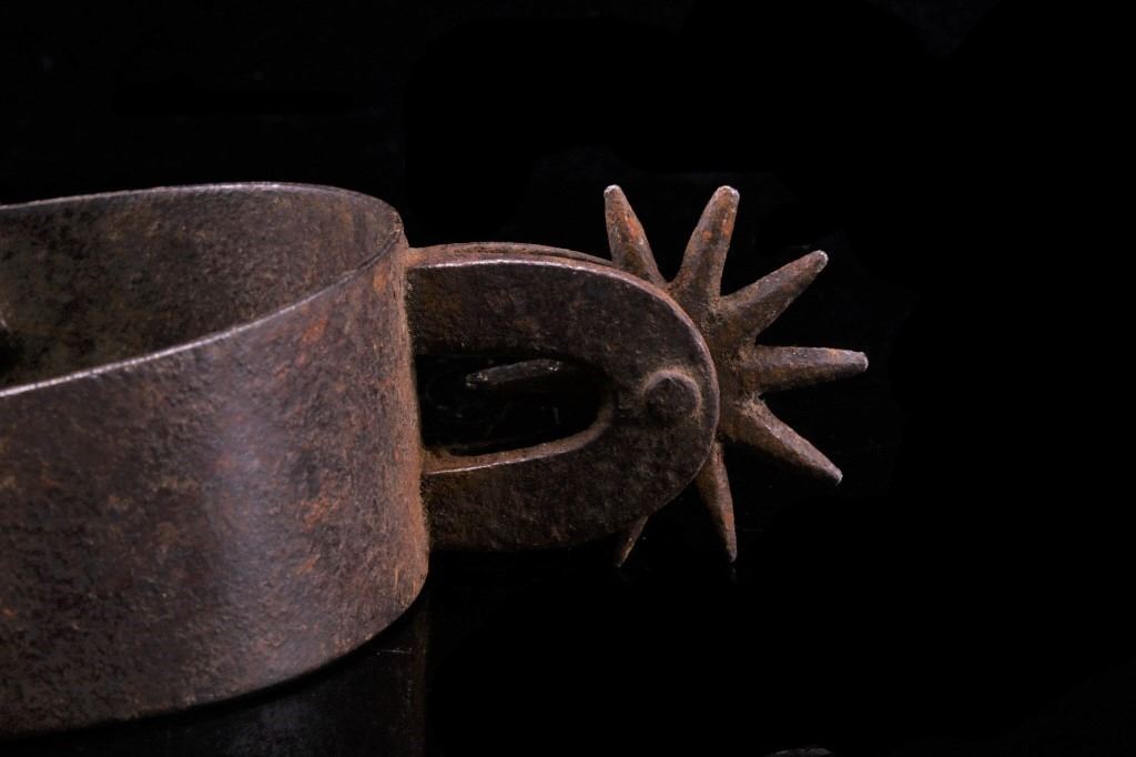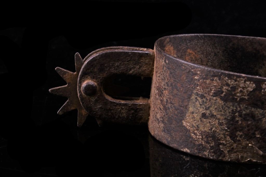 Featured in this lot is this set of hand forged, banded steel vaquero spurs, circa 19th century. The spurs show excellent construction from banded steel and were forged from one piece of steel. The spurs feature double spur strap lags and 20 sunburst rowels. The condition of these spurs is good, with no obvious signs of damage and some oxidation consistent with the age of the spurs. The measurements of these early spurs are 5" x 3 3/4" x 1 1/4".