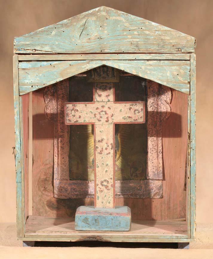Home Alter Box. 20" tall hand made & painted with an early tin lithograph of Madonna. Decorated with a wood cross. 19th century . (est $800-1,200). For condition reports please visit: www.auctioninsantafe.com/cr2011.pdf
