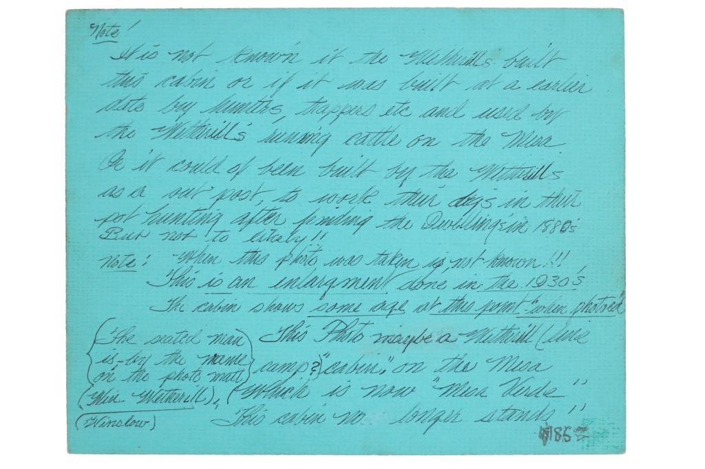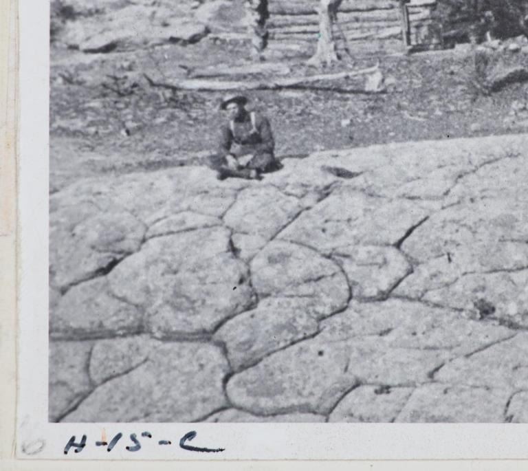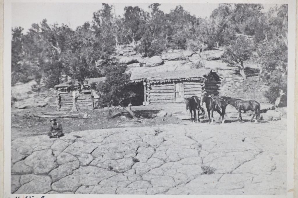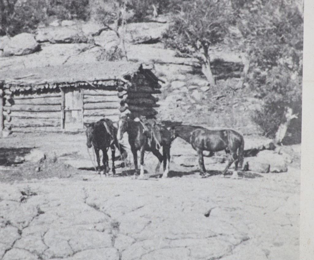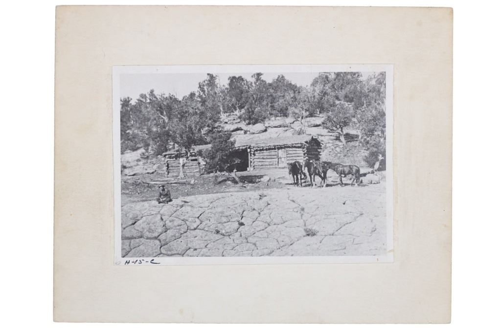 Featured in this lot is this 19th-century photo of a man sitting near a hunting and trapping cabin in the woods. This enlarged photo was made in the 1930s, with the original photo date unknown. The cabin is credited to the Wetherills, a Colorado ranching family who grazed their cattle along the Mancos River south of their ranch, but is unknown if the family built the cabin. It was used by hunters, trappers and others as a place of sanctuary during their travels or adventures. The man sitting on the rock in the foreground is thought to be Win Wetherill, the son of B.K. Wetherill. A few horses and the log cabin stand behind the man as he sits on the rocks. The photo is marked with sharpie reading, "H-15-C". The photo shows good condition overall with some wear present from its age and use over the years, but no signs of damage is noted. The visible photo measures 5" L x 7 1/8" W, while the entire piece measures 8" L x 10" W. It weighs under 6 ounces.