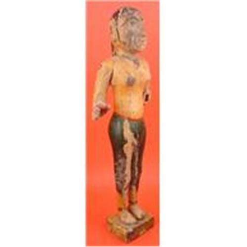 A rare gessoed and polychromed late 19th Century figure of a Female Dancer, sensitively rendered in form, so very different from any contemporary Indian folk carvings in style and execution. A photo of a 19th Century bronze example from Orissa can be provided for comparison. The condition of the bare wood, especially where the left arm has broken, may indicate even greater age than the late 19th Century. The use of iron nails in the attachment of the arms would clearly place it within the time frame of the British rule of India. Sculpture should be considered as delicate in condition. These sculptures are rarely seen on the market. The size would probably indicate some public festival functionality, rather than use in a private home. It comes from Orissa, and is in many respects reminiscent of early dynastic wood carvings from Egypt, both in its monumental stance and in the serene composition of its face. Nice details include the curled hair at the side of the face and hair down the back. The sculpture has suffered some losses, notably to the left arm, and areas of gesso having flaked off. One native repair was done at some time in the past, where the rear of the base was repainted. That paint job was not gessoed, but clearly has some considerable age, as it is itself flaking off, not being as stable as the gessoed surfaces. Height is 15.5 inches (39.5cm).