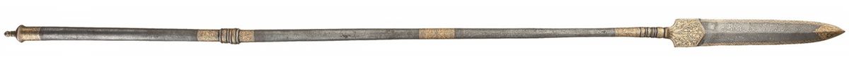 Measuring 47 inches overall, the spear is all-steel in construction, with a Damascus pattern applied to the exterior and fine koftgari-pattern gold embellishment, chiefly scroll and floral patterns. Double edged spear point blade, 10 inches long, with a smooth shaft terminating in a flared round pommel. The rear 12 3/4 inches can unscrew and detach from the rest of the weapon. Provenance: The William Ashby Collection