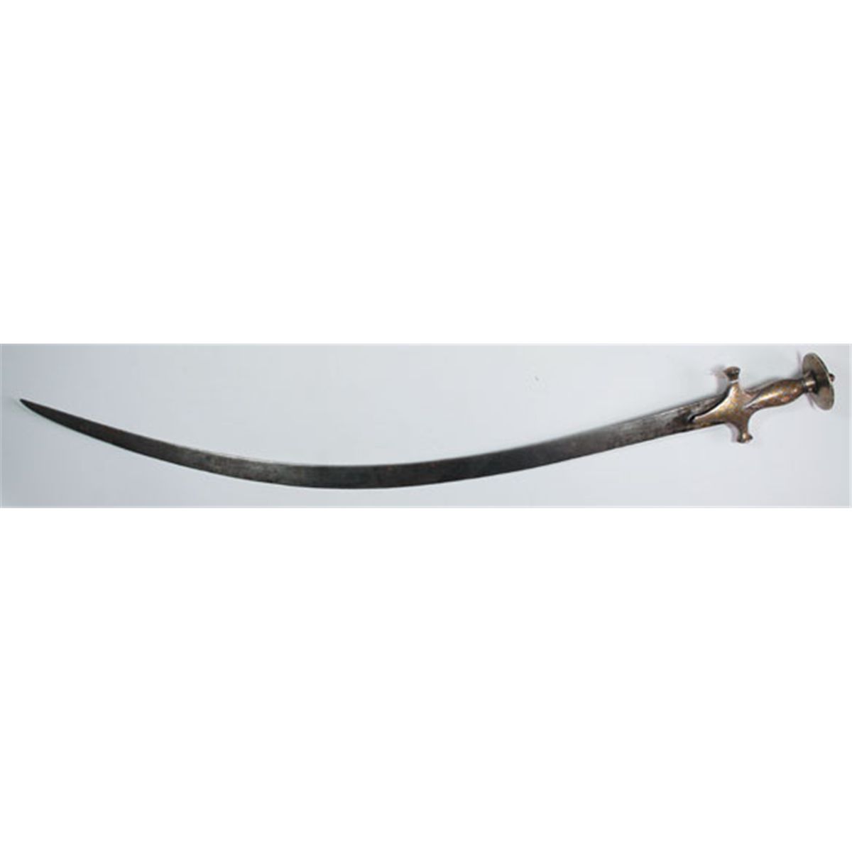 Curved shamsir sword, the hilt decorated with a foliate pattern in the Koftgari manner. Also with a British Victorian court sword and Celtic style brass sword with scabbard. (3 items)