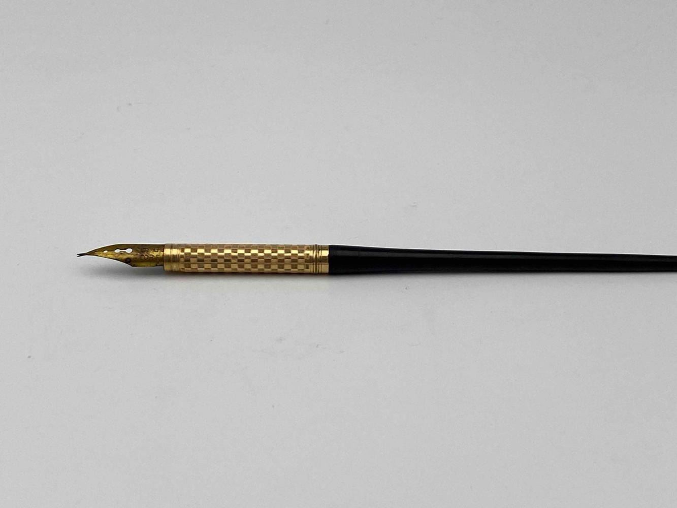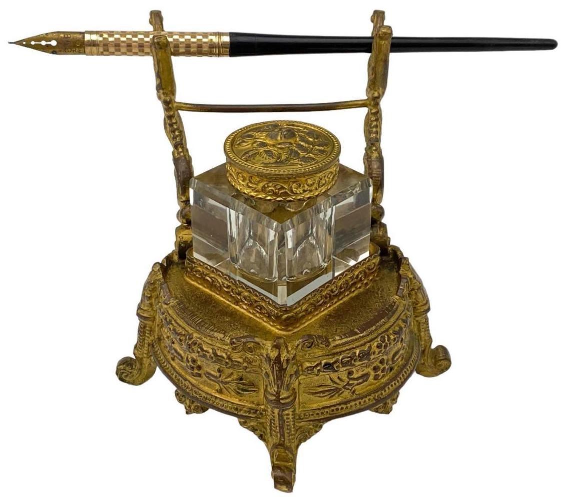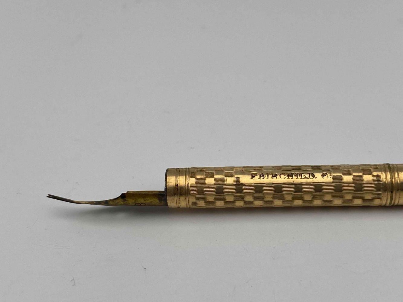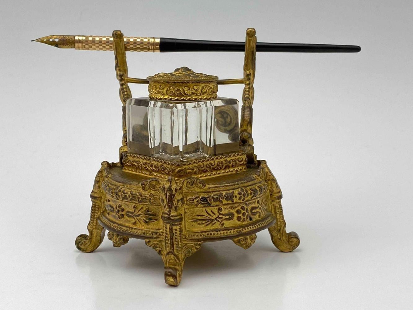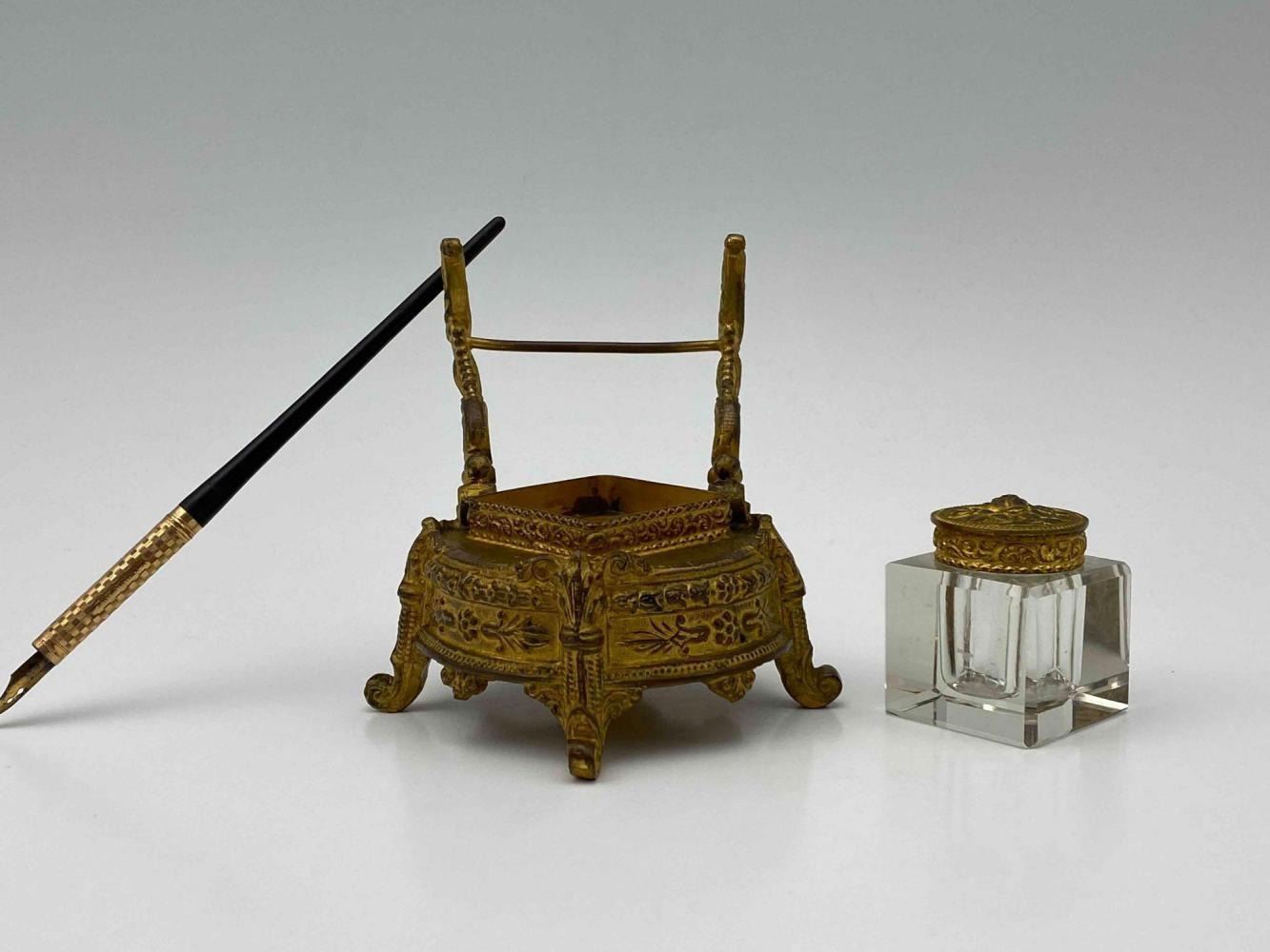 19th Century Inkwell With Gold Filled Tip Pen. Pen Marked Fairchild. Please Not Small Chips In Rim Of Glass Inkwell, Typical For Age, Difficult To Photograph. Stand Approximately 3.875W x 3.625H in. Pen Approximately 6.0L x 0.25W in.
