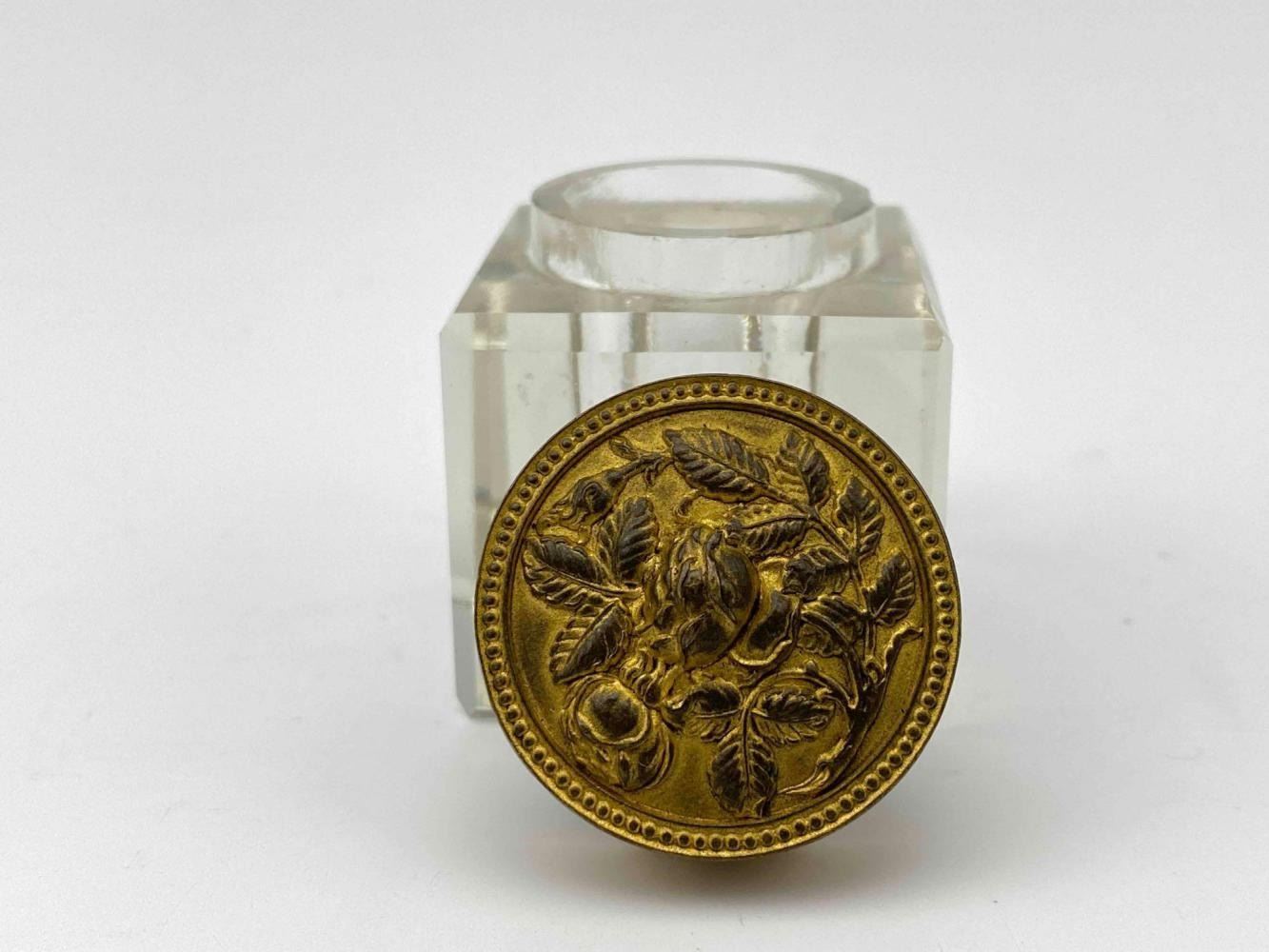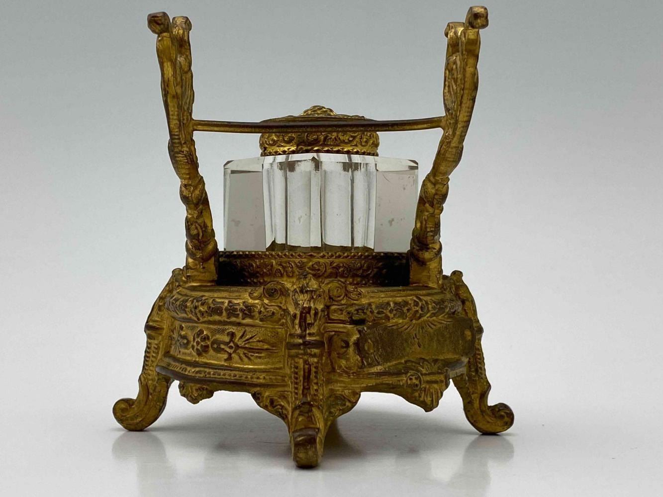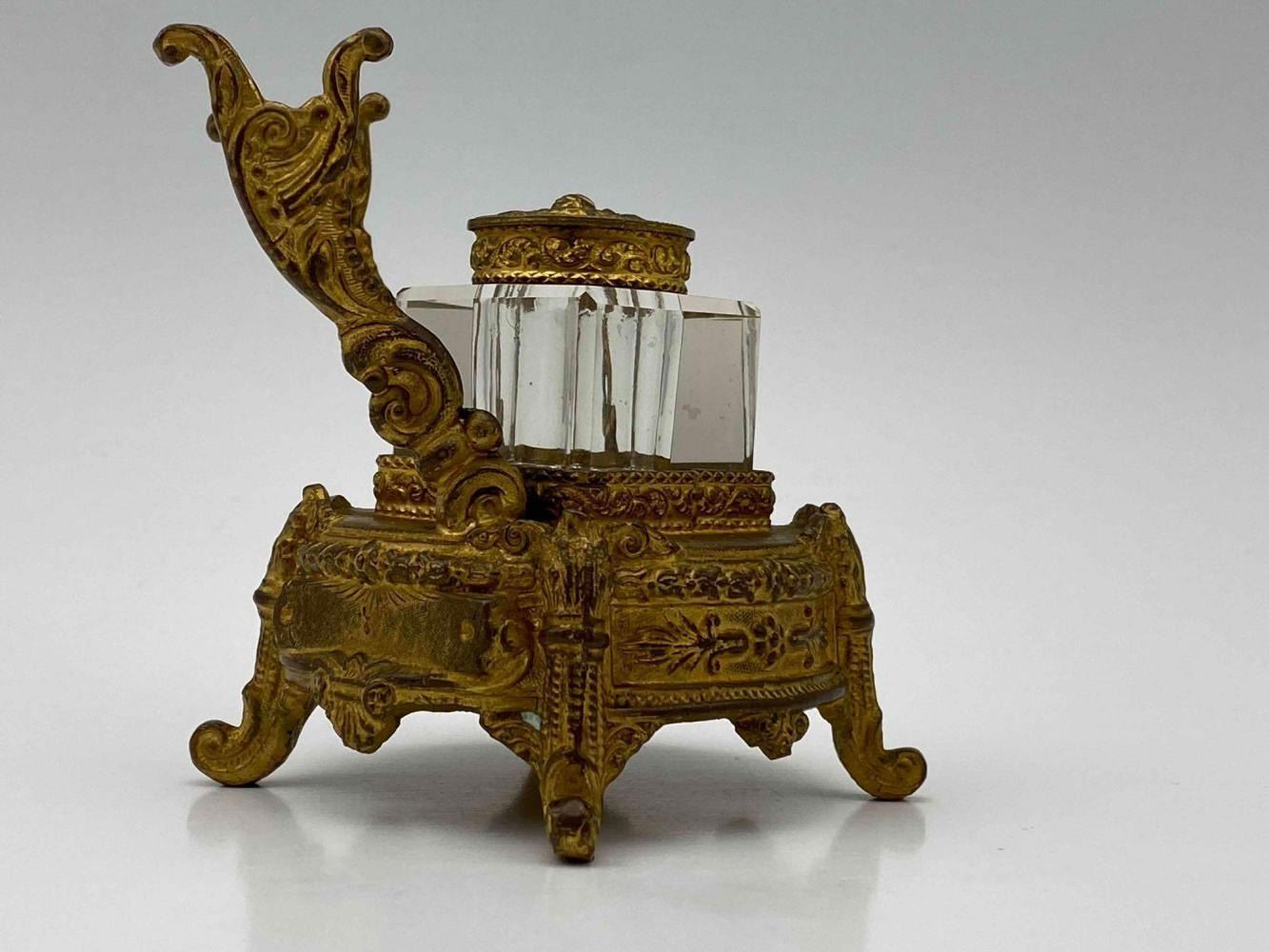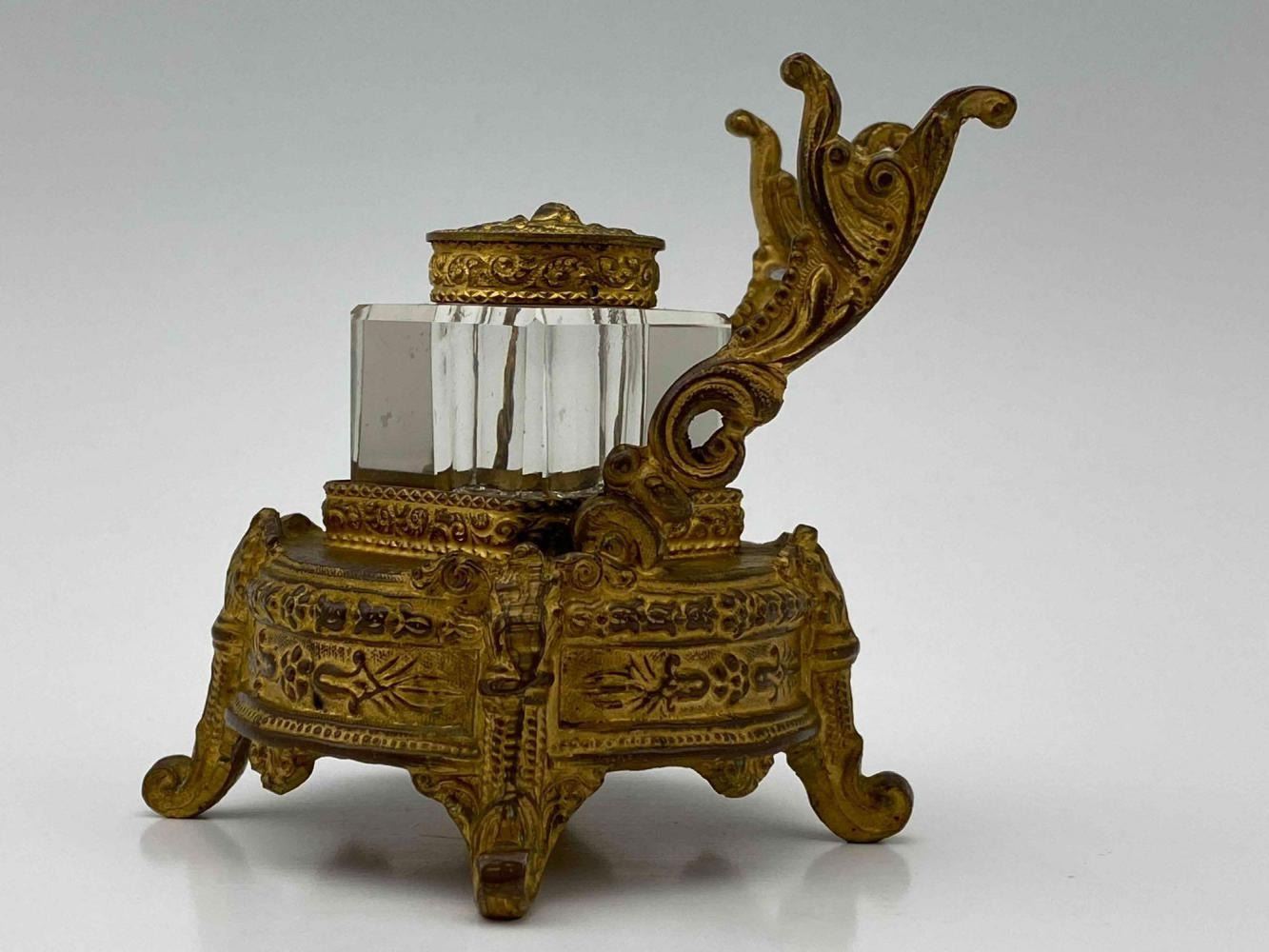 19th Century Inkwell With Gold Filled Tip Pen. Pen Marked Fairchild. Please Not Small Chips In Rim Of Glass Inkwell, Typical For Age, Difficult To Photograph. Stand Approximately 3.875W x 3.625H in. Pen Approximately 6.0L x 0.25W in.