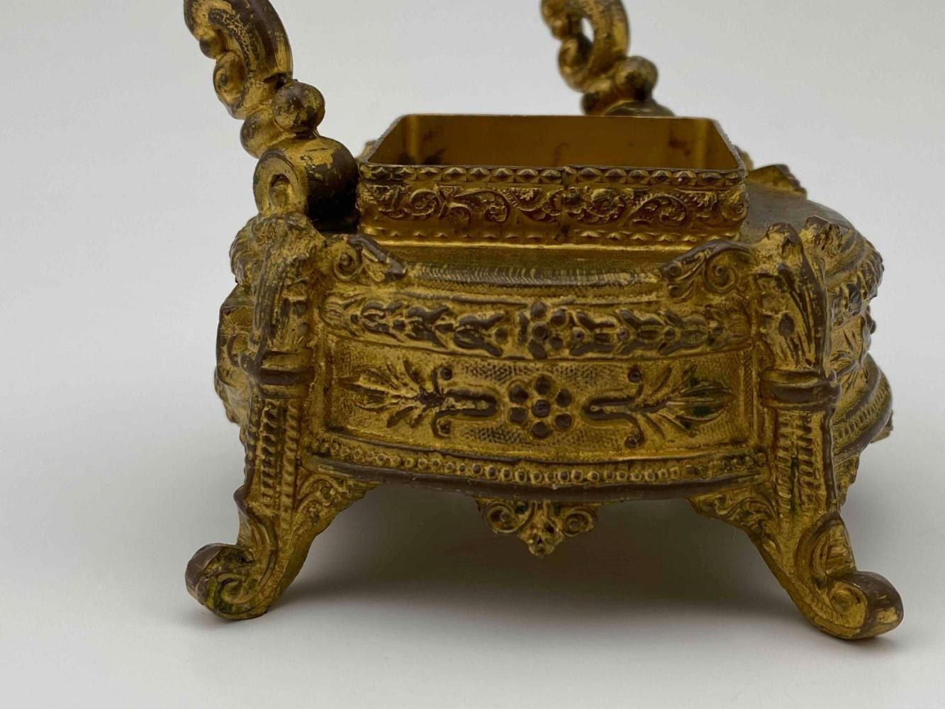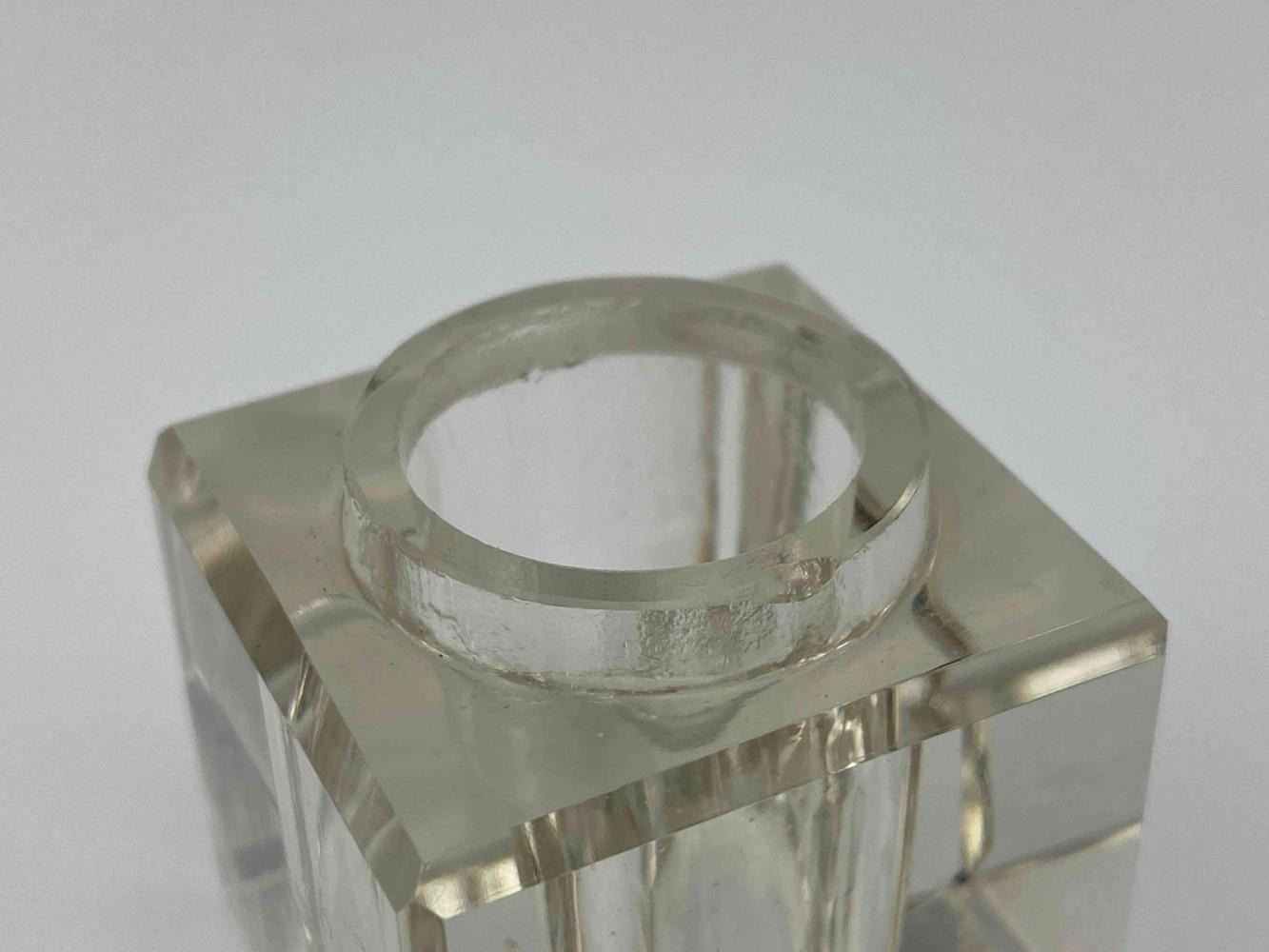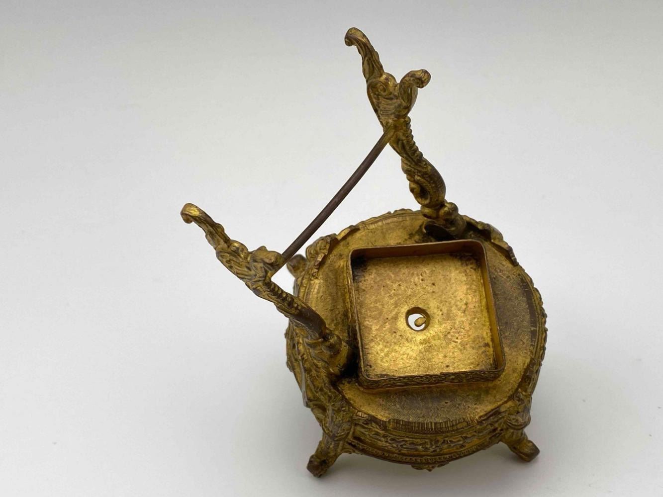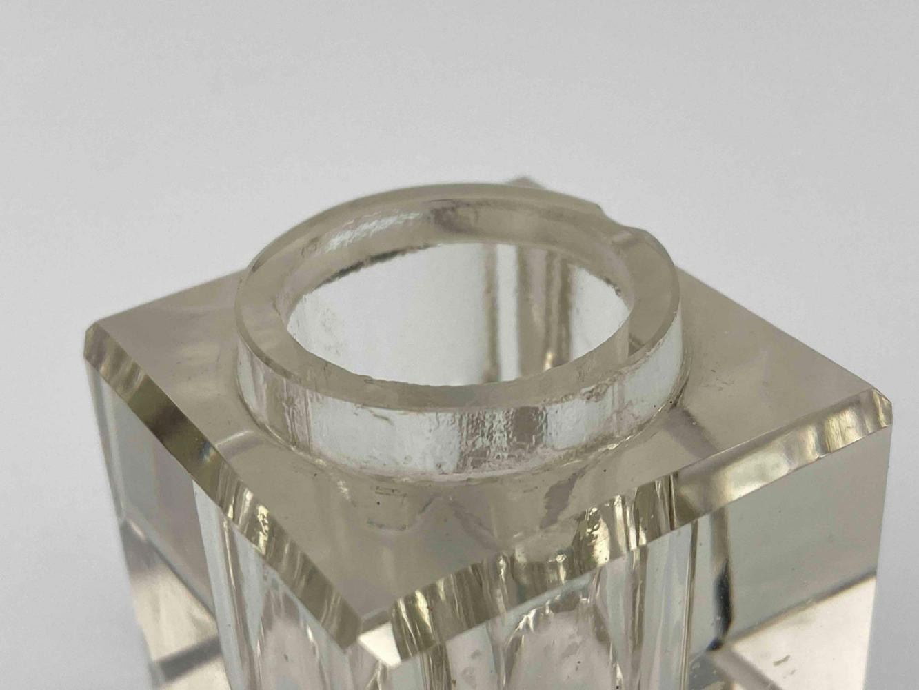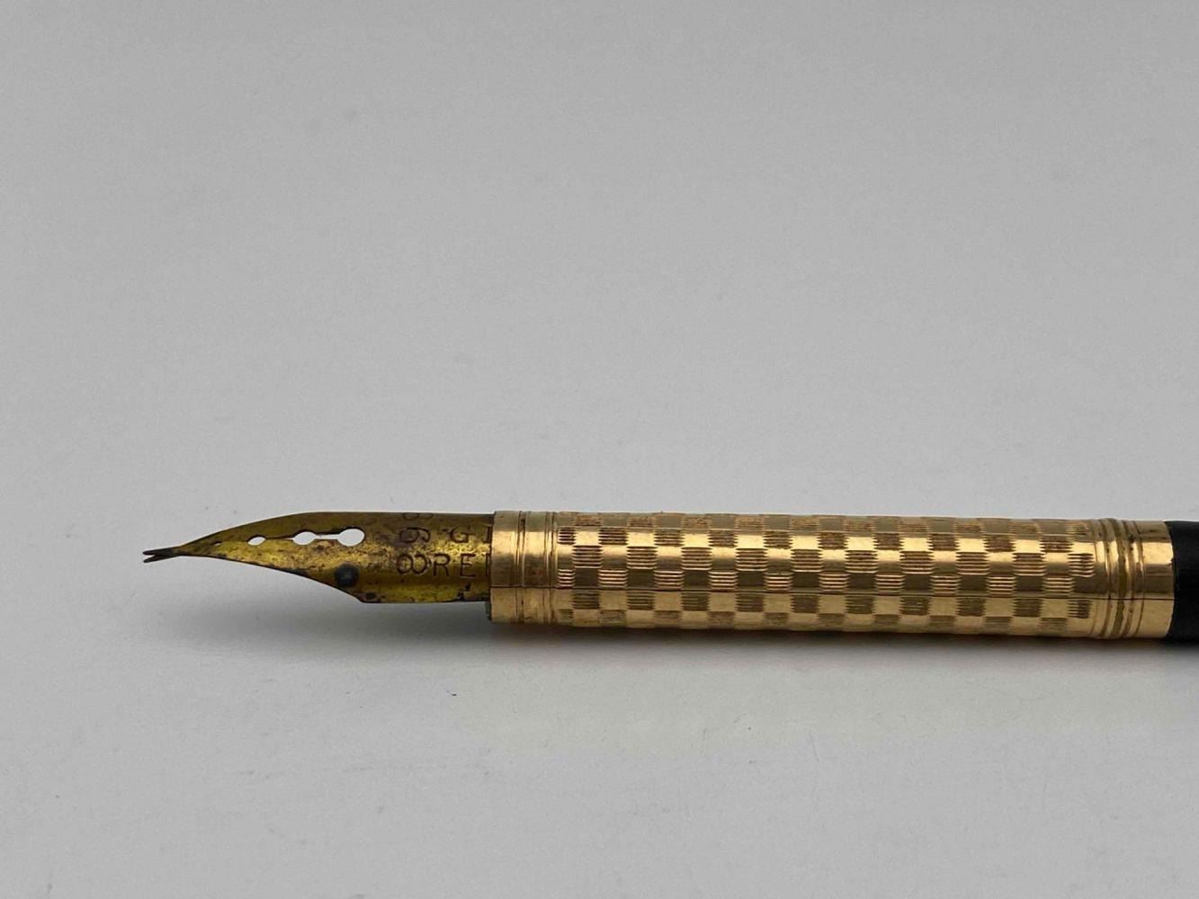 19th Century Inkwell With Gold Filled Tip Pen. Pen Marked Fairchild. Please Not Small Chips In Rim Of Glass Inkwell, Typical For Age, Difficult To Photograph. Stand Approximately 3.875W x 3.625H in. Pen Approximately 6.0L x 0.25W in.