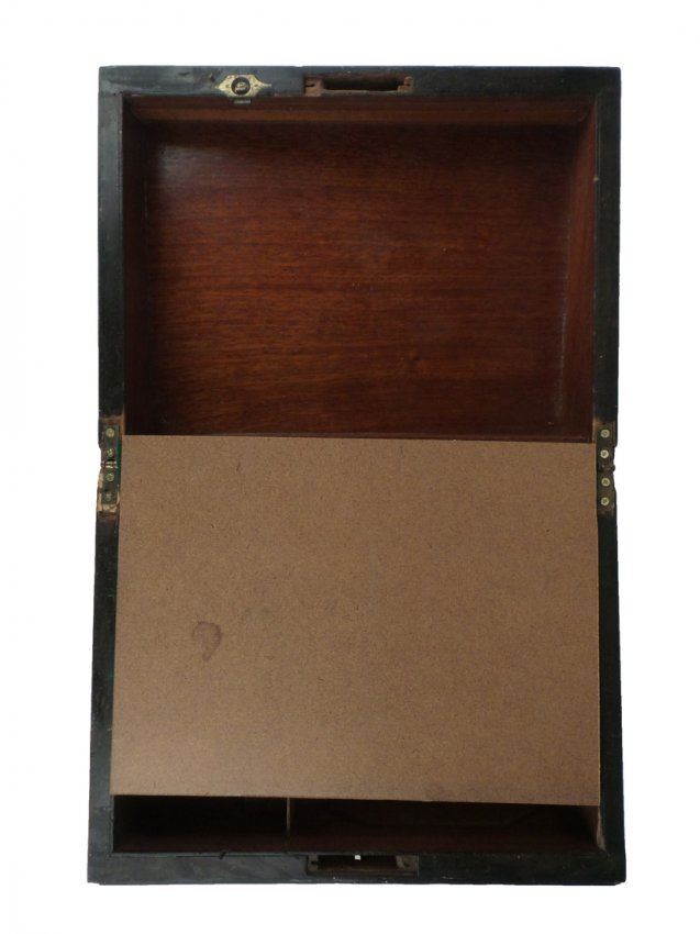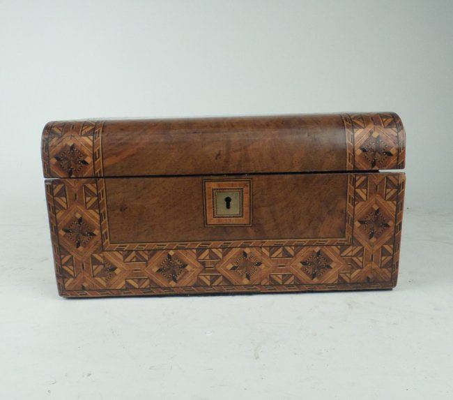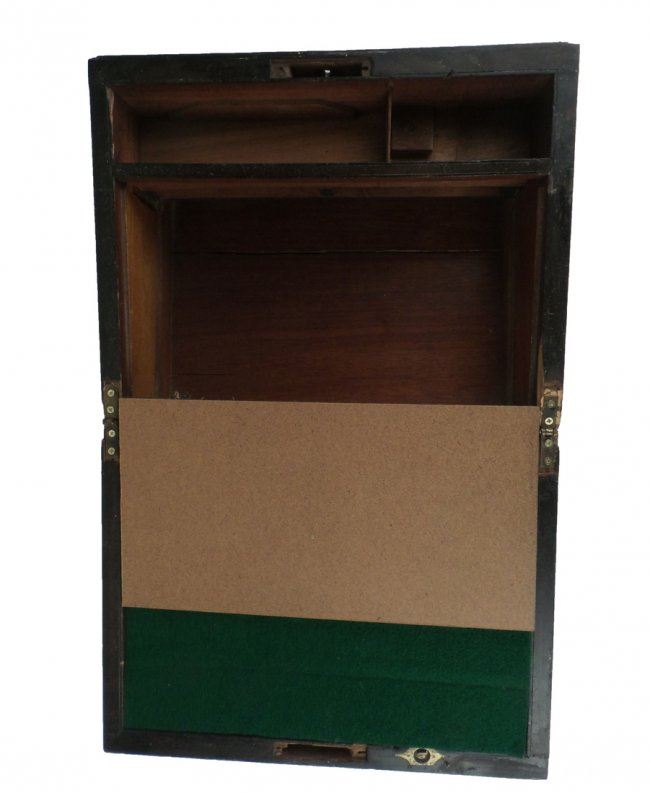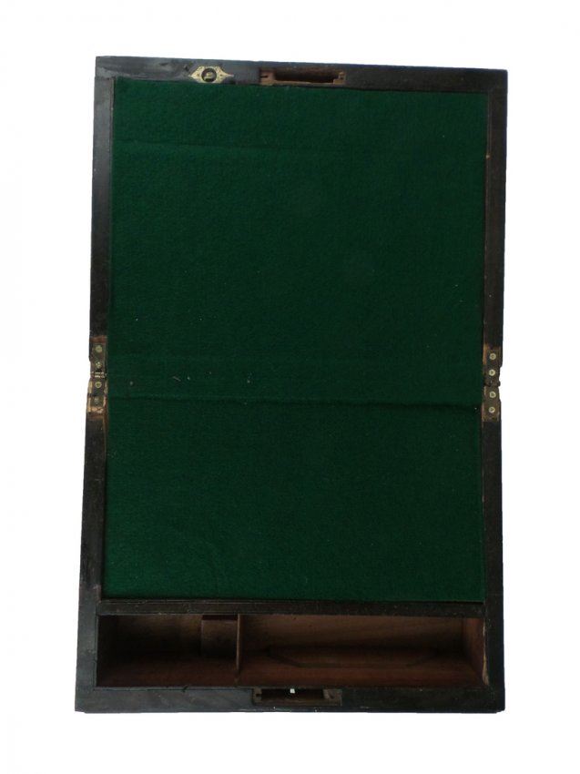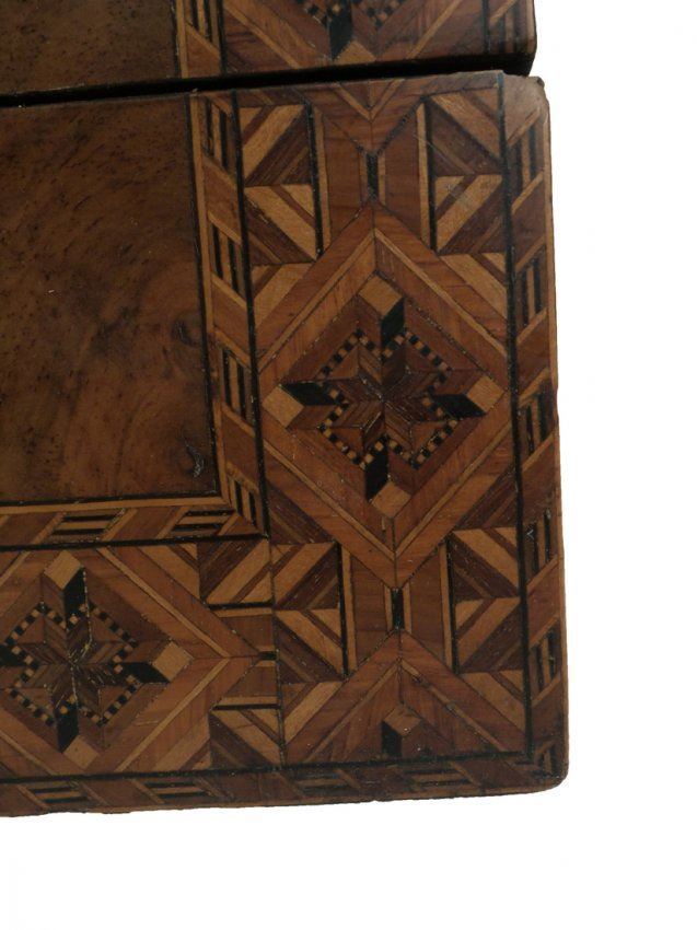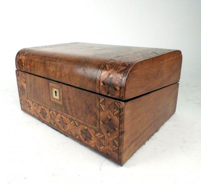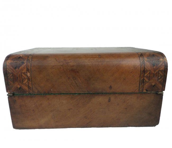 Mixed inlay, walnut lap desk. [6" H x 11 3/4" x 9 1/4"]. Lock missing, some condition issues.