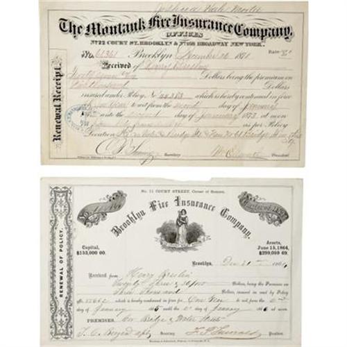 <B>19th Century Insurance Renewal Receipts</B></I> Two printed insurance renewal receipts, each 8.5" x 5.25", insuring property at the corner of Bridge and Water Streets [New York], one from the Brooklyn Fire Insurance Company, dated December 31, 1864; the other from the Montauk Fire Insurance Company, dated December 26, 1871, both have old fold creases, else they are in very good condition. <BR><BR><BR><b>Shipping:</b> Flat Material, Small (<a target="_blank" href="http://www.heritageauctions.com/common/shipping.php">view shipping information</a>)