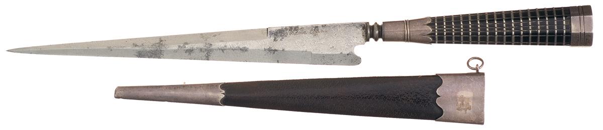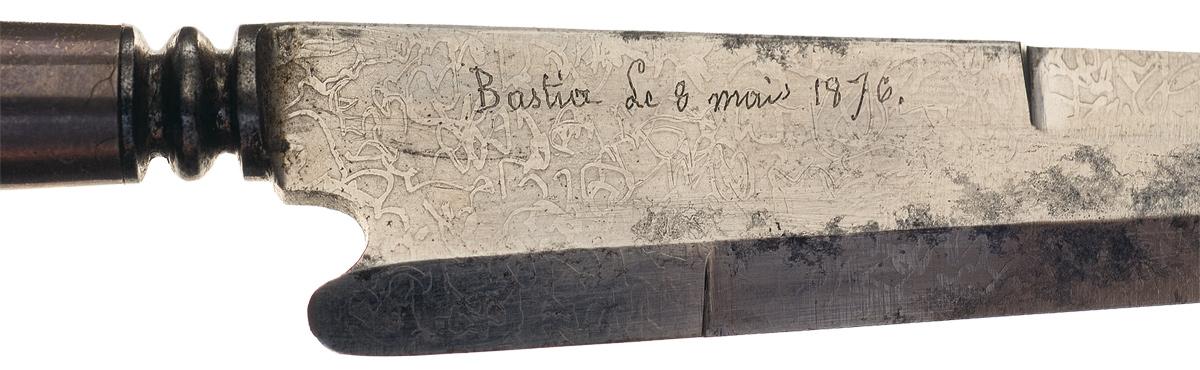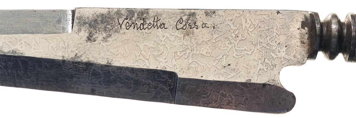The 6 1/8" long blade features an etched Damascus style pattern and is marked on the left side "Vendetta Corsa" with "Bastia Le 8 mais 1876" on the right. Silver fittings with a horn handle featuring silver inlaid bands. OAL: 9 7/8". Complete with leather covered wooden sheath with silver tip and throat.