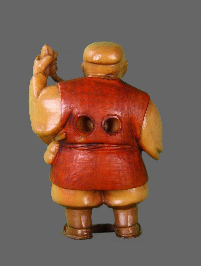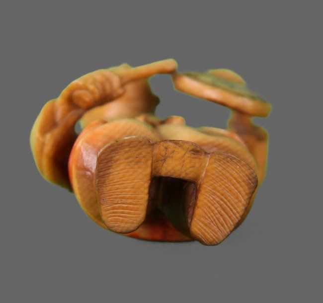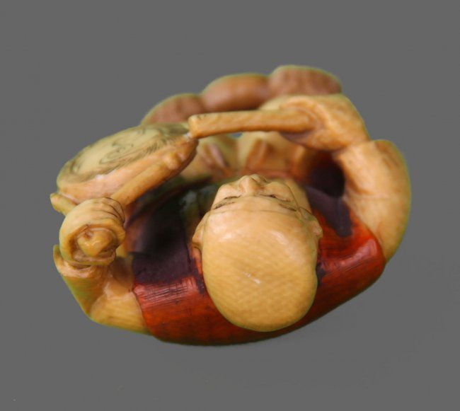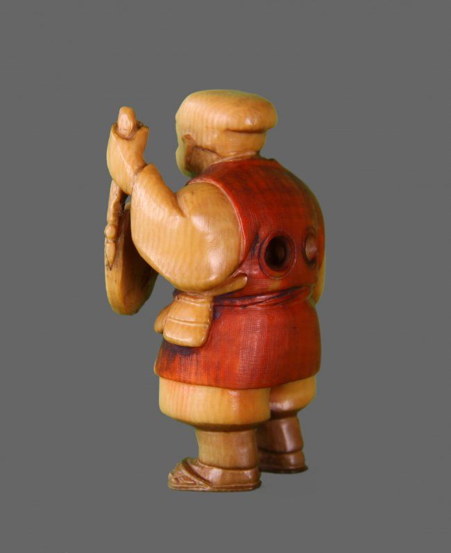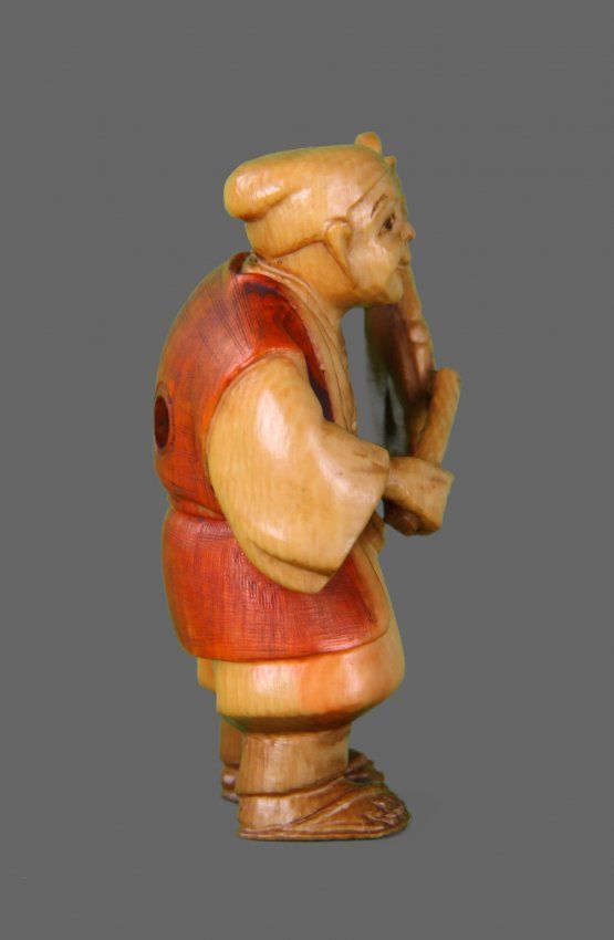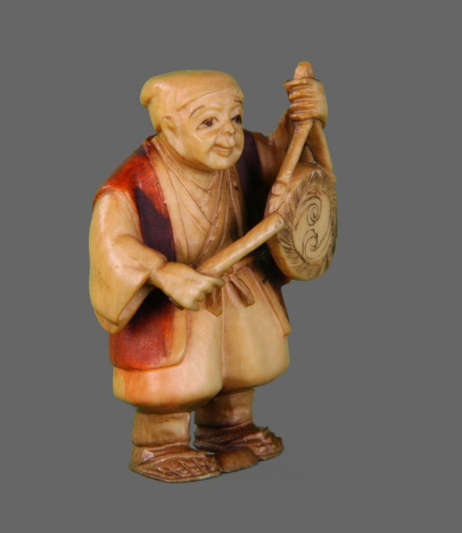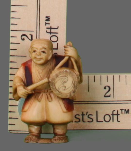 19th Century Ivory Netsuke, Man with Gong (Size: See Last Photo for Measurements)