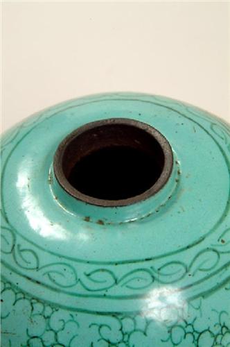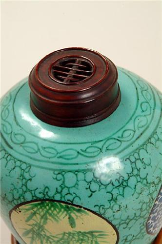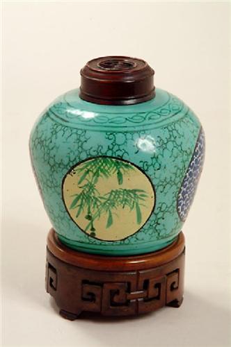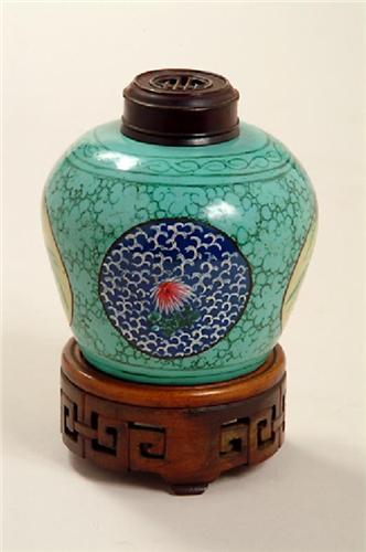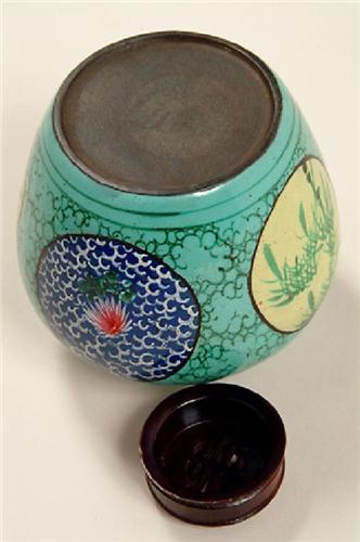 (Japan 19th Century) Blue background with green detailed paint and 4 alternating scenes within circles (one per side). 2 blue scenes with white scaling and a pink flower at the center, and 2 yellow scenes with green bamboo. Very good condition. Set on a wooden base with a cylindrical Blackwood lid, ¾” by 1 5/8”. Pot is 3 ¾” by 3 7/8” in diameter- tapers at base.