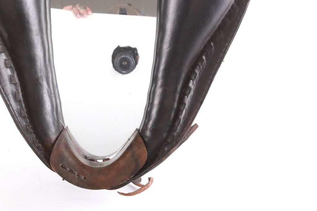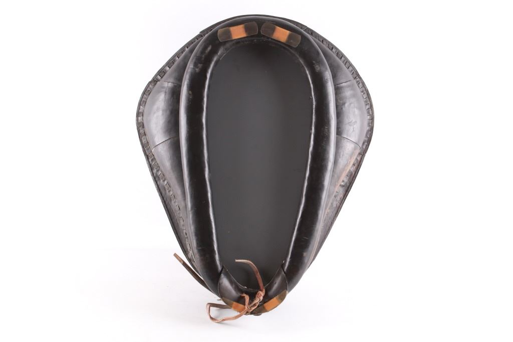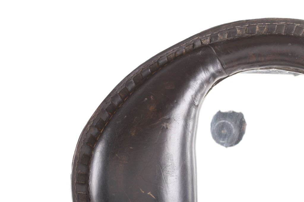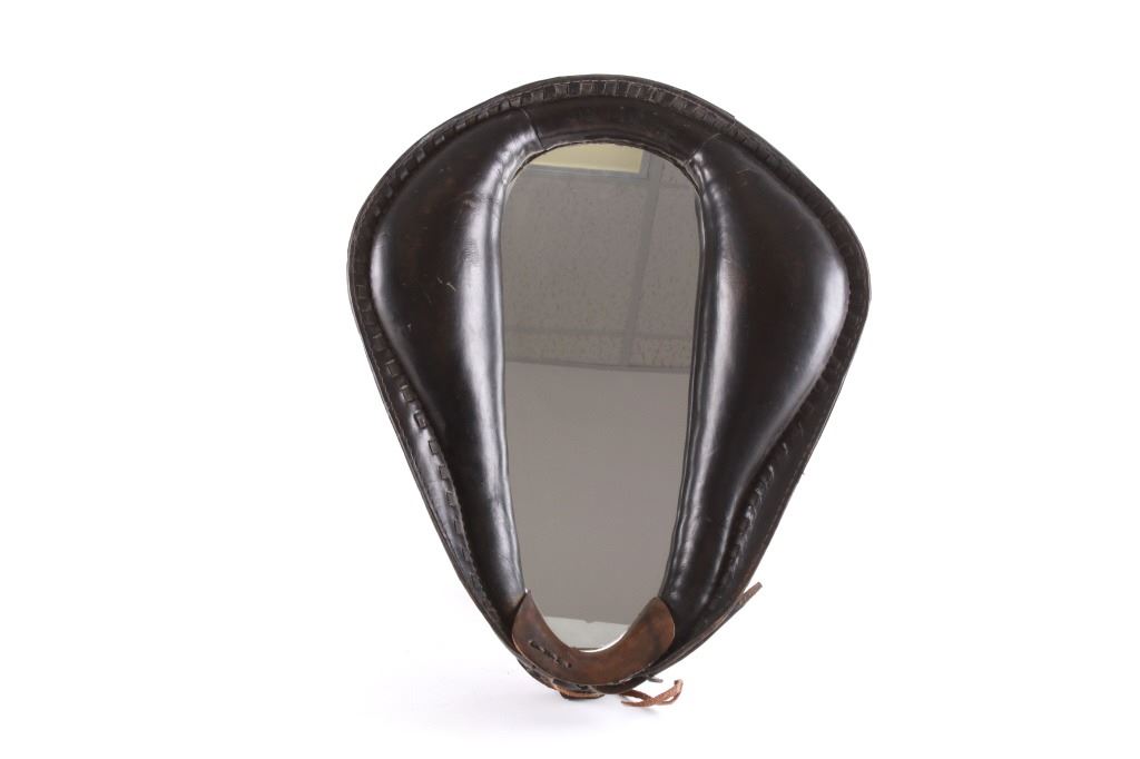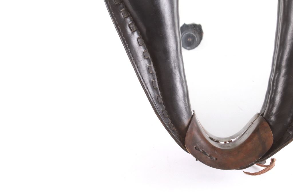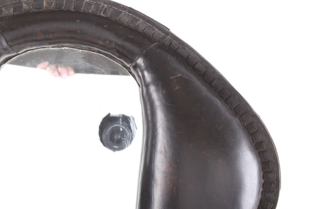 Featured in this lot is this leather padded yolk mirror circa 19th century. The yolk mirror features a wonderfully and professionally crafted padded leather construction that features a cut and fitted mirror set into the central compartment of the leather yolk. The yolk is marked 200 1/2 on the leaher strap. From the estate collection of Lloyd Kent and Phyllis DeVore passed owners of the historic DeVore’s Saddlery Helena, Montana. Helena Saddlery of Helena, MONT. Was founded in 1890 and was the predecessor to DeVore Saddlery. Upon Lloyd Kent DeVore’s (also referred to as L. Kent) college graduation he purchased his father Lloyd’s business, the Helena Saddlery and Tent on Lawrence Street, and renamed it DeVore’s Saddlery in circa 1950. Kent learned his craft from some local greats such as Jack Miller and George Hargrave who also worked for DeVore’s. Both L. Kent and his bride Phyllis have since passed away and these pieces are being offered by the family estate. The condition of this yolk mirror is good with no obvious signs of damage and shows good overall condition. The measurements of this yolk mirror is 22 1/4" x 18 1/2" x 4".