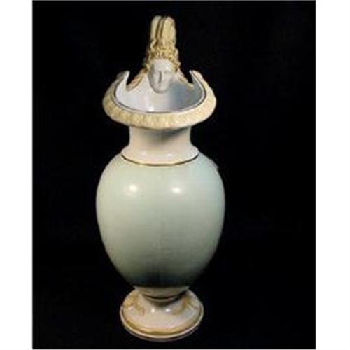 An unusual large ewer - possibly a wash jug. The beautiful handle has a face at the rear of the jug lip, and the handle is formed by her hair cascading in a loose plait down the side of the body. Very well detailed, with gilded highlights. Duck-egg blue body in a soft semi matt glaze, with gloss white above and below gilded bands. A loose tress of hair forms the decoration for the foot. The stylish spout is a thick decorated rim.