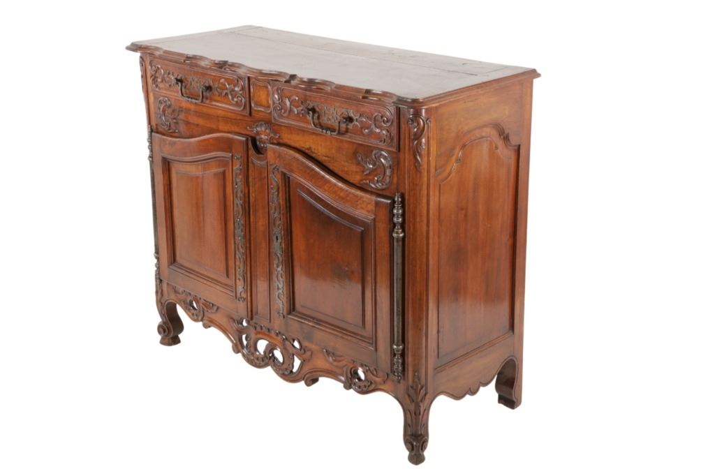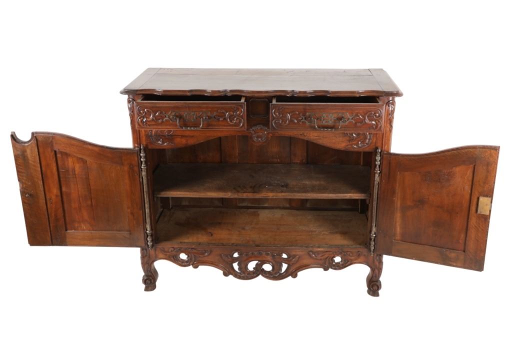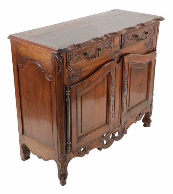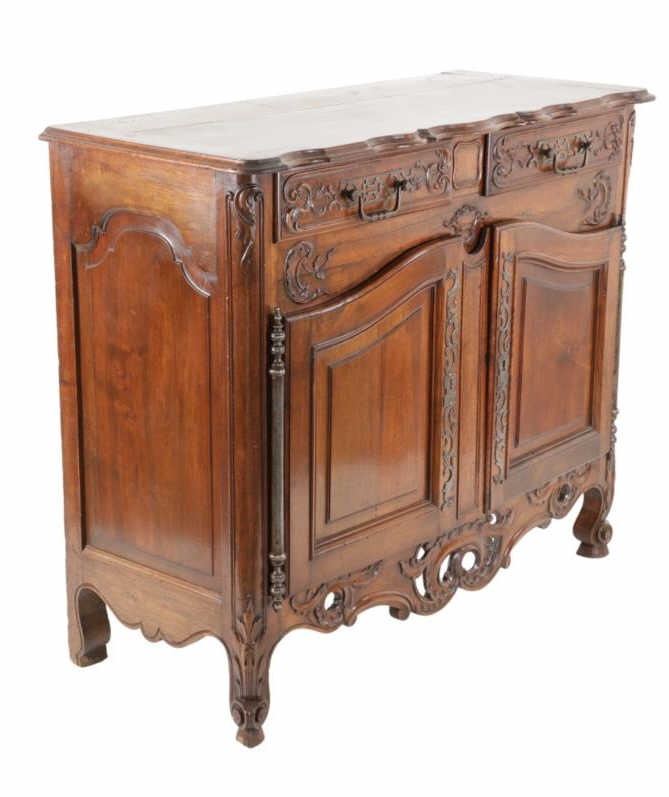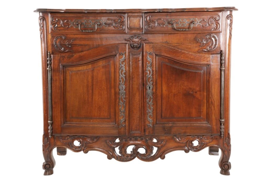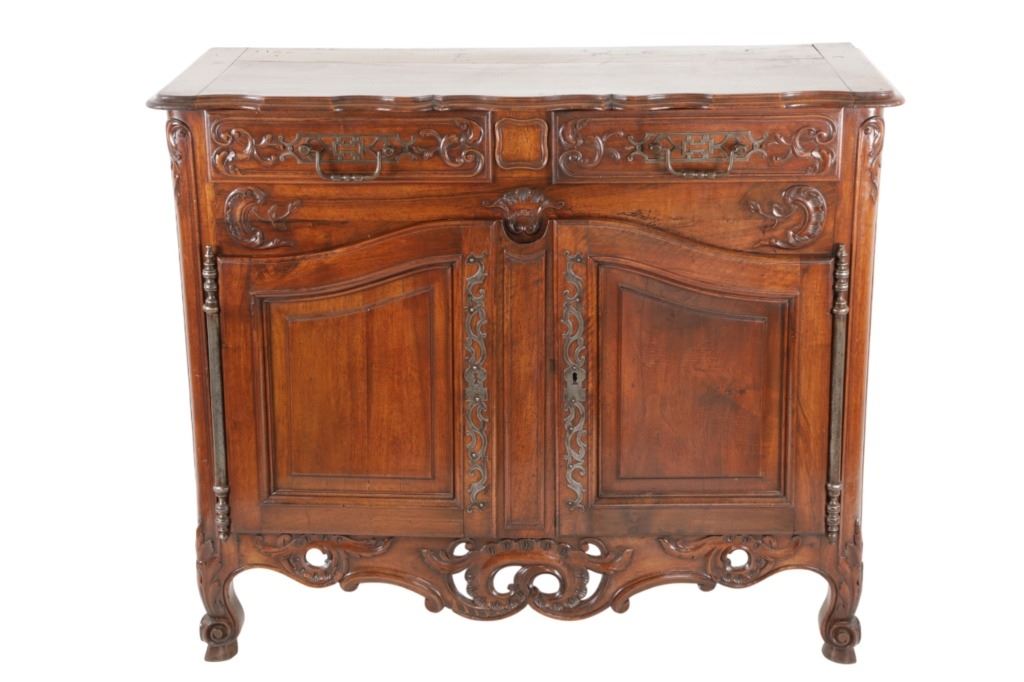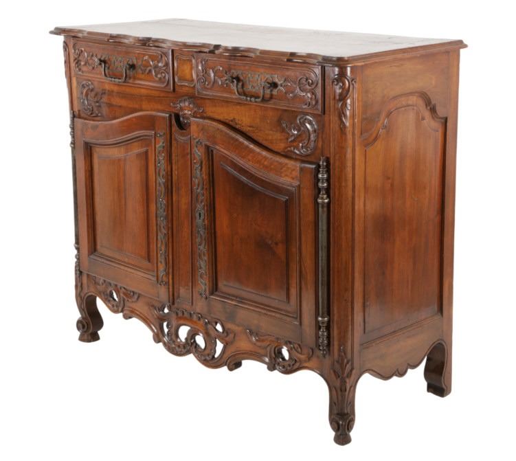 Presented in this lot is a 19th Century Louis XV Carved Walnut Two-door Buffet Sideboard. Features intricate carved detailing throughout, highlighting its craftsmanship and cultural heritage. When Louis XV, who reigned from 1715–74, focused royal life on the smaller salons of Versailles rather than its grand chambers, it transformed the aesthetics away from the imposing and angular furniture that characterized the style of Louis XIV. A broader focus on comfort and more delicate forms define antique Louis XV furniture, with nature-inspired carvings, wood inlays, curved cabriole legs, asymmetrical shapes and rounded oval seat backs. This elegant fruit wood buffet stands on short cabriole legs decorated with carved acanthus leaves at the shoulder, and ending with escargot feet. Two-board serpentine top and front, two drawers having extensive, fine carving over an elaborate carved and shaped acanthus leaves skirt apron with pierced cartouche, detailed heavy forged iron drawer pulls and matching pierced escutcheons hardware. The cabinet has two arched recessed paneled doors dressed with oversized iron hinges and large decorative openwork iron escutcheons; the doors with a stationary center panel, open to interior shelving for ultimate storage. Arched side panels are nicely carved. Excellent quality with superb craftsmanship, the buffet is in wonderfully preserved condition, nice finish to two-board top, nicely finished throughout. Measures 21.25"W x 50"L x 42"H and weighs 138 pounds.