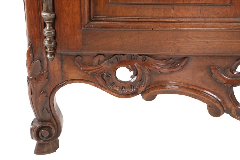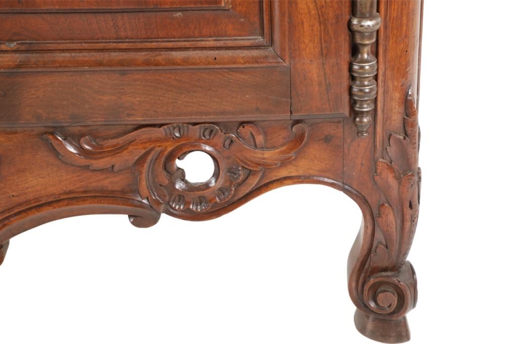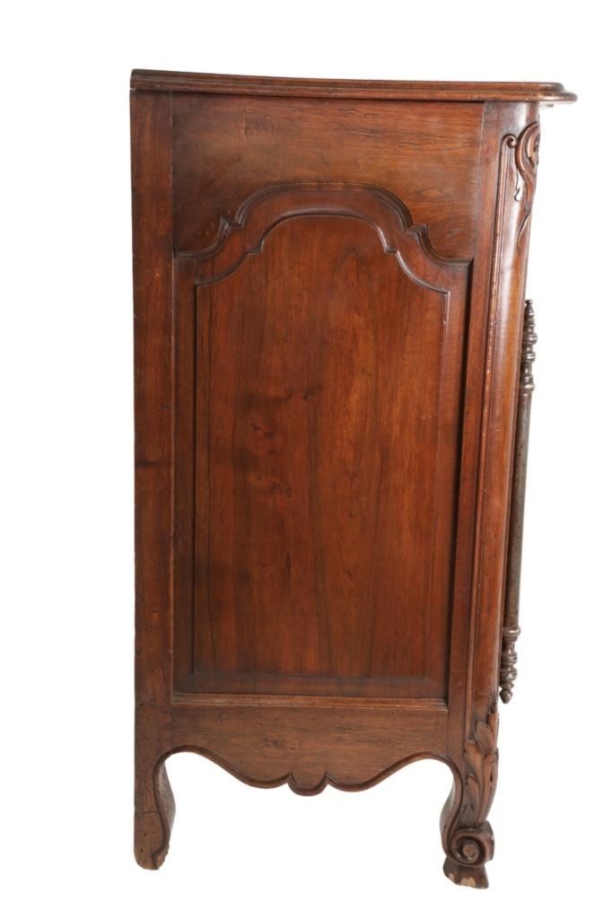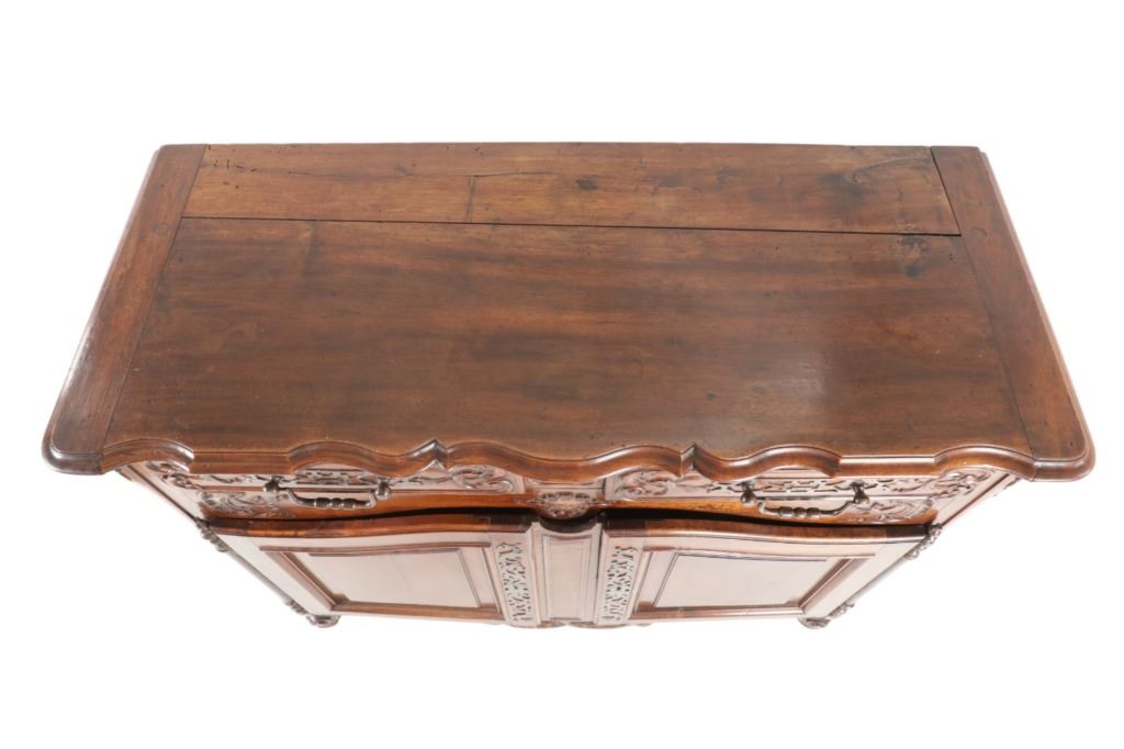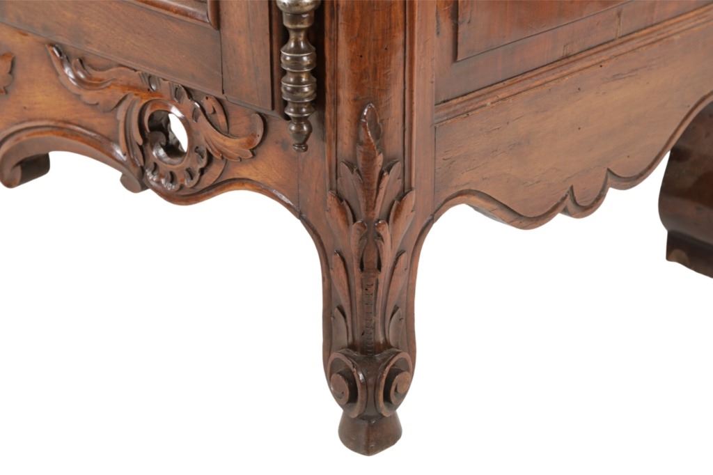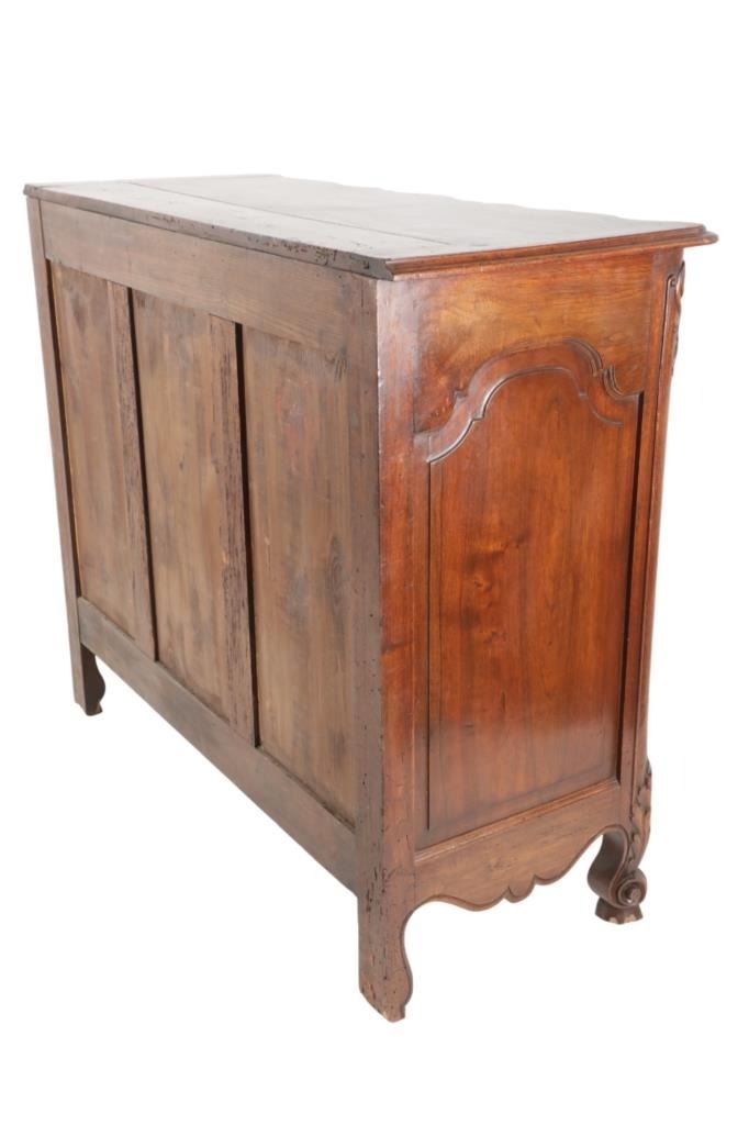 Presented in this lot is a 19th Century Louis XV Carved Walnut Two-door Buffet Sideboard. Features intricate carved detailing throughout, highlighting its craftsmanship and cultural heritage. When Louis XV, who reigned from 1715–74, focused royal life on the smaller salons of Versailles rather than its grand chambers, it transformed the aesthetics away from the imposing and angular furniture that characterized the style of Louis XIV. A broader focus on comfort and more delicate forms define antique Louis XV furniture, with nature-inspired carvings, wood inlays, curved cabriole legs, asymmetrical shapes and rounded oval seat backs. This elegant fruit wood buffet stands on short cabriole legs decorated with carved acanthus leaves at the shoulder, and ending with escargot feet. Two-board serpentine top and front, two drawers having extensive, fine carving over an elaborate carved and shaped acanthus leaves skirt apron with pierced cartouche, detailed heavy forged iron drawer pulls and matching pierced escutcheons hardware. The cabinet has two arched recessed paneled doors dressed with oversized iron hinges and large decorative openwork iron escutcheons; the doors with a stationary center panel, open to interior shelving for ultimate storage. Arched side panels are nicely carved. Excellent quality with superb craftsmanship, the buffet is in wonderfully preserved condition, nice finish to two-board top, nicely finished throughout. Measures 21.25"W x 50"L x 42"H and weighs 138 pounds.