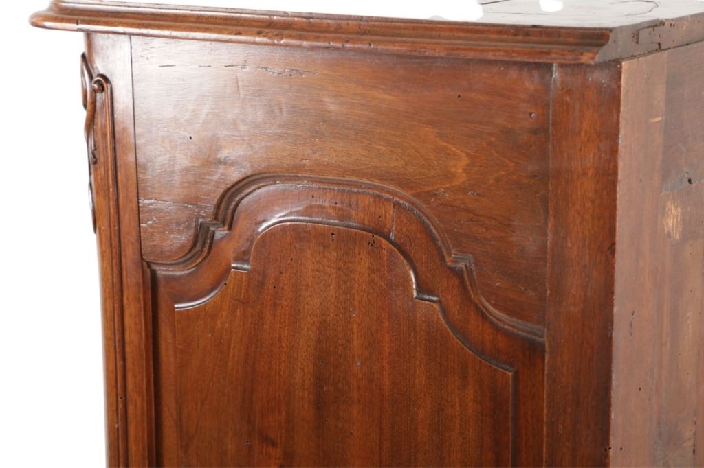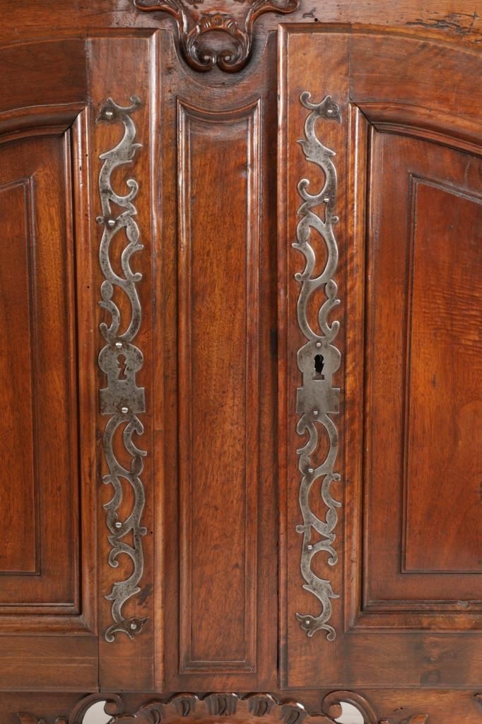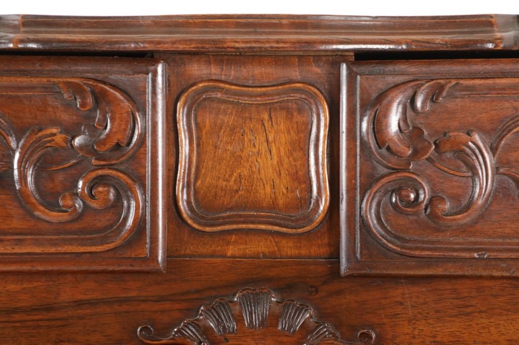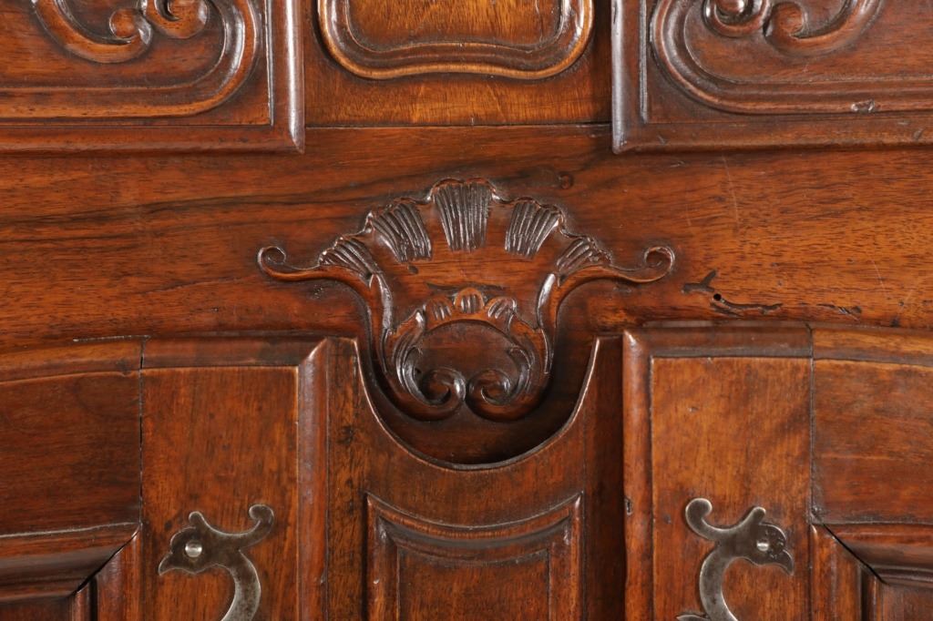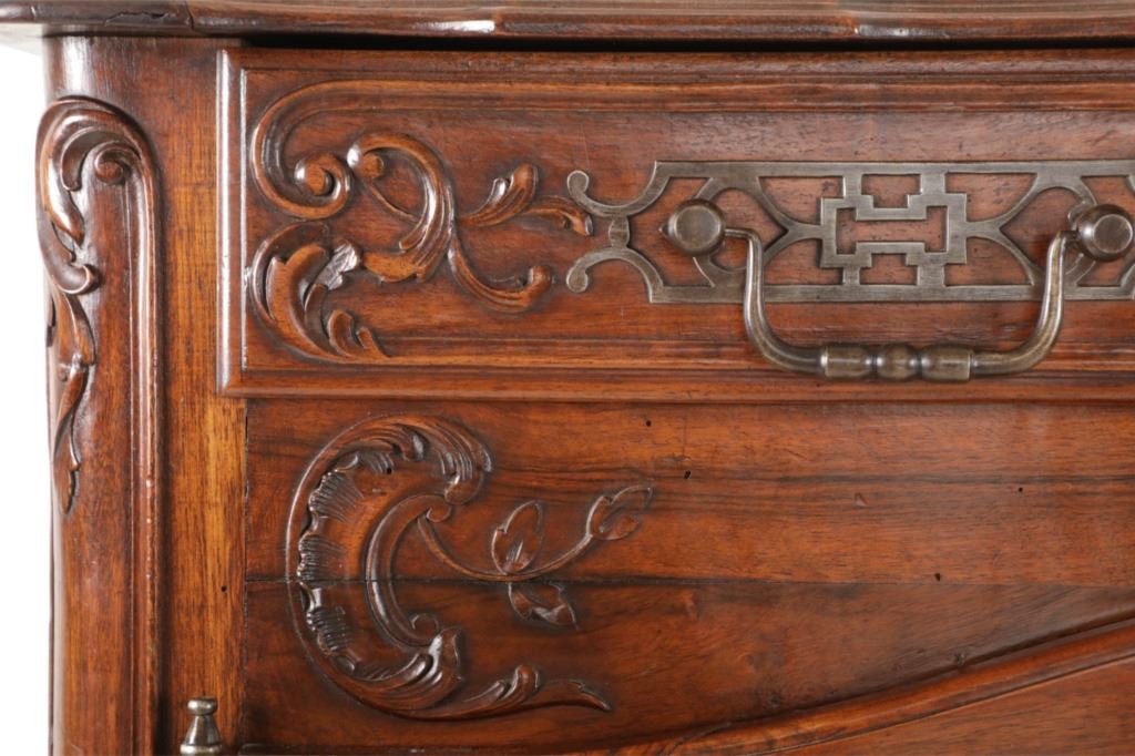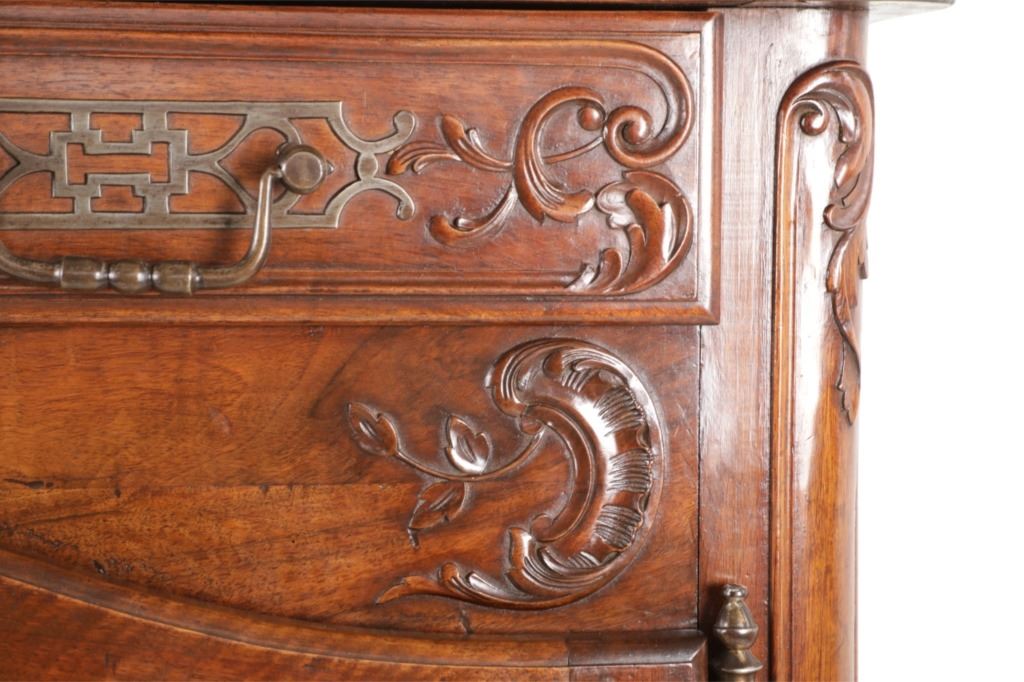 Presented in this lot is a 19th Century Louis XV Carved Walnut Two-door Buffet Sideboard. Features intricate carved detailing throughout, highlighting its craftsmanship and cultural heritage. When Louis XV, who reigned from 1715–74, focused royal life on the smaller salons of Versailles rather than its grand chambers, it transformed the aesthetics away from the imposing and angular furniture that characterized the style of Louis XIV. A broader focus on comfort and more delicate forms define antique Louis XV furniture, with nature-inspired carvings, wood inlays, curved cabriole legs, asymmetrical shapes and rounded oval seat backs. This elegant fruit wood buffet stands on short cabriole legs decorated with carved acanthus leaves at the shoulder, and ending with escargot feet. Two-board serpentine top and front, two drawers having extensive, fine carving over an elaborate carved and shaped acanthus leaves skirt apron with pierced cartouche, detailed heavy forged iron drawer pulls and matching pierced escutcheons hardware. The cabinet has two arched recessed paneled doors dressed with oversized iron hinges and large decorative openwork iron escutcheons; the doors with a stationary center panel, open to interior shelving for ultimate storage. Arched side panels are nicely carved. Excellent quality with superb craftsmanship, the buffet is in wonderfully preserved condition, nice finish to two-board top, nicely finished throughout. Measures 21.25"W x 50"L x 42"H and weighs 138 pounds.