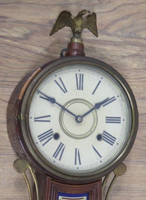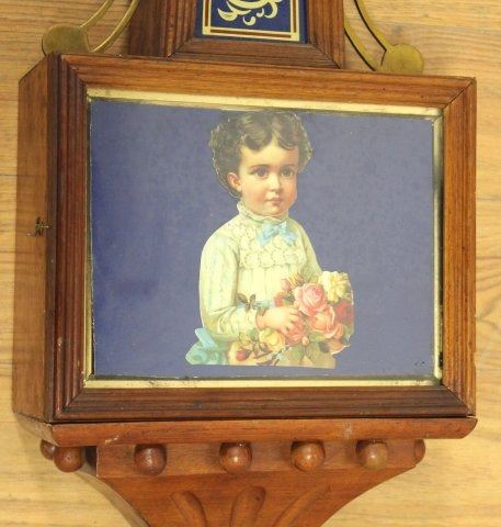 With brass eagle atop. Reverse-painted floral center of clock. Picture of child holding flowers affixed to inside of bottom. With pendulum. Approx. 40" H. (6055)