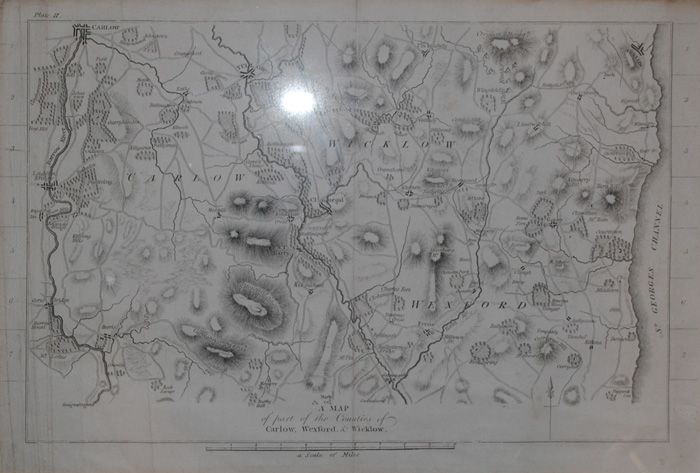 Framed Irish map taken from a publication marked Plate II and titled "A Map of the Counties of Carlow, Wexford and Wicklow.