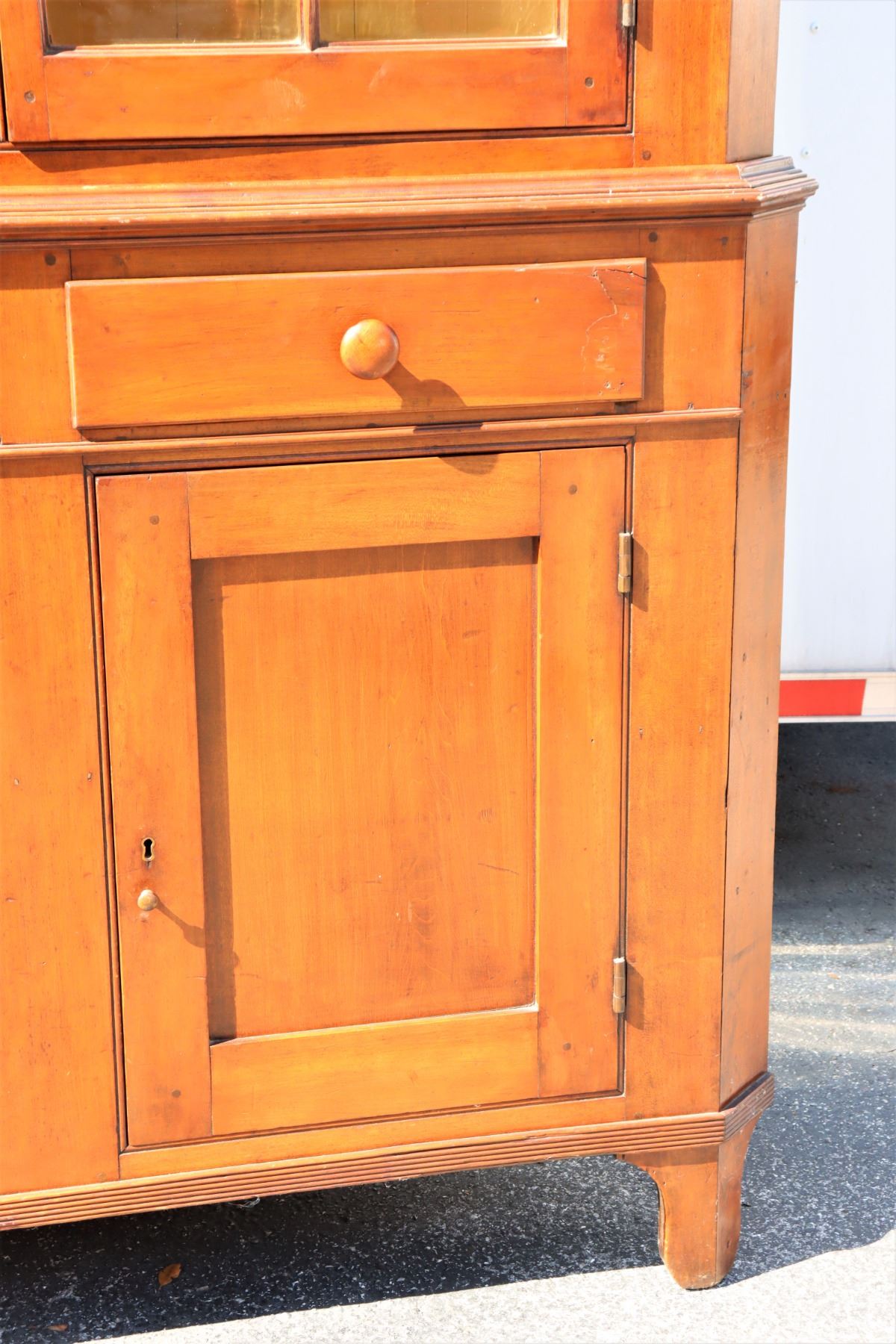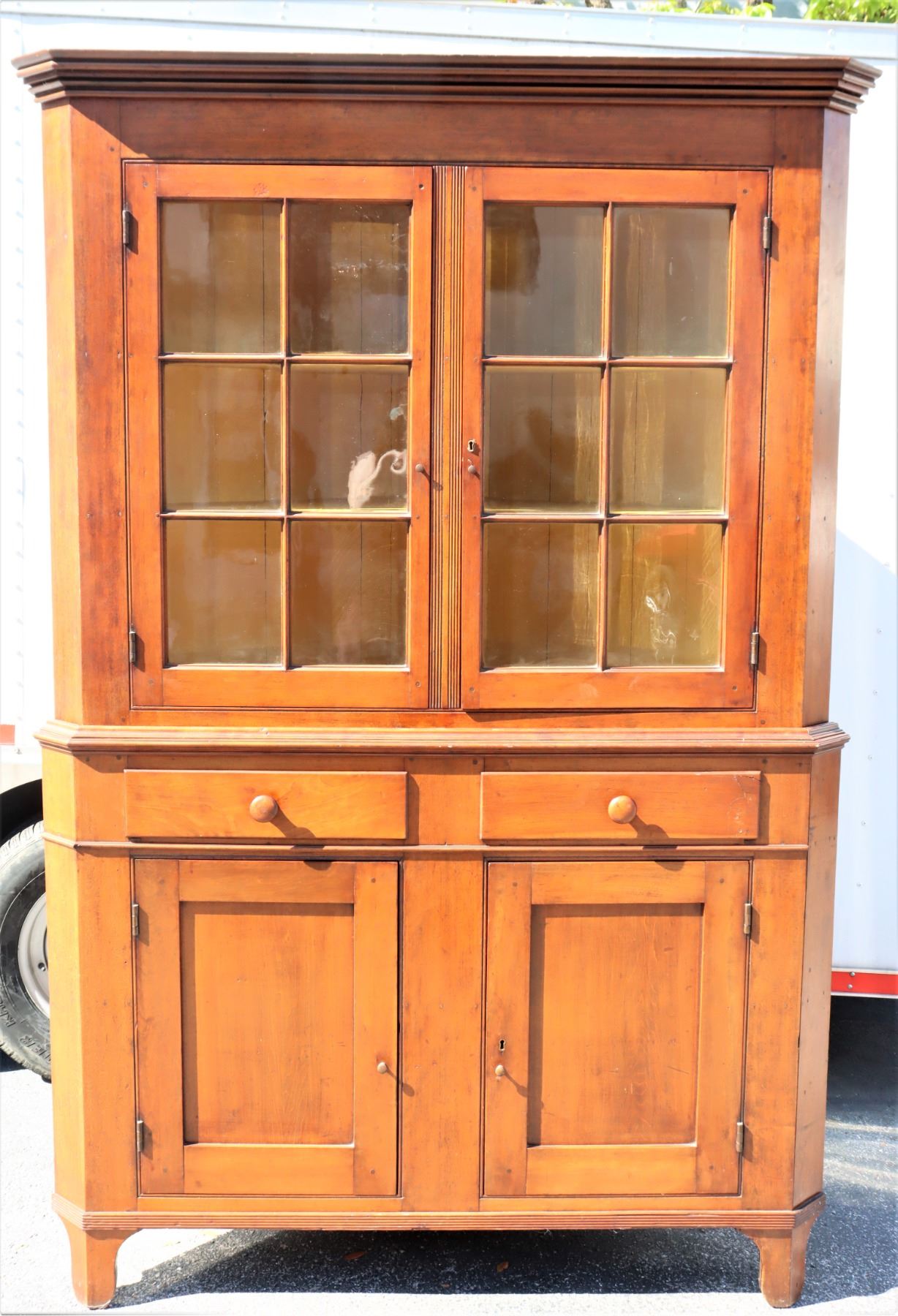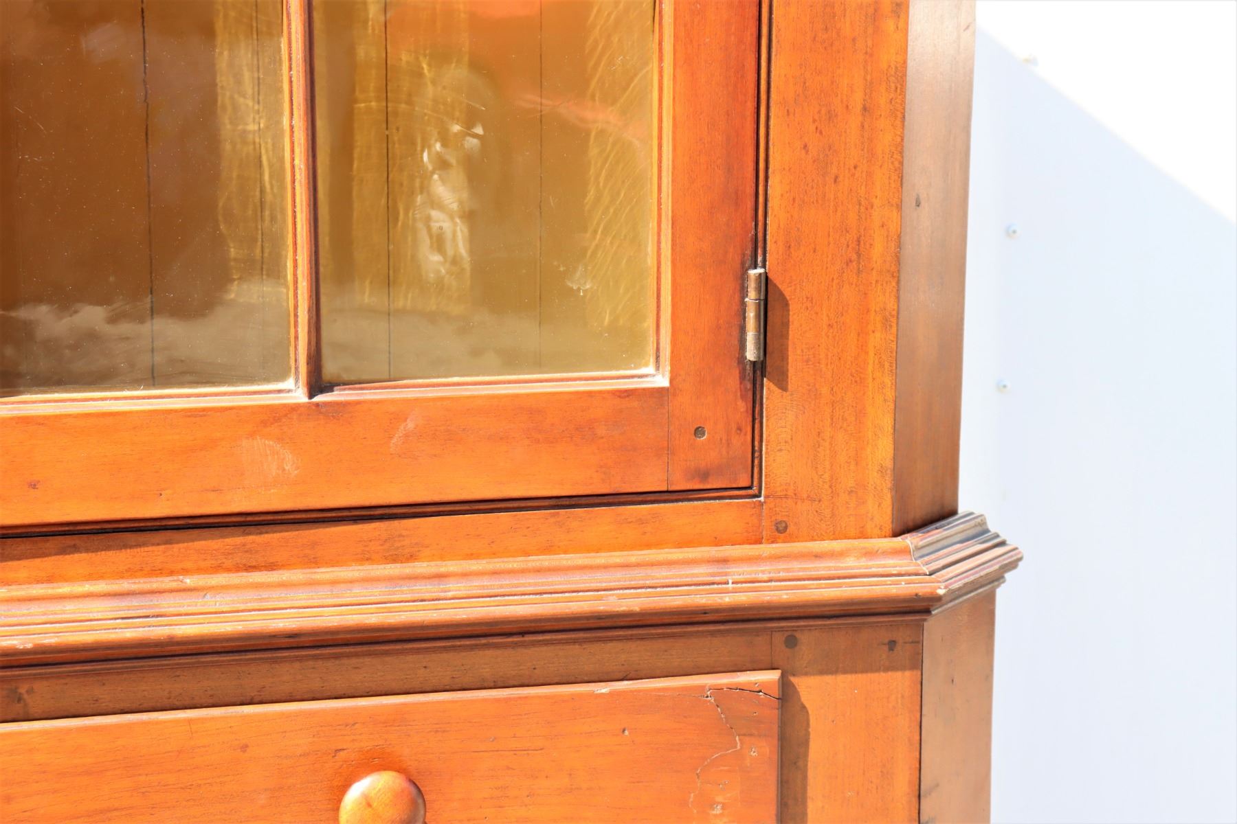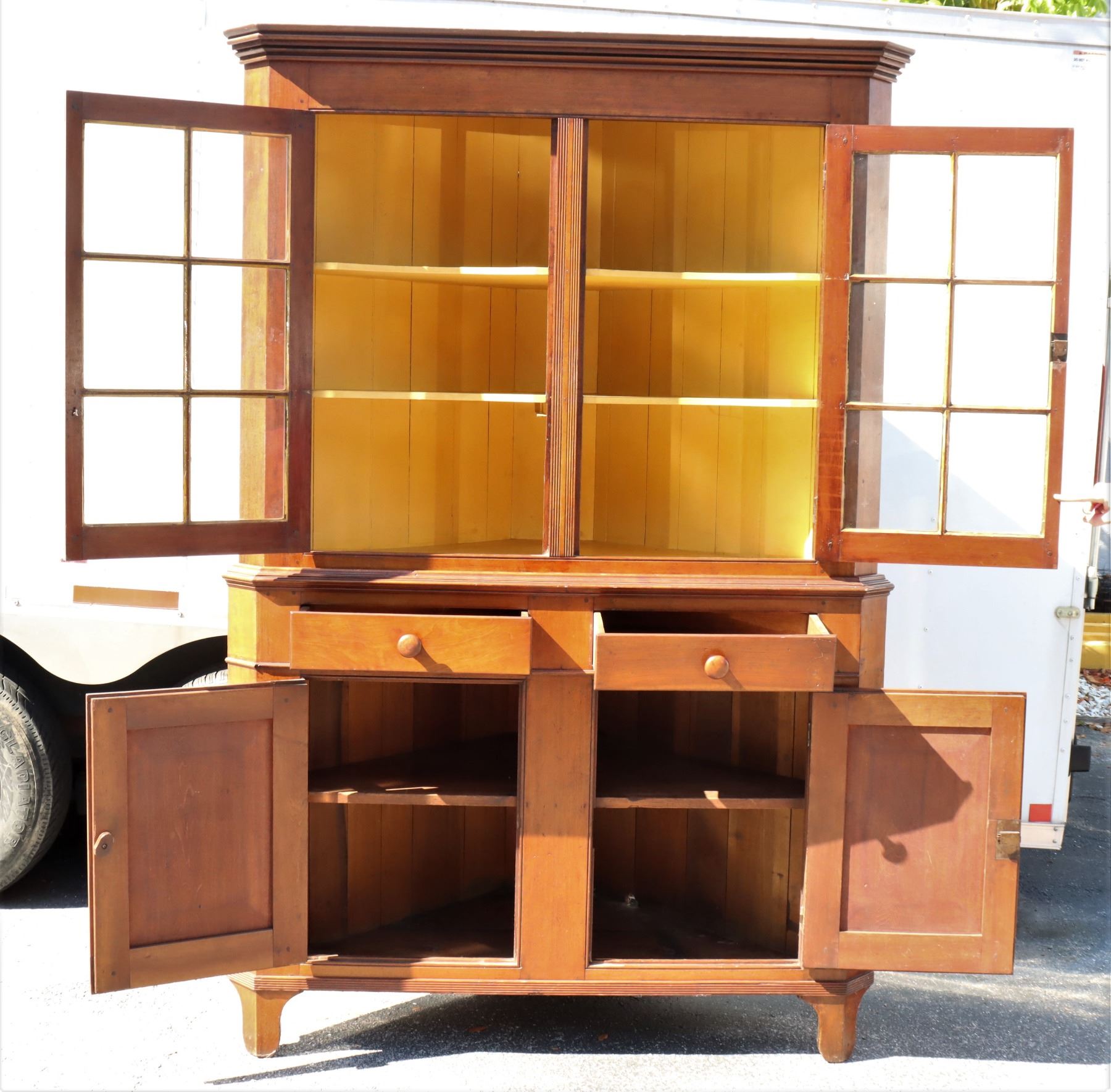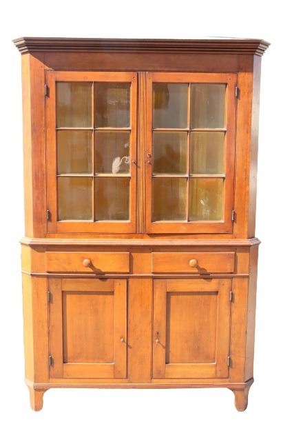 19th Century Maple Corner Cabinet, upper half with glass cabinets, two layers of shelving. Bottom half with two drawers and closed cabinet. Some damage to wood near back base, see photo #14.