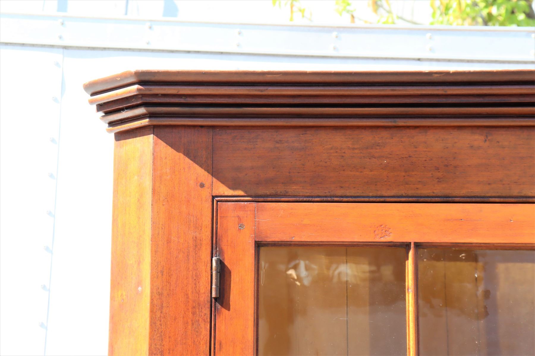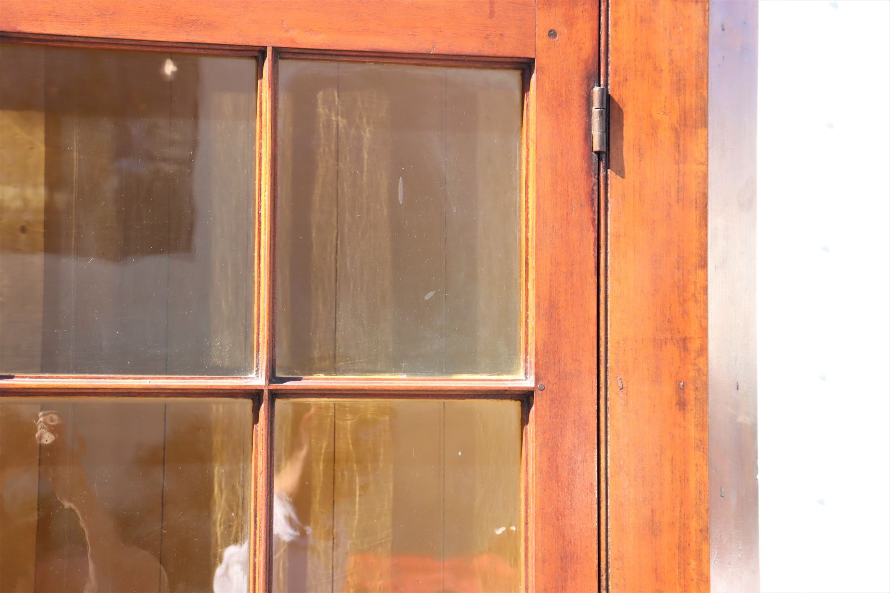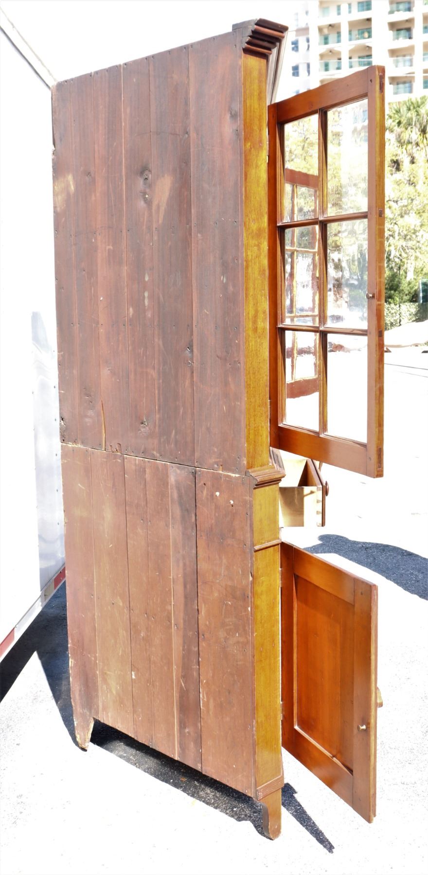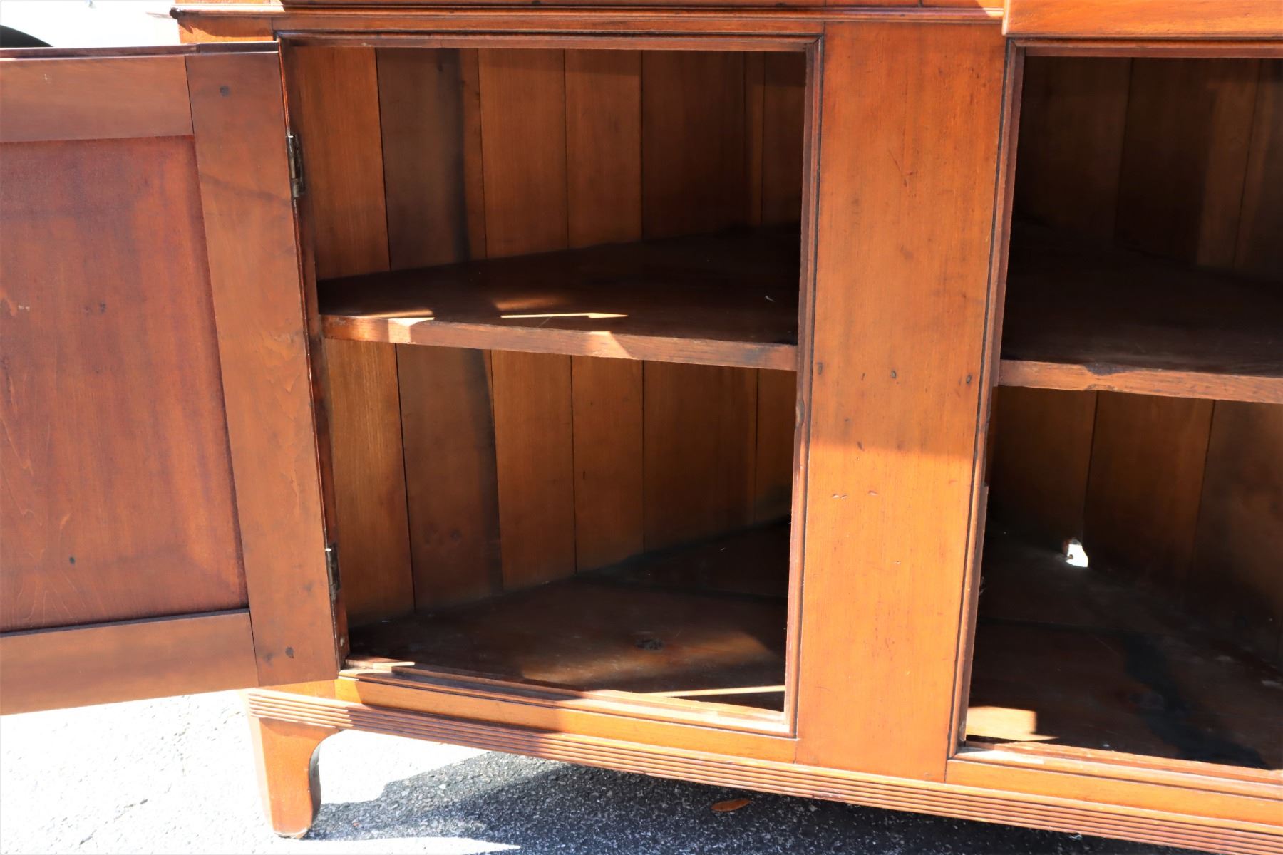 19th Century Maple Corner Cabinet, upper half with glass cabinets, two layers of shelving. Bottom half with two drawers and closed cabinet. Some damage to wood near back base, see photo #14.