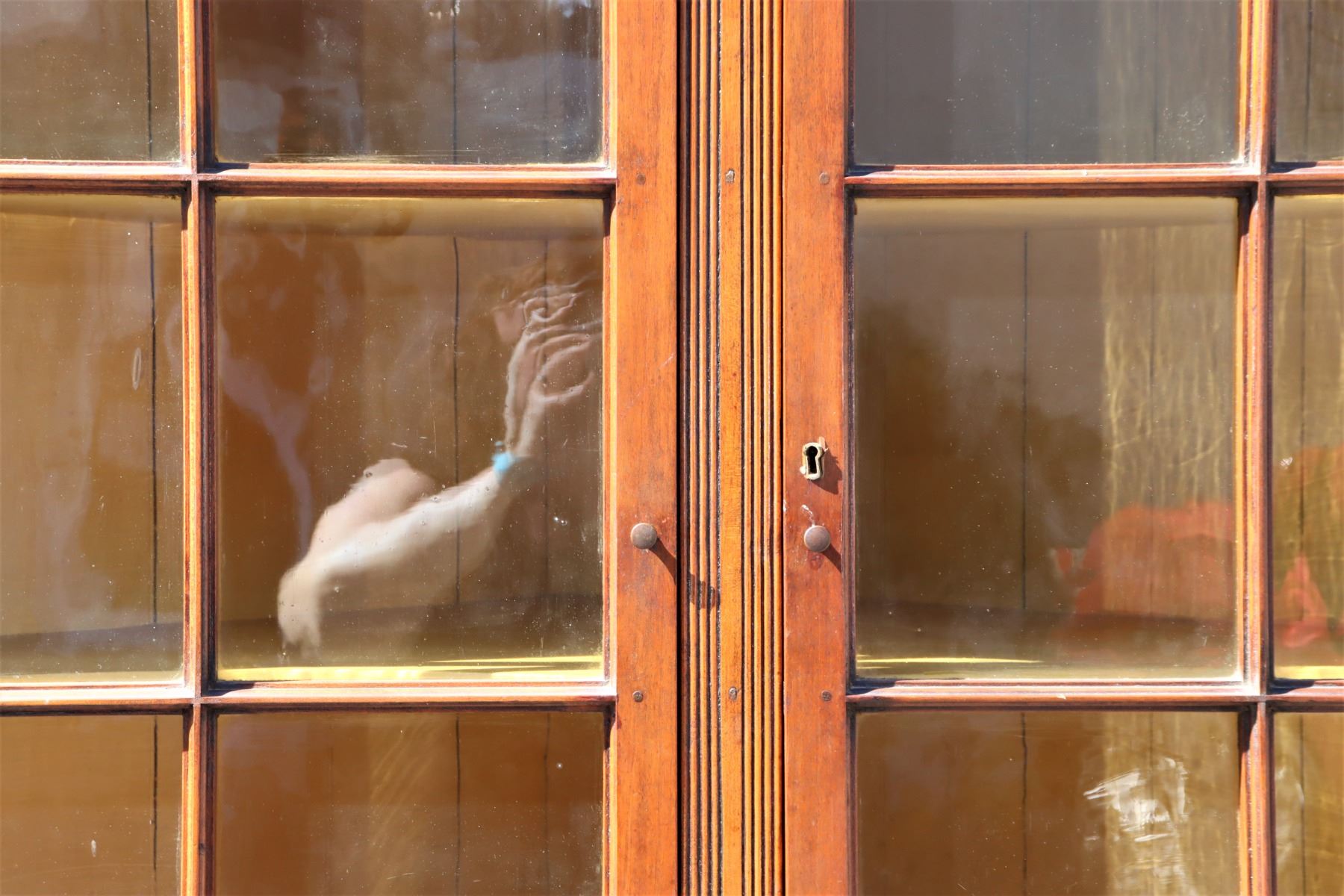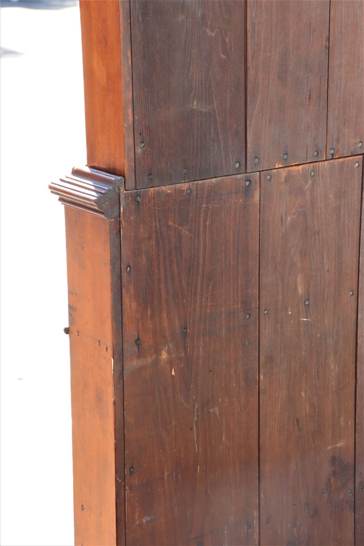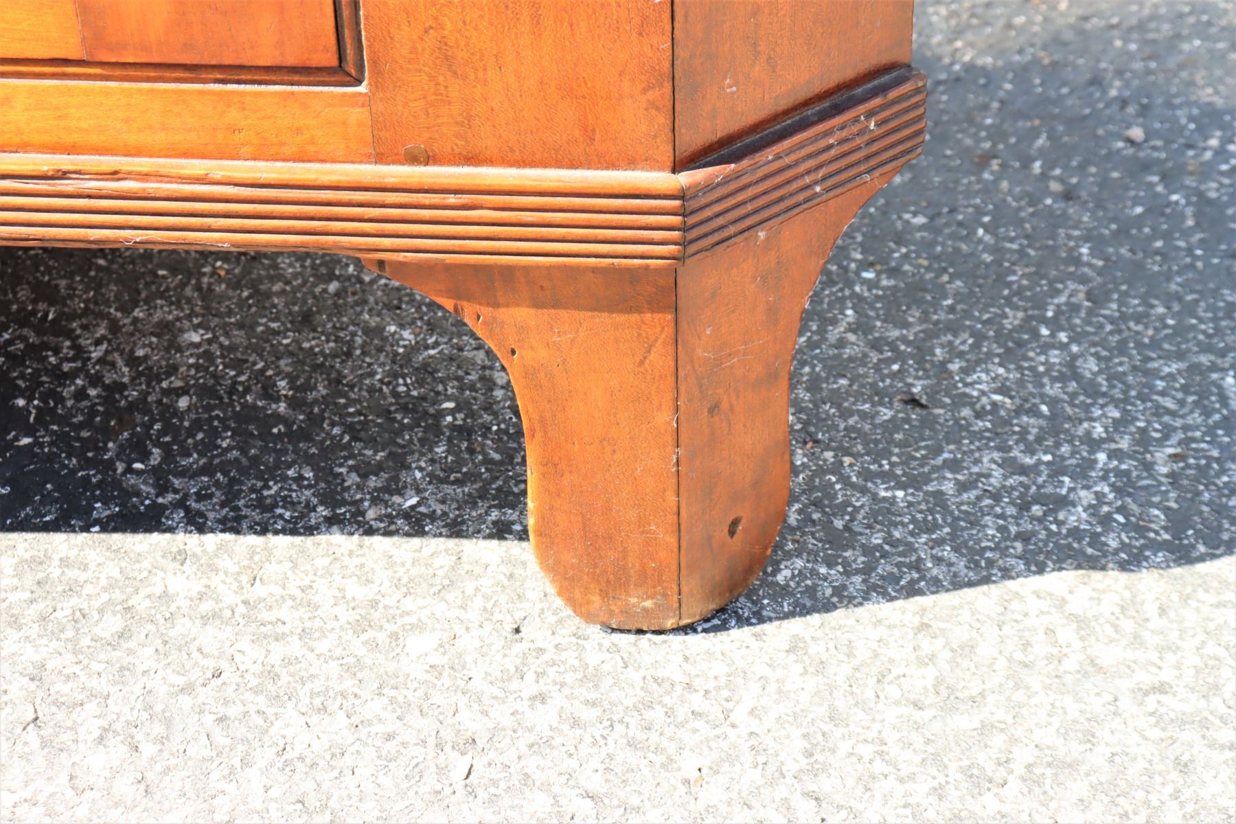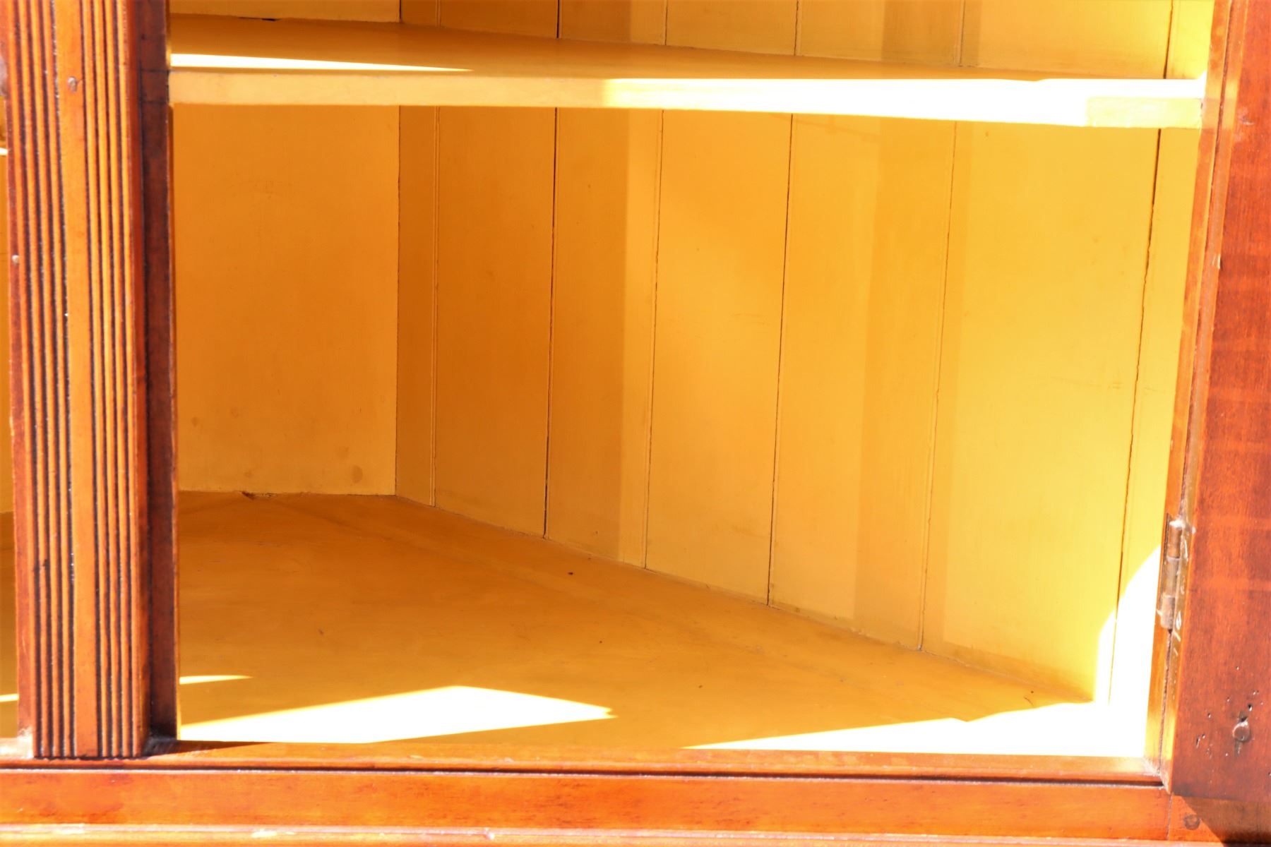 19th Century Maple Corner Cabinet, upper half with glass cabinets, two layers of shelving. Bottom half with two drawers and closed cabinet. Some damage to wood near back base, see photo #14.