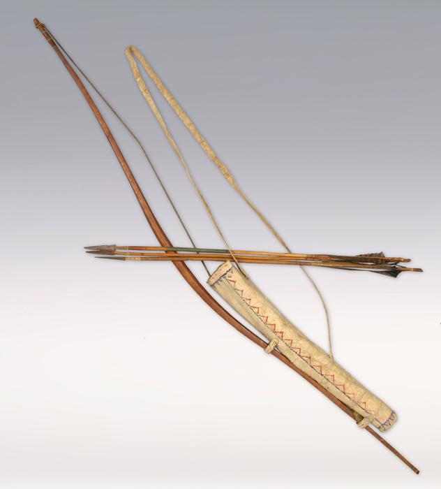 19th Century Mesquakie Quiver With Three Original Iron Tipped Arrows and Bow. Parfleche quiver is 18 1/4" and nicely painted. Arrows are 25 1/2" long. Recurve wood bow is 47" long. Extremely rare. Obtained from the Blackpipe Collection in South Dakota. Condition Report: Bow is in extremely fine condition with original bow string. Parfleche case is fine showing use. Paint is 90% intact. Arrows are painted. Original iron trade tips are in fine condition.