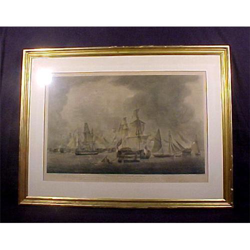 This is an absolutely outstanding museum quality hand tinted engraving ? entitled Victory of Trafalgar in the Rear. Published London 1843 by J. W. Laird 1 Leadenluill Street. In fancy script written under the title is this caption about what this view is, it reads - This view of the total defeat of the combined fleets of France and Spain with the tenders of the British fleet saving their conquered enemies from the flames of their own vessel. (L. Achille a French 74) is most respectfully inscribed to the Right Hon. ble Lord Collingwood, the several Captains, Officers, Seamen, and Marines of his Division ? by their Devoted Servant ? Rob Dodd. This picture also states that it is painted and engraved by R Doddand that this engraving is plate 4. The overall condition is quite spectacular in this engraving having only 3 little acid burned spots in the paper. It is housed in a truly wonderful carved wood and gold gilded frame and professionally mated. The detail as you can only imagine is truly exquisite in this action packed picture. Overall it measures 37 ¾? x 28 5/8? and the sight size is 29? x 19 ½?.