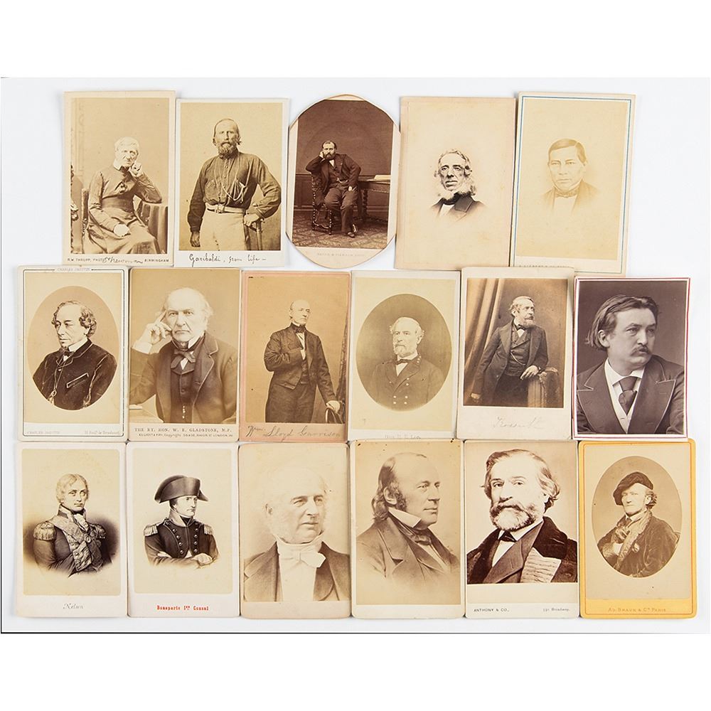 Group of 17 carte-de-visite portraits of noteworthy figures of the 19th century, including a combination of real photographs and images of artworks portraying the notables. Subjects include: Richard Wagner, Giuseppe Verdi, Peter Cooper, Charles Gounod, William E. Gladstone, Benito Juarez, Giuseppe Garibaldi, Benjamin Disraeli, William Lloyd Garrison, Louis Agassiz, Cardinal John Henry Newman, Gustave Dore, Lajos Kossuth, Cornelius Vanderbilt, Napoleon Bonaparte (illustration), Robert E. Lee (illustration), and Horatio Nelson (illustration). In overall fine condition, with clipped corners to the Gounod photo.