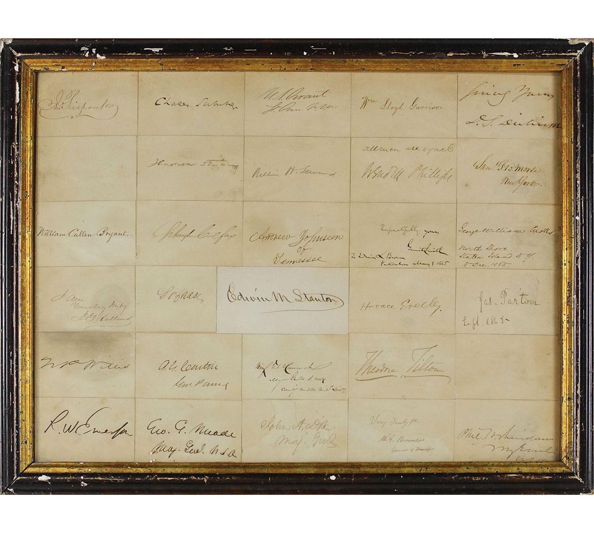 Thirty ink signatures on individual cards, each approximately 3 x 2, affixed to a backing and framed to an overall size of 18 x 13.5. Signers are: Ralph Waldo Emerson, Andrew Johnson, U. S. Grant, Samuel F. B. Morse, Philip Sheridan, John Pierpont, Charles Sumner, William Lloyd Garrison, Daniel S. Dickinson, John Greenleaf Whittier, Thaddeus Stevens, William Seward, Wendell Phillips, William Cullen Bryant, Schuyler Colfax, Gerrit Smith, George William Curtis, Josiah Gilbert Holland, Salmon P. Chase, Edwin M. Stanton, Horace Greeley, James Parton, Nathaniel Parker Willis, Andrew Curtin, Winfield Scott Hancock, Theodore Tilton, Fitz-Greene Halleck, George G. Meade, John Adams Dix, and William Gannaway Brownlow. In overall very good condition, with scattered toning and soiling, and Whittier and Halleck signatures extremely light and only somewhat visible. A highly desirable group that features a unique combination of influential 19th century figures.