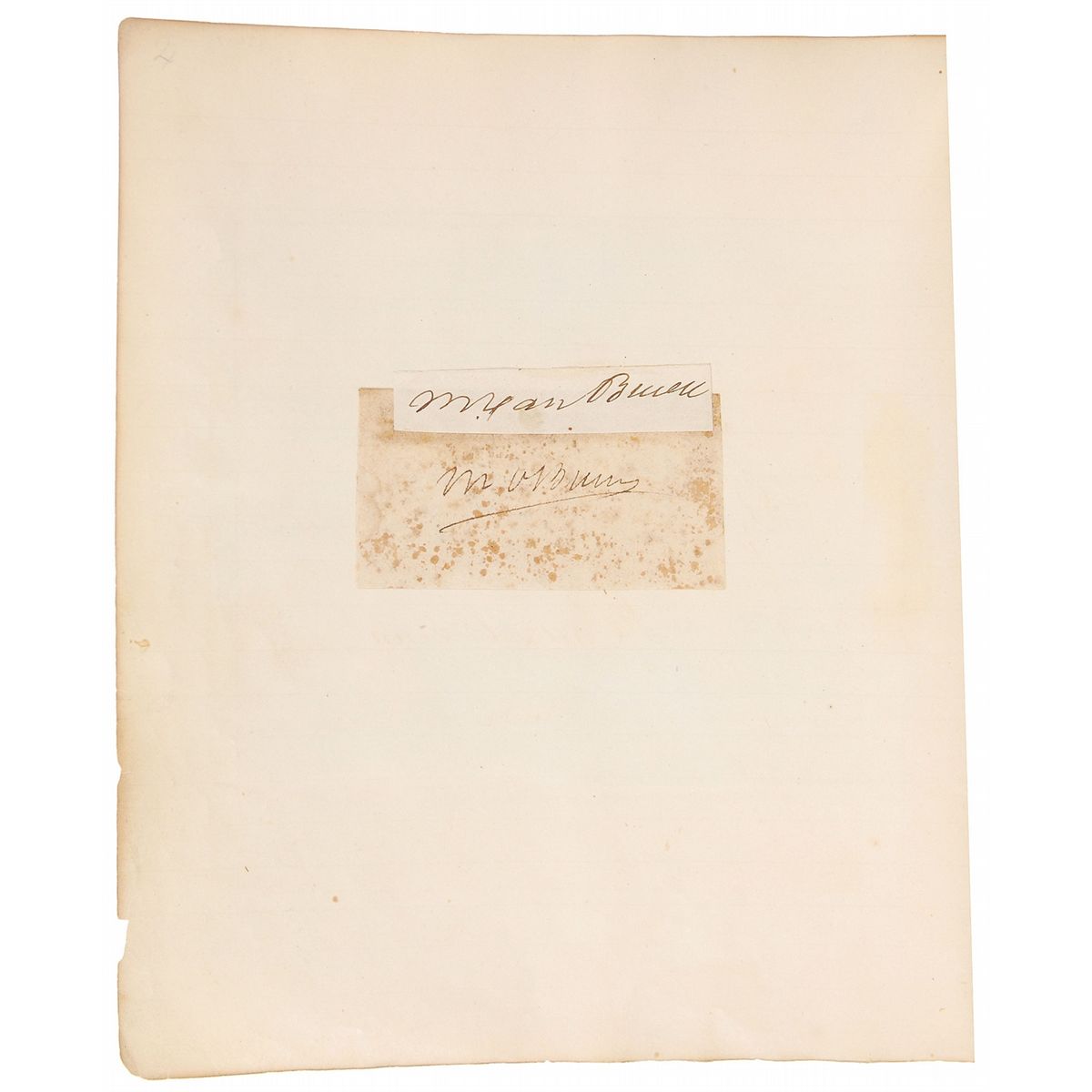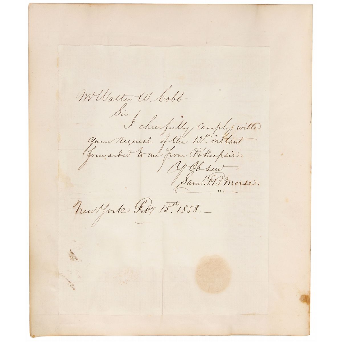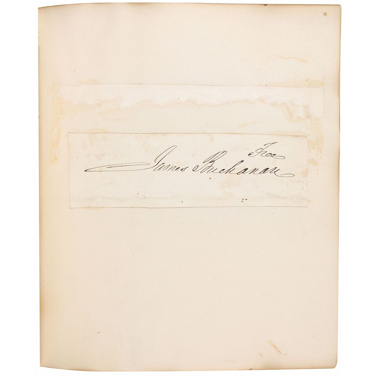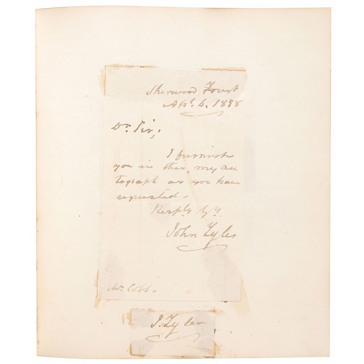 Extraordinary autograph book compiled by of Walter W. Cobb, a member of the Illinois House of Representatives from Franklin County, 7 x 8, containing over 125 autograph items of various formats affixed within, signed by some of the most important and influential figures of the 19th century, including: John Tyler (ANS and signature), James Buchanan (free frank signature), John Quincy Adams (signature), Franklin Pierce (signature), Millard Fillmore (signature), Martin Van Buren (two signatures), Sam Houston (signature), Jefferson Davis (signature), John C. Breckenridge (ANS), Nathaniel P. Banks (ANS), Stephen A. Douglas (ANS) Samuel F. B. Morse (ANS), James Lawrence Orr (ANS), Roger B. Taney (ANS), Matthew F. Maury (ANS), James Fenimore Cooper (signature), Washington Irving (signature), Louis Agassiz (signature), Charles Sumner (AQS), Henry William Herbert (ANS), John B. Floyd (signature), William Seward (ANS), John K. Kane (AQS), John Abbott (ANS), John Scott Harrison (ANS), Sarah Hopkins Bradford (ALS), Henry A. Wise (ANS), Elihu Burritt (AQS), George Bancroft (ALS), Preston King (ANS with wax seal), John Ellis Wool (ALS), Roscoe Conkling (ALS and signature), Emma Willard (AQS), William H. DeLancey (signature), Fitz-Green Halleck (ANS), Oliver Wendell Holmes, Sr. (ANS), Henry Wilson (signature), Hannibal Hamlin (AQS), Jared Sparks (signature), William Cullen Bryant (signature), Mary Jane Holmes (two ANS), James Lloyd Breck (ANS), Washington Hunt (signature), Hamilton Fish (signature), Horace Greeley (signature), Bayard Taylor (ANS and signature), Lyman Trumbull (signature), Dewitt Clinton (signature), William B. Sprague (ALS), William M. Gwinn (signature), Edward Everett (signature), Horatio Potter (ALS), Horatio Seymour (ANS), Theodore Parker (ANS), Robert Charles Winthrop (ANS), Henry Grinnell (ANS), George Williams (signature), George D. Prentice (signature), Abner Jackson (ANS), Park Benjamin, Sr. (signature), Benjamin Hale (signature), William Buell Sprague (ANS), George William Curtis (signature), Lydia Huntley Sigourney (signature), and more than sixty others. In overall very good to fine condition, with scattered toning and rippling to various sheets and slips from adhesive to reverse, and the binding separated from the book with many loose pages. A comprehensive and exceptional compilation of 19th-century notables.