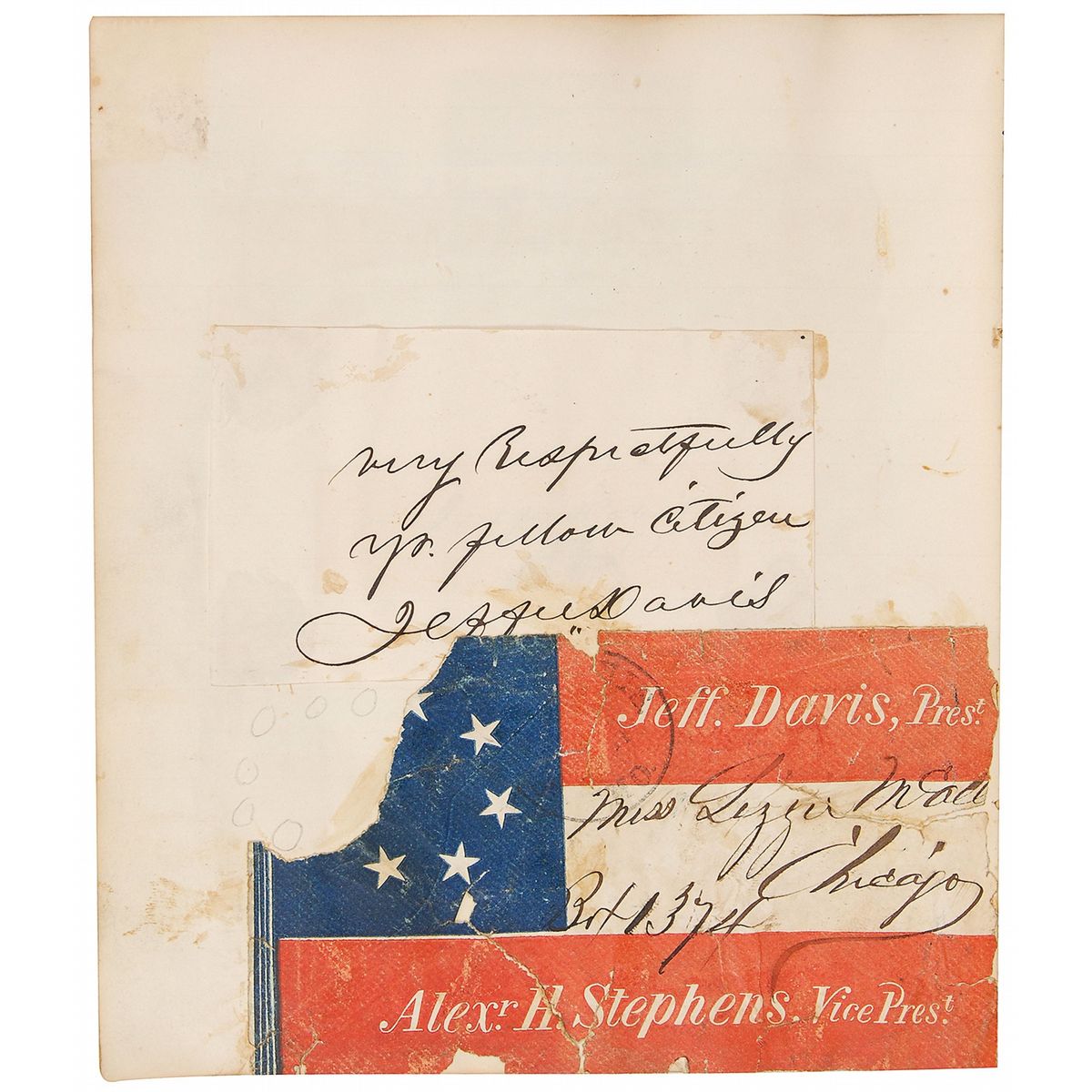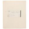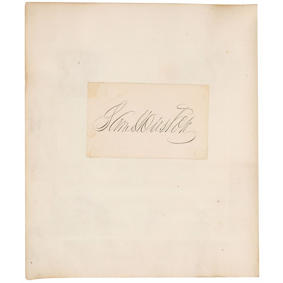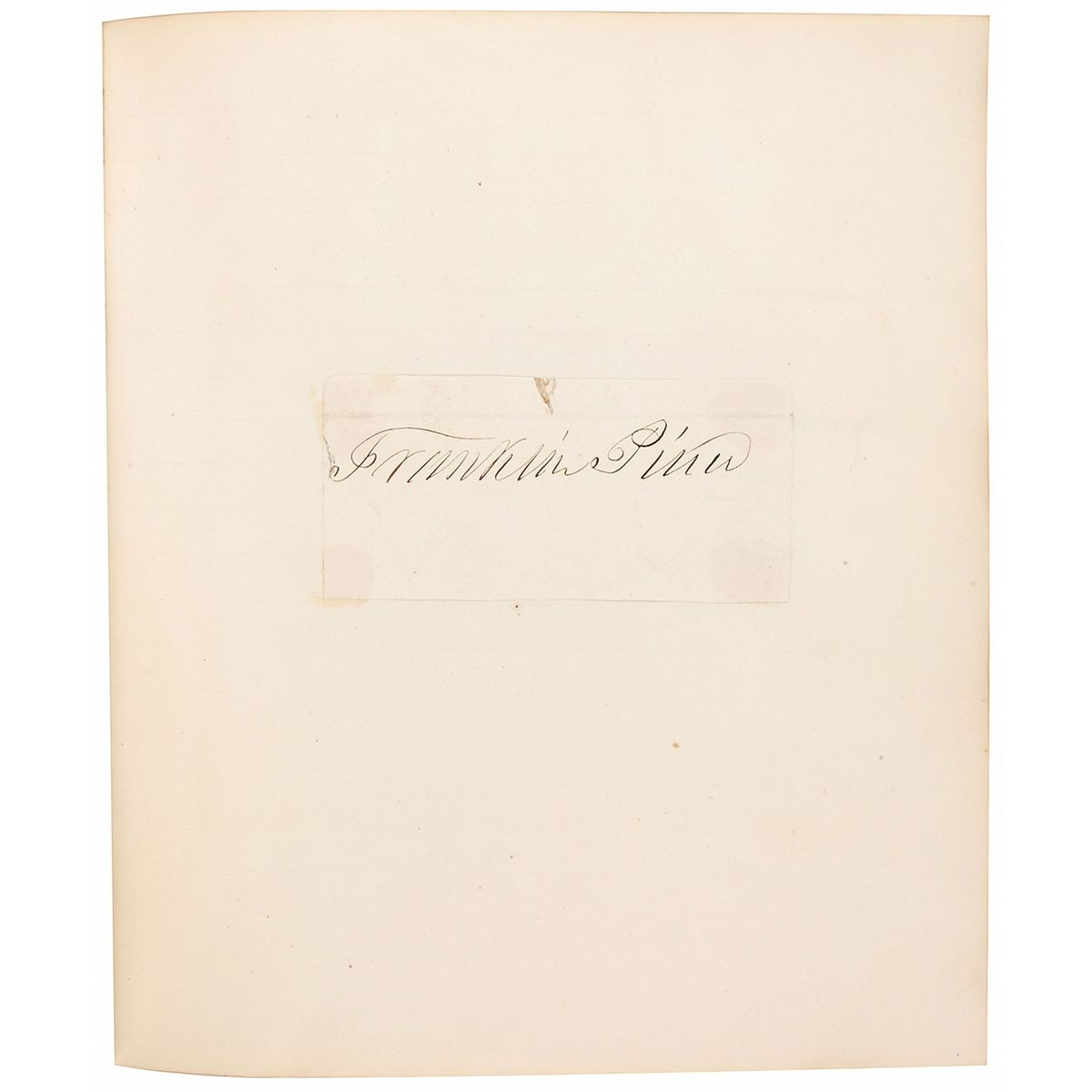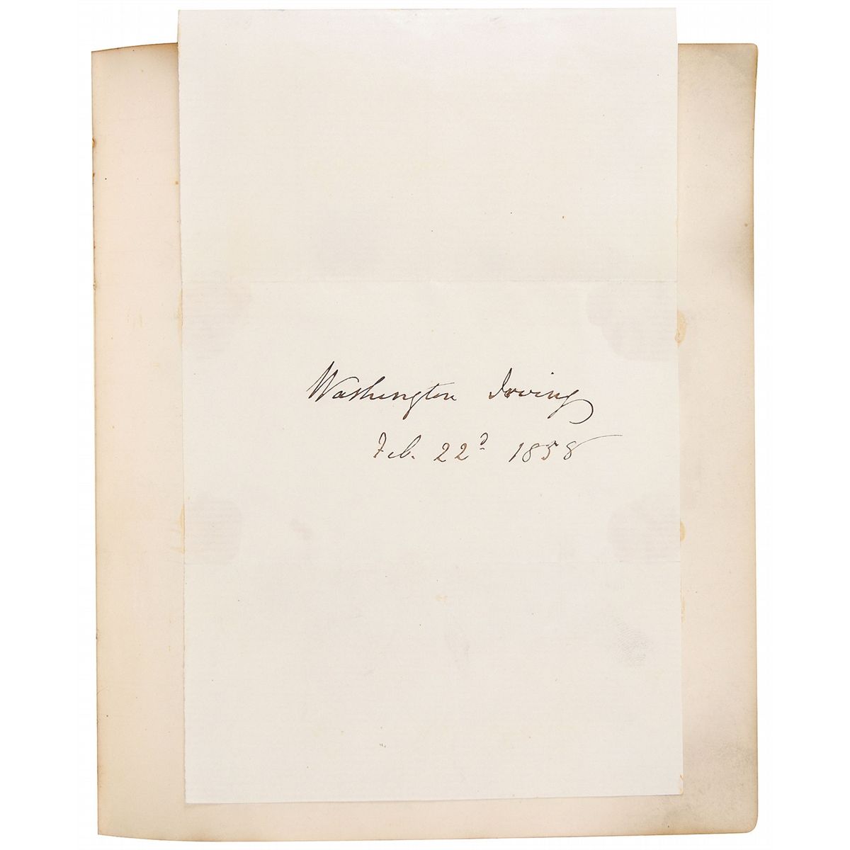 Extraordinary autograph book compiled by of Walter W. Cobb, a member of the Illinois House of Representatives from Franklin County, 7 x 8, containing over 125 autograph items of various formats affixed within, signed by some of the most important and influential figures of the 19th century, including: John Tyler (ANS and signature), James Buchanan (free frank signature), John Quincy Adams (signature), Franklin Pierce (signature), Millard Fillmore (signature), Martin Van Buren (two signatures), Sam Houston (signature), Jefferson Davis (signature), John C. Breckenridge (ANS), Nathaniel P. Banks (ANS), Stephen A. Douglas (ANS) Samuel F. B. Morse (ANS), James Lawrence Orr (ANS), Roger B. Taney (ANS), Matthew F. Maury (ANS), James Fenimore Cooper (signature), Washington Irving (signature), Louis Agassiz (signature), Charles Sumner (AQS), Henry William Herbert (ANS), John B. Floyd (signature), William Seward (ANS), John K. Kane (AQS), John Abbott (ANS), John Scott Harrison (ANS), Sarah Hopkins Bradford (ALS), Henry A. Wise (ANS), Elihu Burritt (AQS), George Bancroft (ALS), Preston King (ANS with wax seal), John Ellis Wool (ALS), Roscoe Conkling (ALS and signature), Emma Willard (AQS), William H. DeLancey (signature), Fitz-Green Halleck (ANS), Oliver Wendell Holmes, Sr. (ANS), Henry Wilson (signature), Hannibal Hamlin (AQS), Jared Sparks (signature), William Cullen Bryant (signature), Mary Jane Holmes (two ANS), James Lloyd Breck (ANS), Washington Hunt (signature), Hamilton Fish (signature), Horace Greeley (signature), Bayard Taylor (ANS and signature), Lyman Trumbull (signature), Dewitt Clinton (signature), William B. Sprague (ALS), William M. Gwinn (signature), Edward Everett (signature), Horatio Potter (ALS), Horatio Seymour (ANS), Theodore Parker (ANS), Robert Charles Winthrop (ANS), Henry Grinnell (ANS), George Williams (signature), George D. Prentice (signature), Abner Jackson (ANS), Park Benjamin, Sr. (signature), Benjamin Hale (signature), William Buell Sprague (ANS), George William Curtis (signature), Lydia Huntley Sigourney (signature), and more than sixty others. In overall very good to fine condition, with scattered toning and rippling to various sheets and slips from adhesive to reverse, and the binding separated from the book with many loose pages. A comprehensive and exceptional compilation of 19th-century notables.