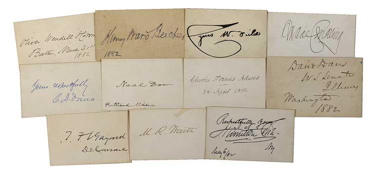 Eleven ink signatures on off-white cards, each roughly 3 x 2 in size. Signers are: Oliver Wendell Holmes, Henry Ward Beecher, Cyrus W. Field, Roscoe Conkling, C. A. Dana, Neal Dow, Charles Francis Adams, David Davis, T. F. Bayard, M. R. Waite, and Hamilton Fish. A bit of light toning and soiling, otherwise overall condition is fine. RRAuction COA.