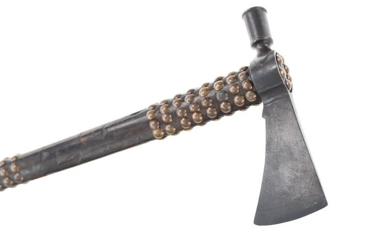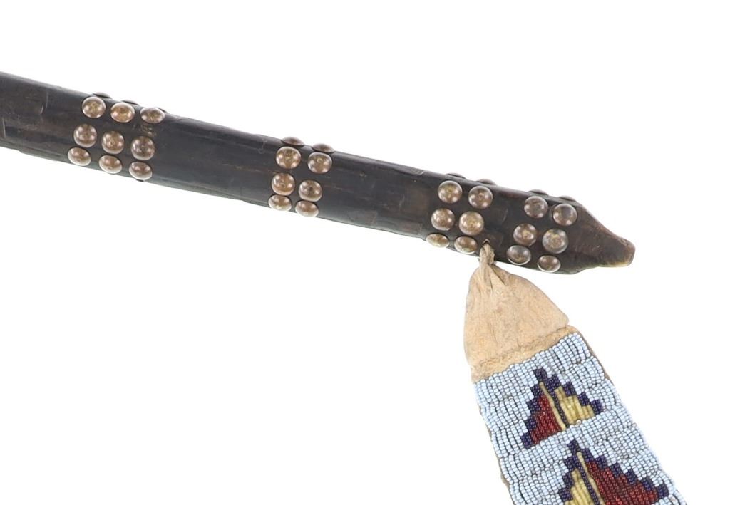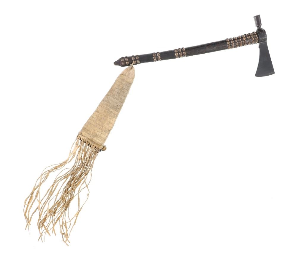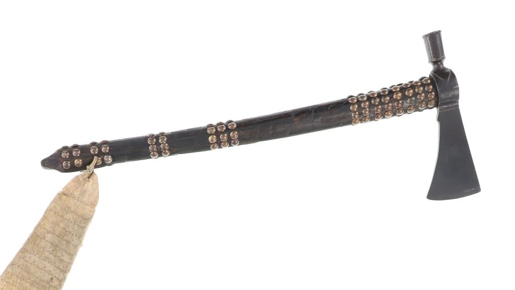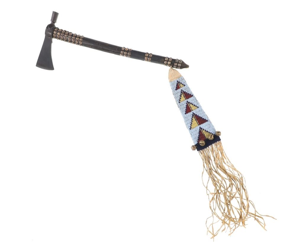 The lot features a 19th-century pipe tomahawk head with drop from the Oglala Lakota Sioux Indians of Pine Ridge Indian Reservation in South Dakota from the ex-collection of Ted and Lilly Jarvis Jackson Hole, Wyoming. The head exhibits a hand-forged iron head that shows a pipe bowl forged from a rifle barrel, with rifling still visible in the bowl. The head has a small rear facing spur, chevrons on the oval eyelet hole, and the blade has a curved edge withs lightly in-turn inside edge. This is paired with a nice hardwood haft handle adorned with brass tack designs with light faded hot file branding and at the bottom a beaded Indian tanned hide drop attached to a small suspension hole near the bottom smoking end. The drop is comprised of Indian tanned buffalo hide with classic Northern Plains Sioux geometric beadwork with older glass trade seed beads showing colors of light blue, greasy yellow, cobalt, and semi-transparent red with a small blue stroud trade clothe at the bottom with four brass hawk trade bells. The bottom has frill twisted Indian hide fringes. This is a nice, later added example with older age and materials. Provenance: From the collection of Ted and Lilly Jarvis Jackson Hole, Wyoming. This is a nice late-19th-century head with artful haft and drop paired with the piece. Head measures 7.5-inches long by 2.5-inches across the blade, overall length is 19.5-inches long and the drop is 25-inches in length.