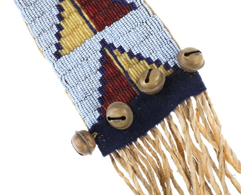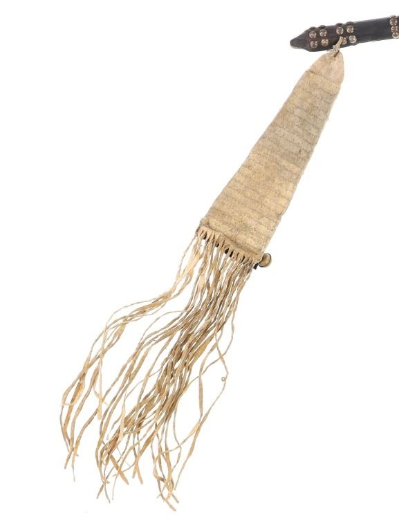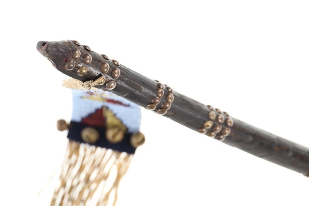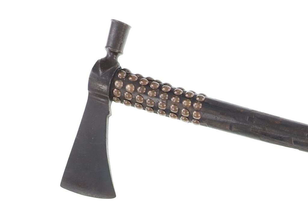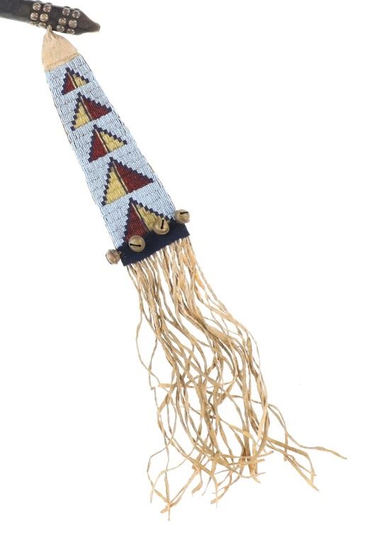 The lot features a 19th-century pipe tomahawk head with drop from the Oglala Lakota Sioux Indians of Pine Ridge Indian Reservation in South Dakota from the ex-collection of Ted and Lilly Jarvis Jackson Hole, Wyoming. The head exhibits a hand-forged iron head that shows a pipe bowl forged from a rifle barrel, with rifling still visible in the bowl. The head has a small rear facing spur, chevrons on the oval eyelet hole, and the blade has a curved edge withs lightly in-turn inside edge. This is paired with a nice hardwood haft handle adorned with brass tack designs with light faded hot file branding and at the bottom a beaded Indian tanned hide drop attached to a small suspension hole near the bottom smoking end. The drop is comprised of Indian tanned buffalo hide with classic Northern Plains Sioux geometric beadwork with older glass trade seed beads showing colors of light blue, greasy yellow, cobalt, and semi-transparent red with a small blue stroud trade clothe at the bottom with four brass hawk trade bells. The bottom has frill twisted Indian hide fringes. This is a nice, later added example with older age and materials. Provenance: From the collection of Ted and Lilly Jarvis Jackson Hole, Wyoming. This is a nice late-19th-century head with artful haft and drop paired with the piece. Head measures 7.5-inches long by 2.5-inches across the blade, overall length is 19.5-inches long and the drop is 25-inches in length.
