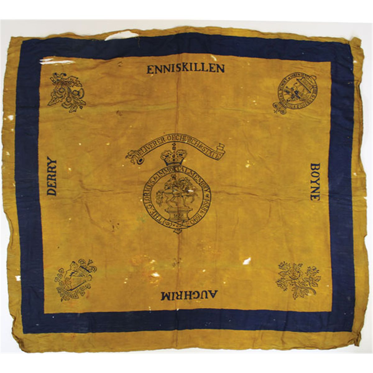 An Orange Order commemorative silk with a navy border, featuring a printed image of William of Orange on horseback surrounded by the words, "The glorious and immortal memory of 1688 & 1690" and symbols of Ireland, England, Scotland and William of Orange in each corner.