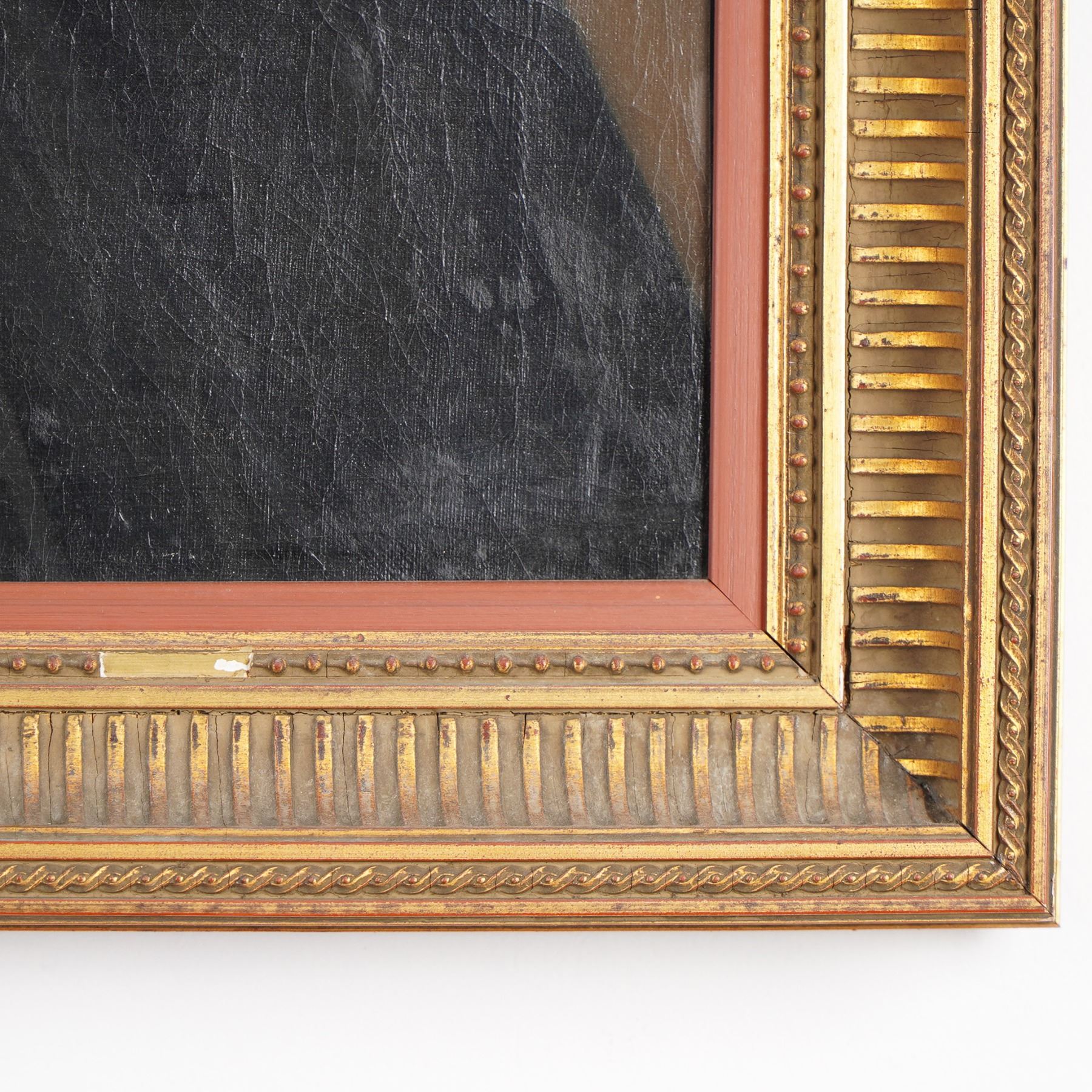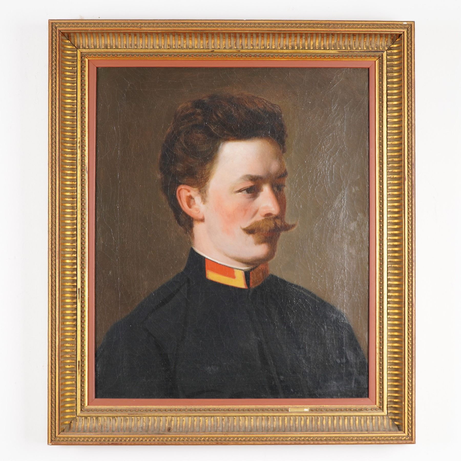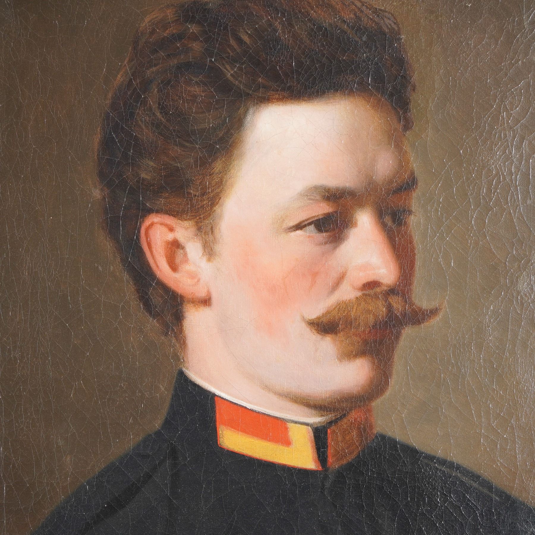 Striking 19th century oil on canvas portrait depicting a distinguished military officer, believed to be of Prussian or Central European origin. The young officer is portrayed with exceptional realism and finesse, his noble bearing accentuated by a crisply tailored black tunic featuring a vivid red and yellow collar - a detail characteristic of mid-to-late 19th century Prussian or Austro-Hungarian military dress. His finely groomed mustache and confident gaze convey both discipline and aristocratic poise, while the subtly blended background allows the subject's expression and uniform to command full attention. The surface bears a graceful craquelure, enhancing its antique allure. Elegantly housed in an ornate giltwood frame with fluted and beaded accents, this portrait is a timeless tribute to 19th century European military prestige and makes a powerful impression in both classical and modern interiors.