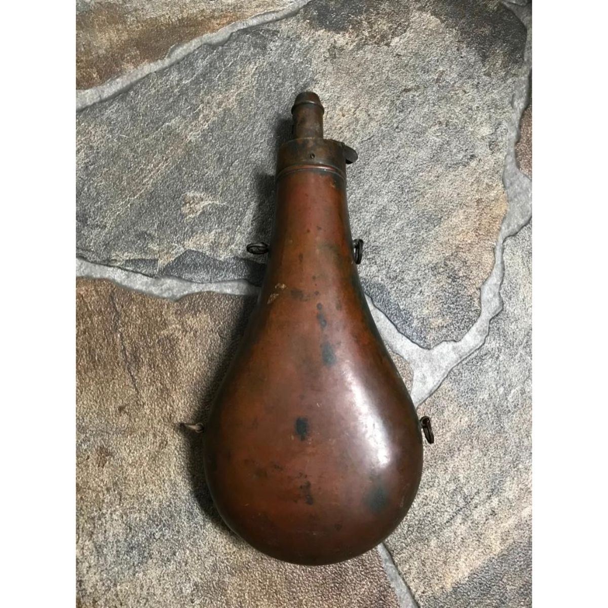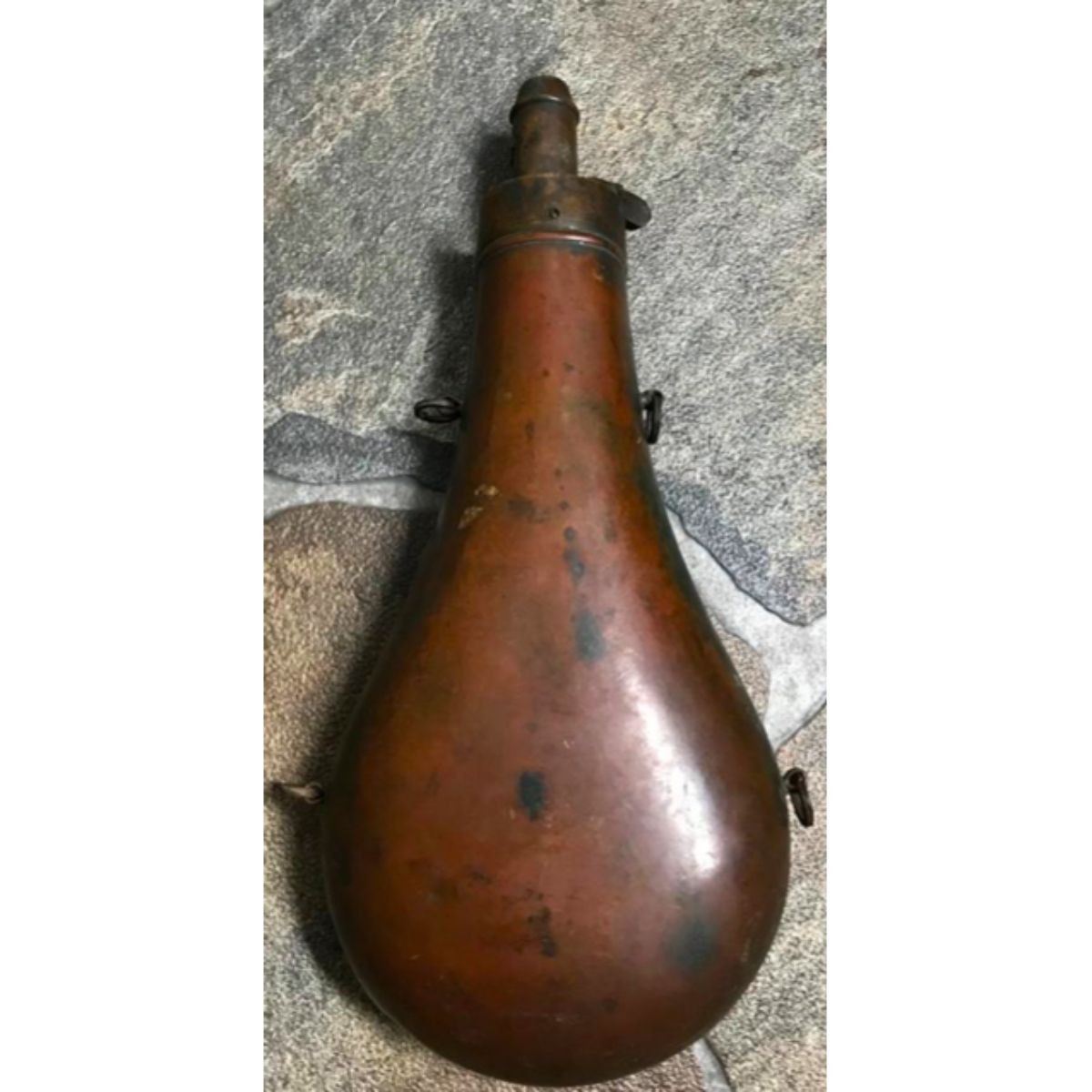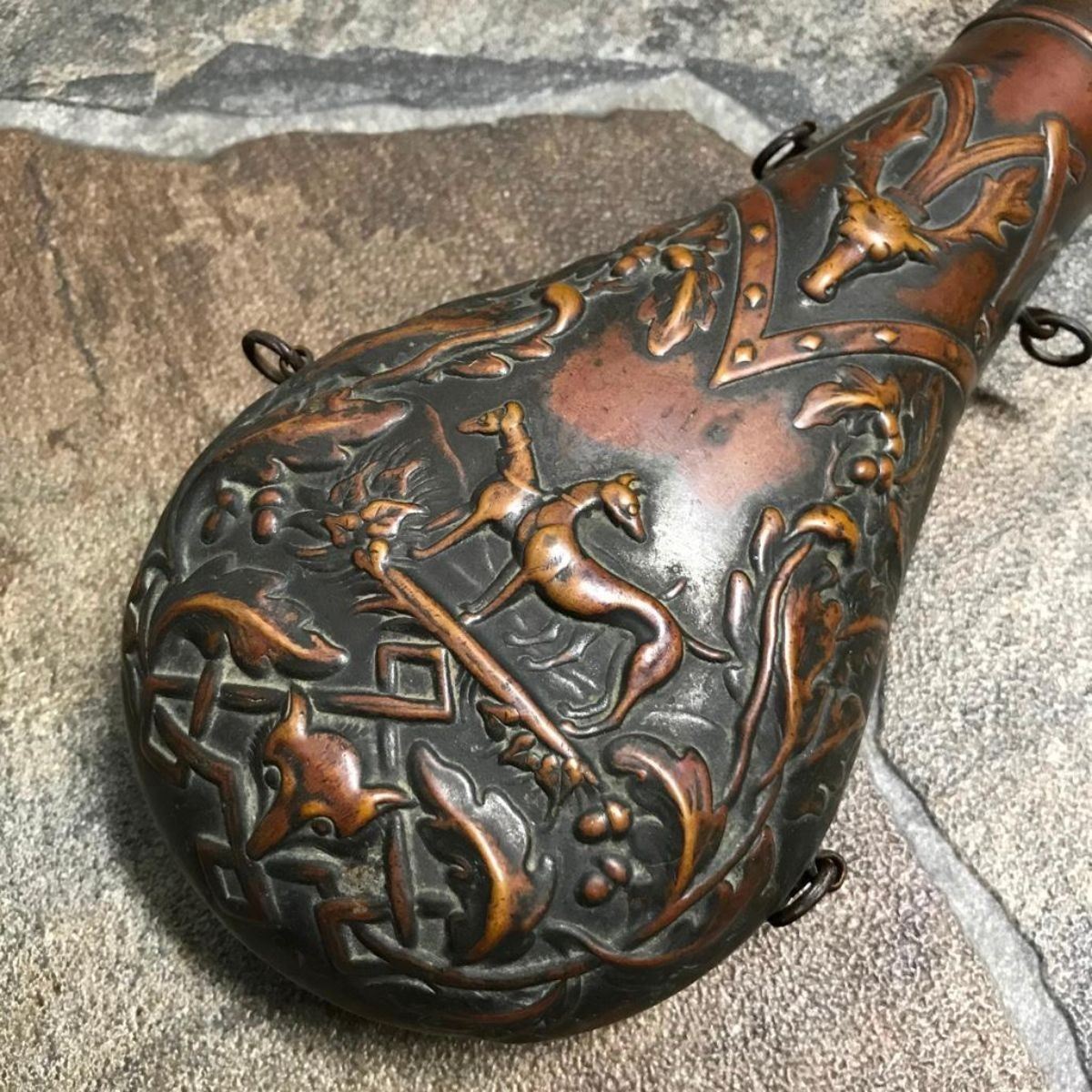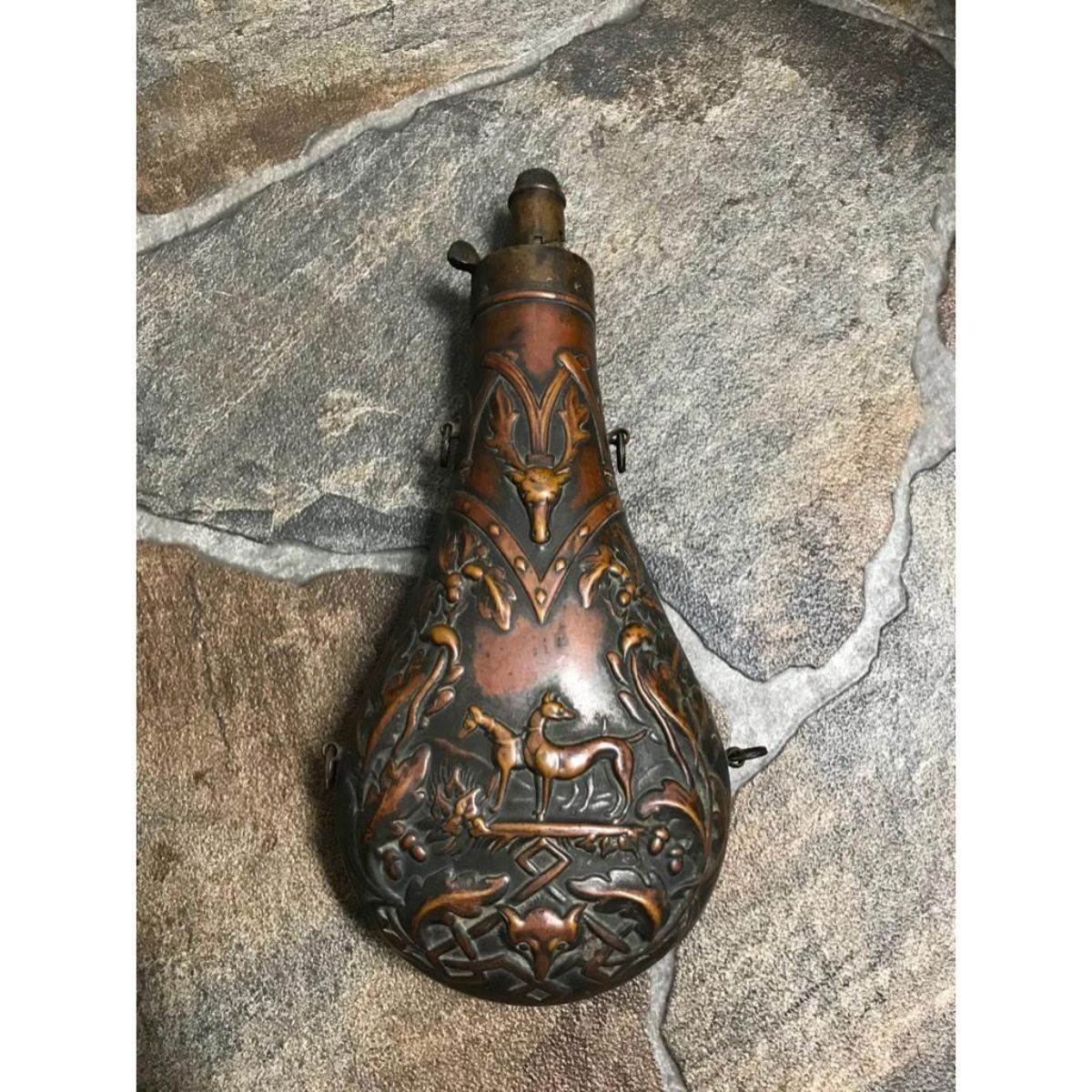19th Century ornate brass powder flask with hunting scene, pair of dogs amid acorns & leaves, forest backdrop, with stag head at top & fox head at bottom. Gorgeous flask. * missing spring. 8 1/2" L X 4" W. Â - 9217-021718-IN-132