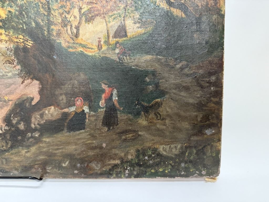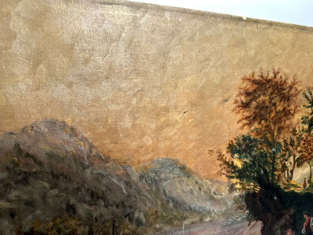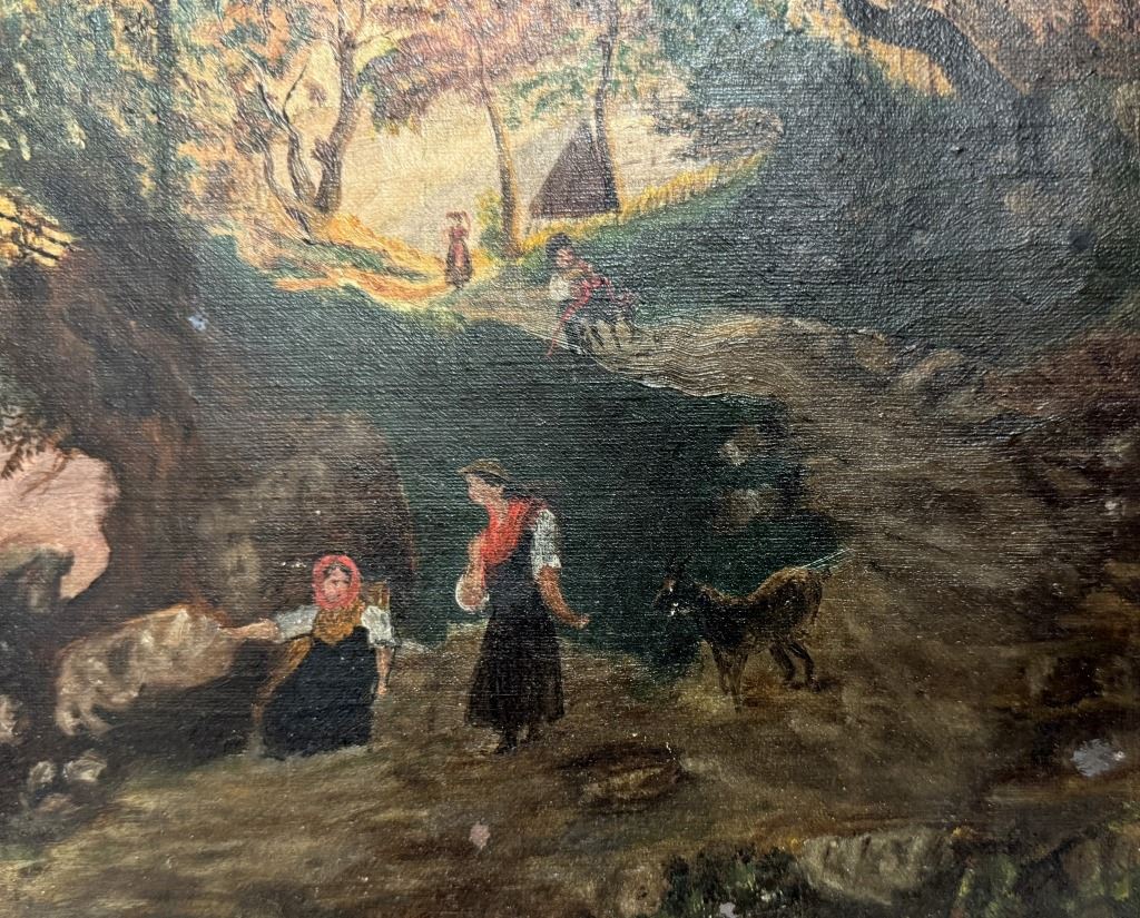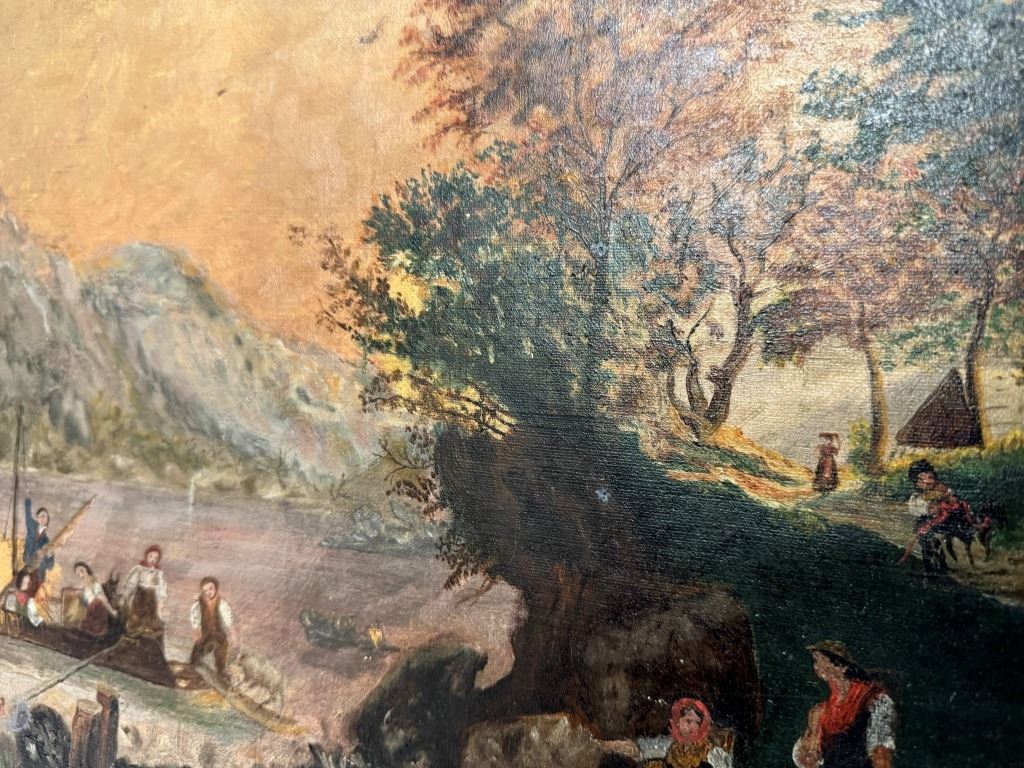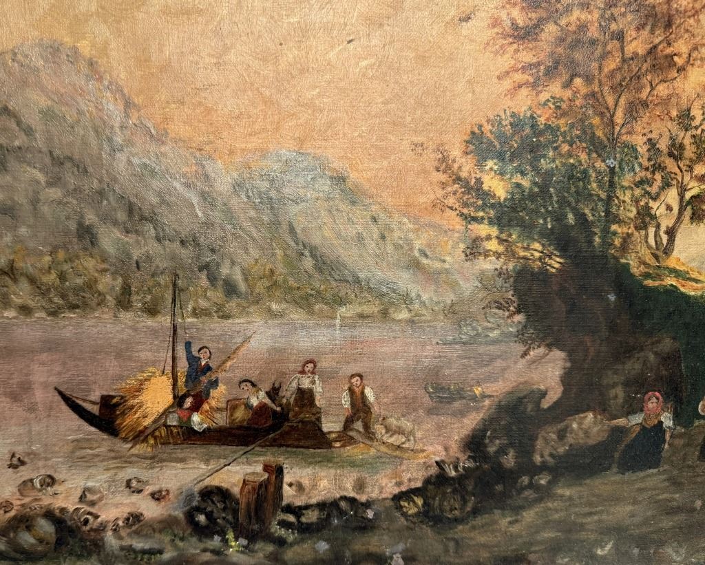 Item/Description: Antique 19th-century oil painting on canvas depicting a serene, bucolic landscape featuring several figures interacting on the lakeshore and in a boat, with rolling hills or mountains in the background and a dark, moody sky. This pastoral landscape, characteristic of the Continental style, shows an idyllic rural scene with people peacefully interacting with nature.