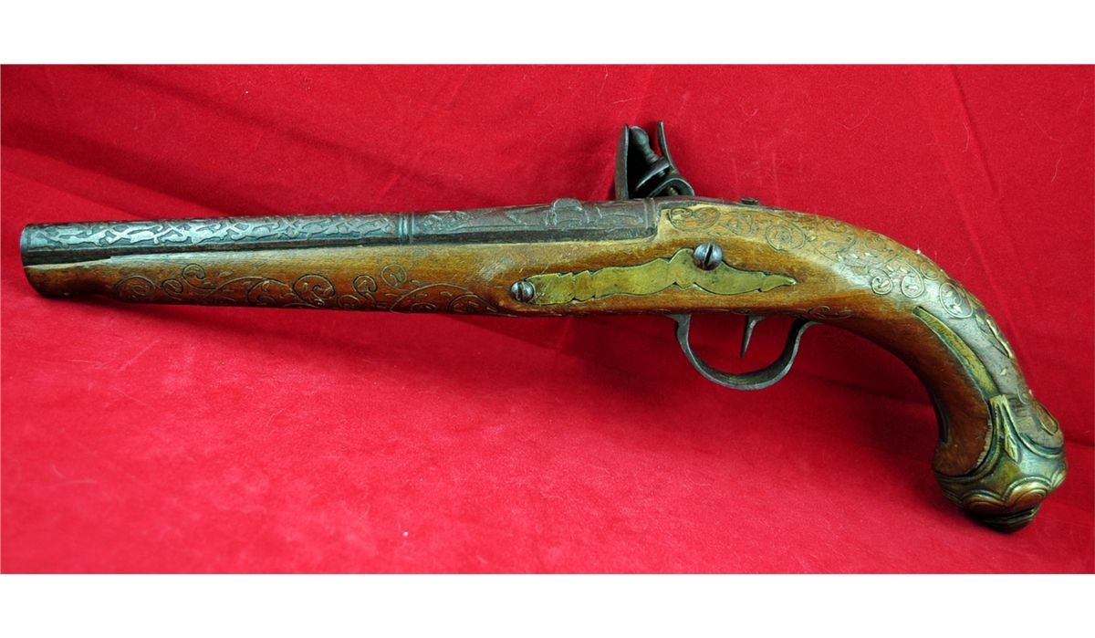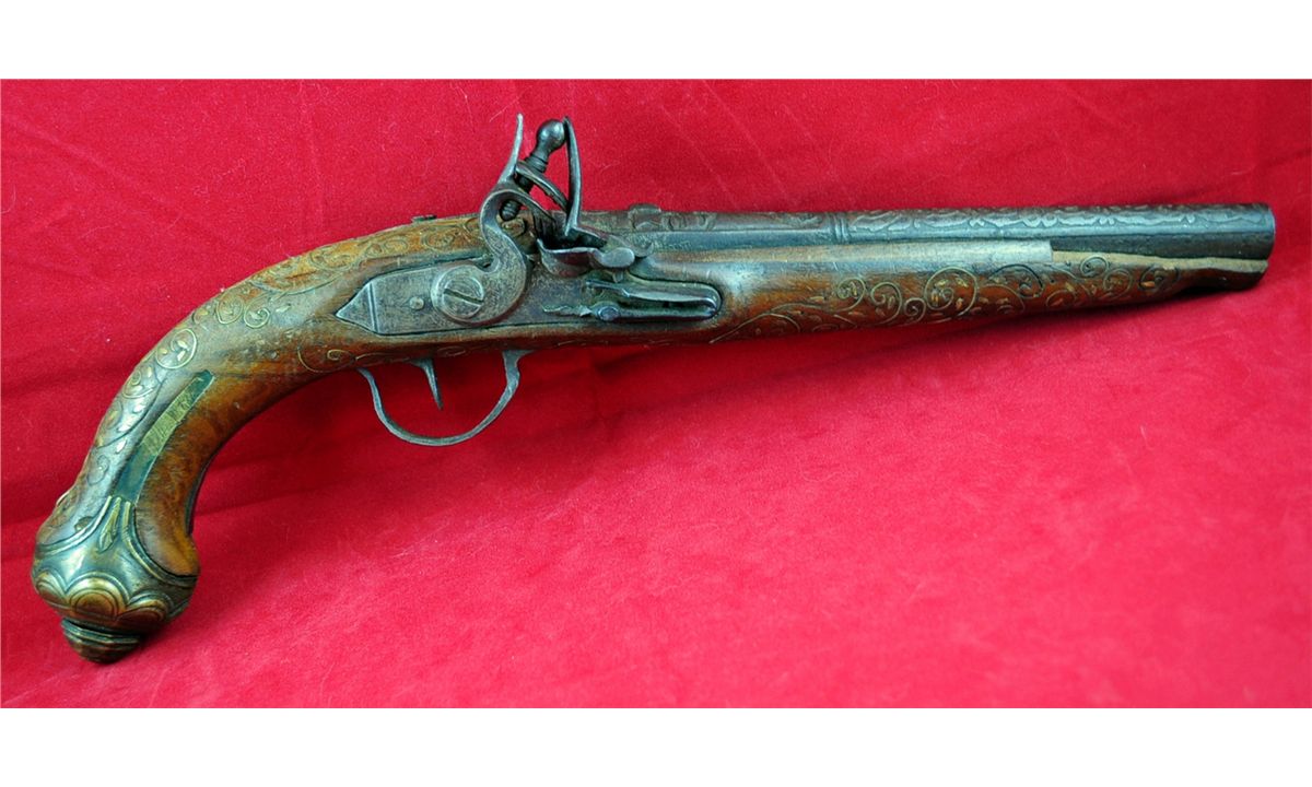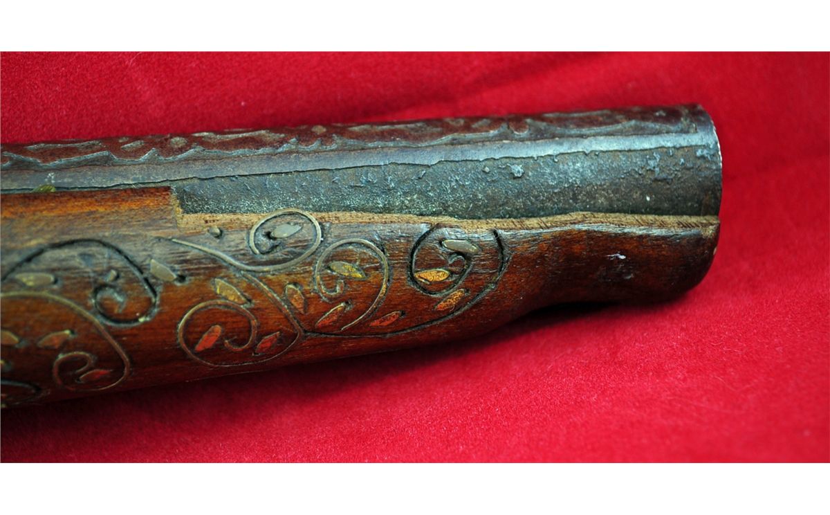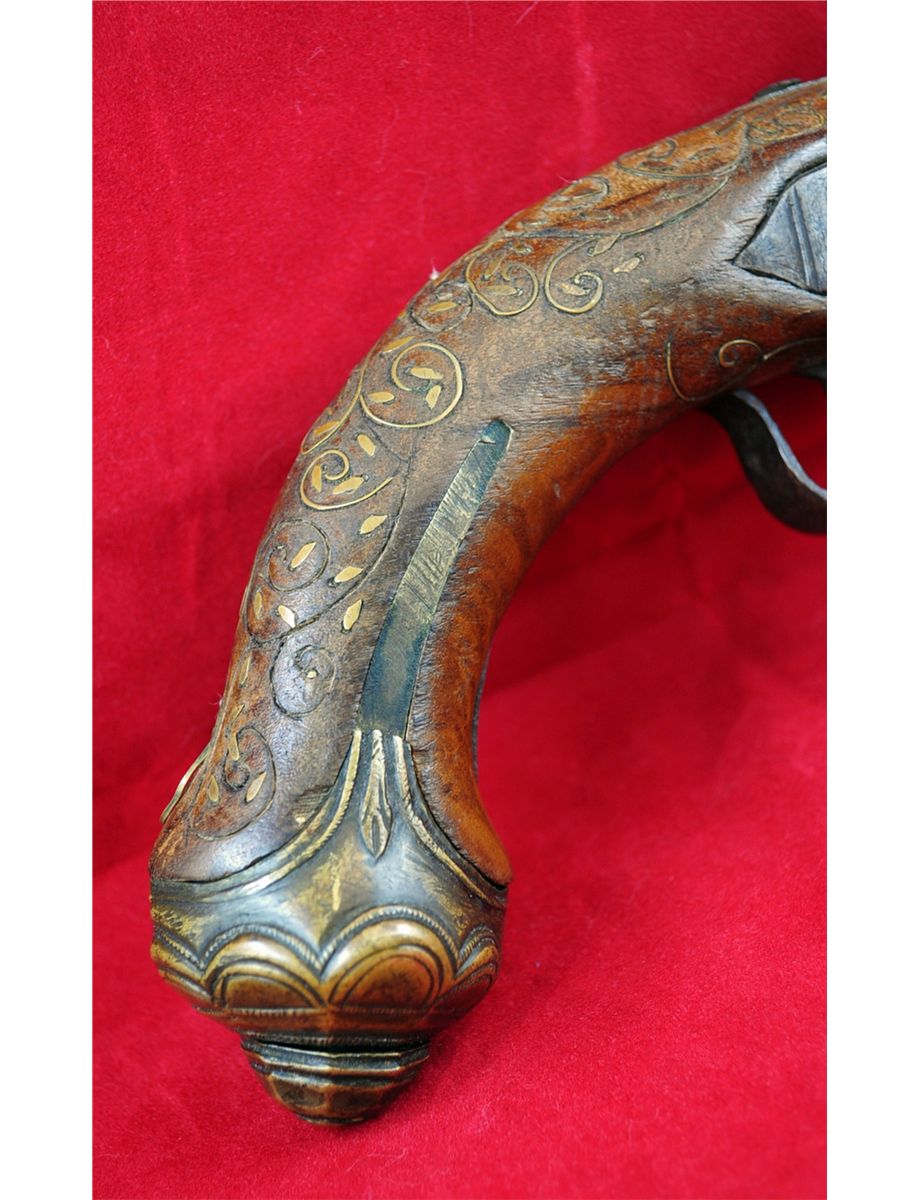 Arabic Flintlock Early 19th Century, 8.5"decorated Barrel, Brass Butt and inlay Decoration, Missing brass decoration and wood chip missing under barrel. Pistol has wear and damage. "SEE PHOTOS". Gun is being sold for collecting and decorative purposes, NOT for firing. See photos for more information.Kennedys Auction Service has not attempted to test fire any gun in this auction and all guns are sold in "AS IS CONDITION" and are not guaranteed to be operational.