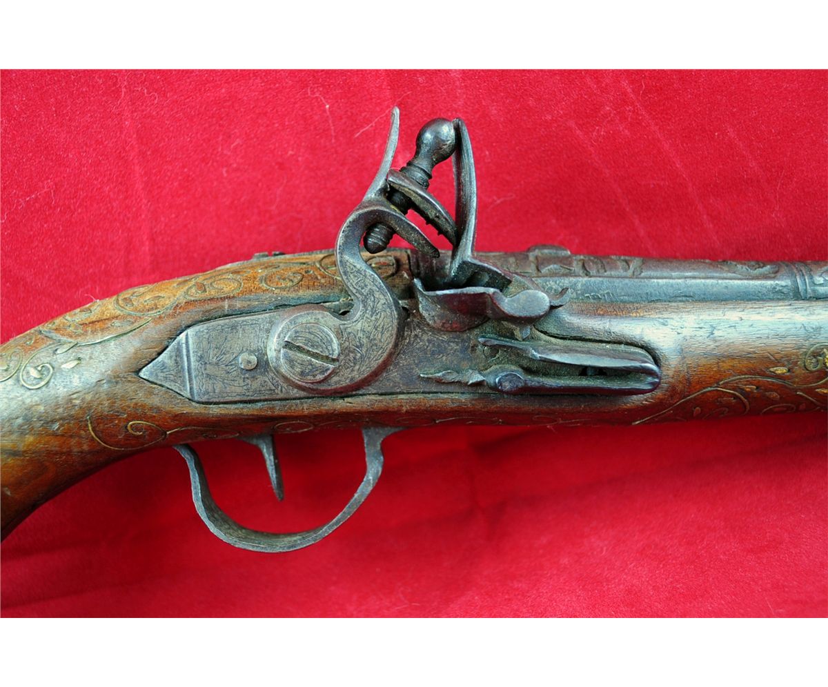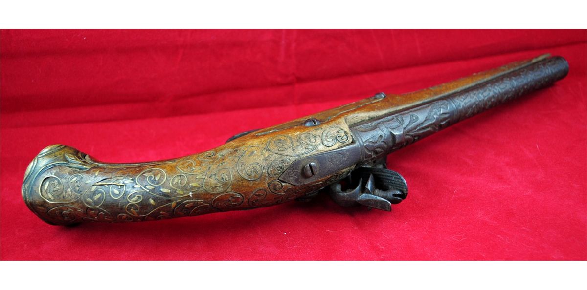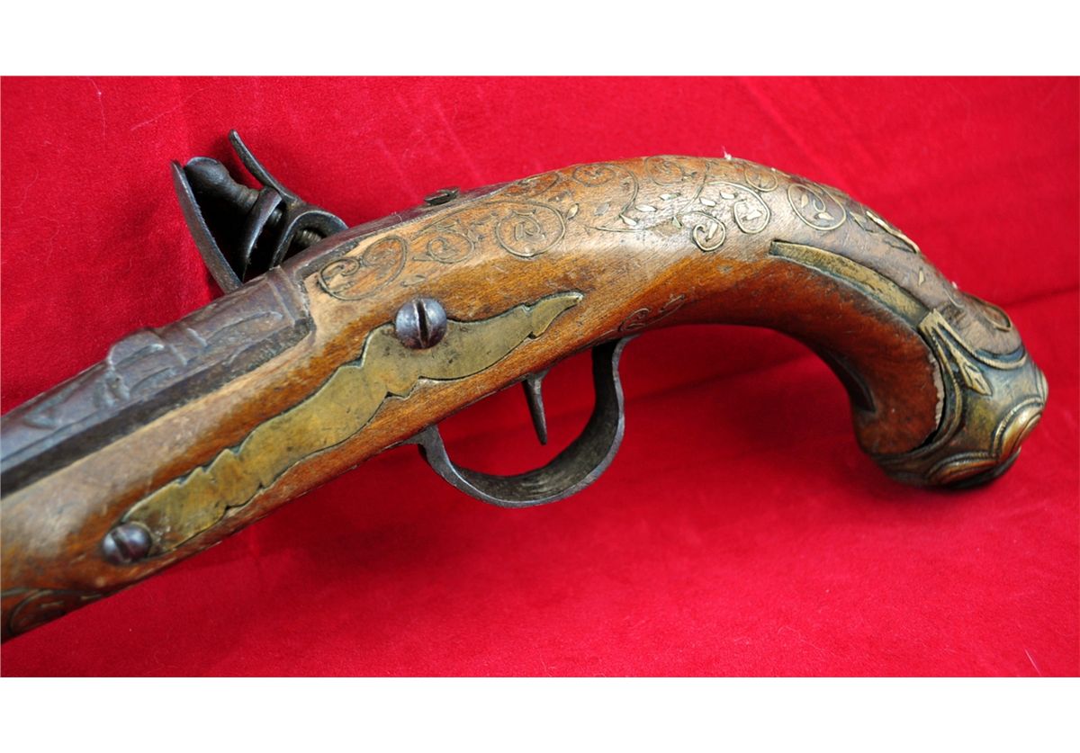 Arabic Flintlock Early 19th Century, 8.5"decorated Barrel, Brass Butt and inlay Decoration, Missing brass decoration and wood chip missing under barrel. Pistol has wear and damage. "SEE PHOTOS". Gun is being sold for collecting and decorative purposes, NOT for firing. See photos for more information.Kennedys Auction Service has not attempted to test fire any gun in this auction and all guns are sold in "AS IS CONDITION" and are not guaranteed to be operational.