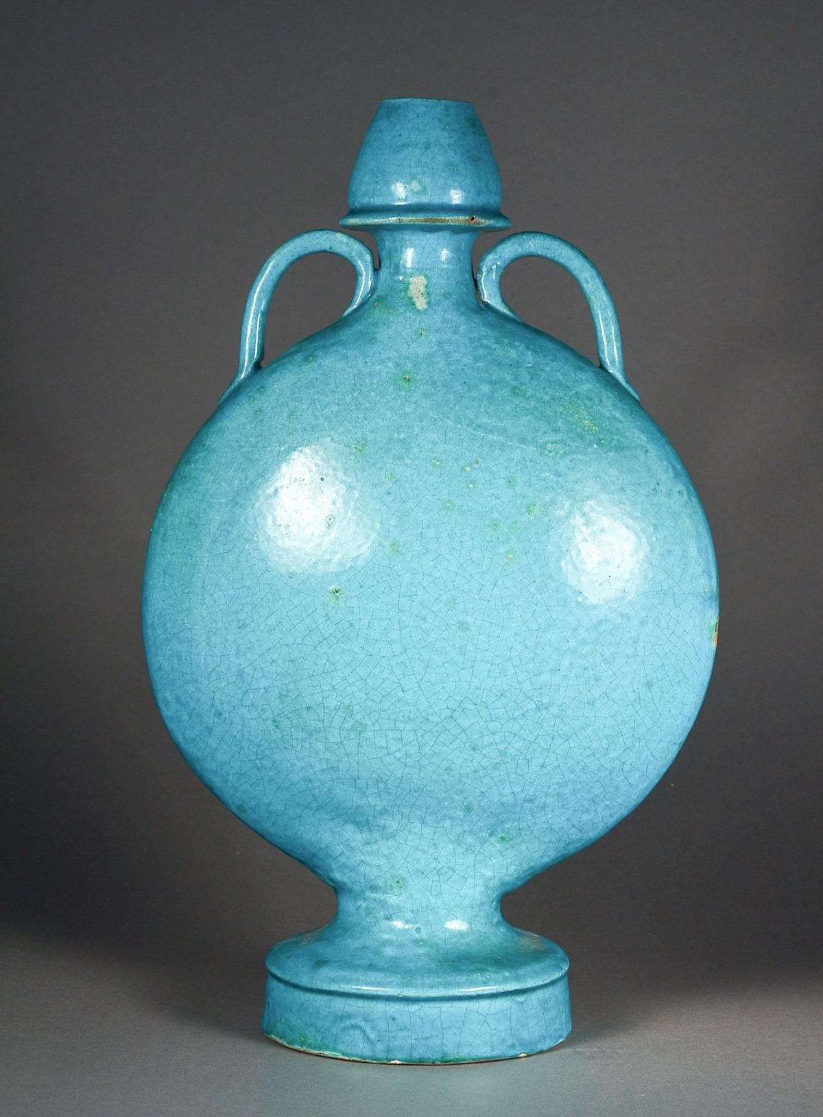 Antique Persian turquoise glazed porcelain flask; at least 100 years old; H: 36 cm, L: 20 cm, W: 10 cm