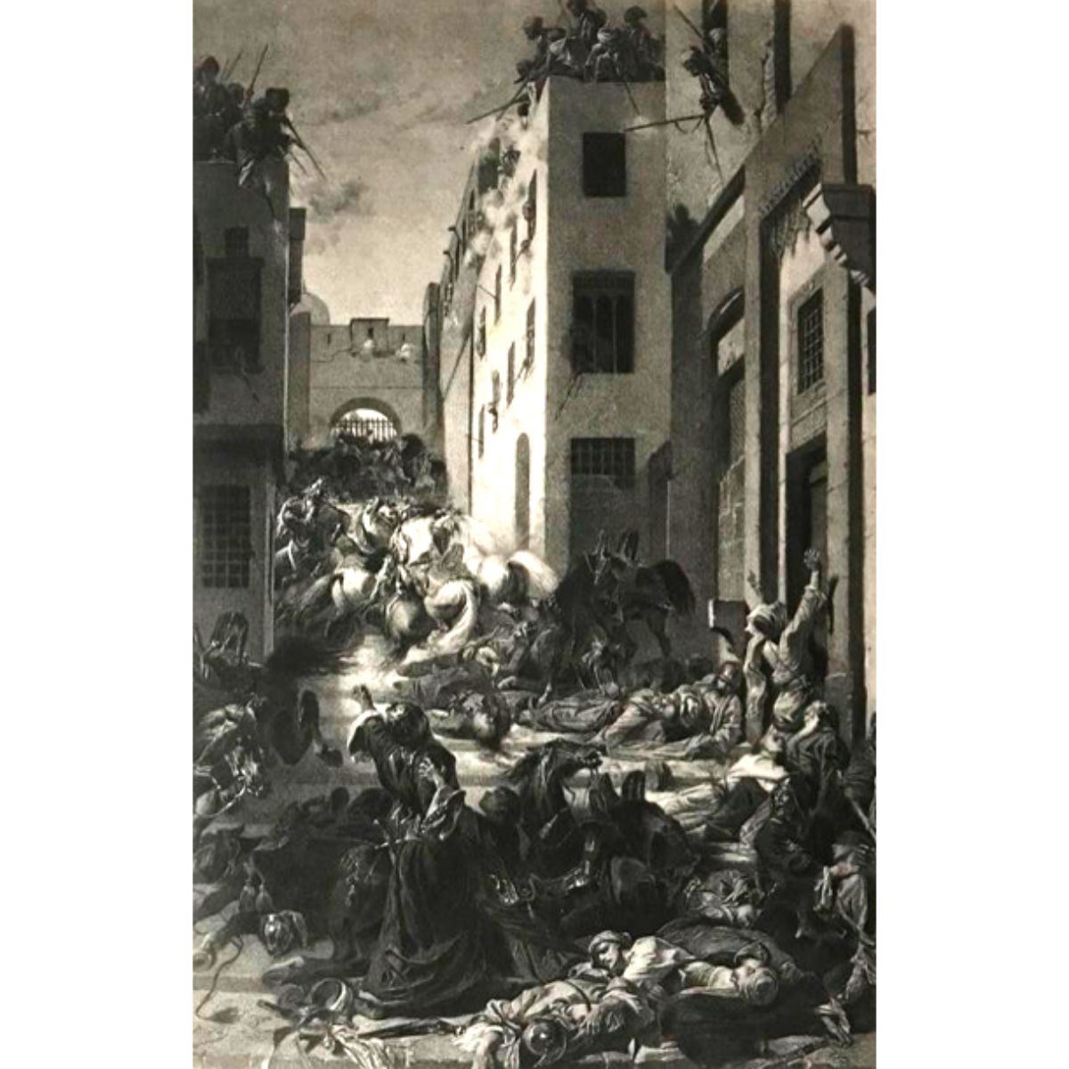 1880's photogravure print, Massacre Of The Marmelukesby Debbie & Co, from the original painting in the Gallery of The Luxembourg.10" X 14 1/2". Bookplate from The Masterpieces of French Art.Comes with original descriptive page.