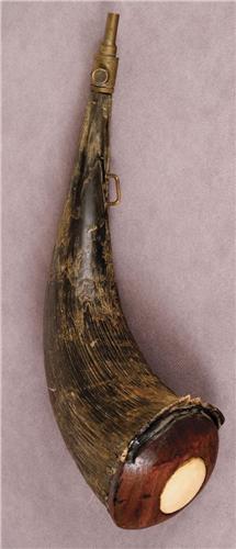 19th Century Powder Horn. 12" long. Constructed from Buffalo Horn. Base is wood with bone inlay. Spout is brass. Rare. (est $1,200-1,500)