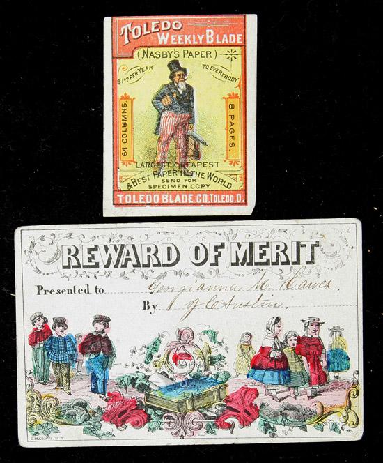 19th Century Reward of Merit and Newspaper Stamp. Two pieces of 19th century ephemera, including a "Reward of Merit" certificate presented to Georgianna M. Hawes by J.C. Austin, and a Toledo Weekly Blade newspaper stamp. Each has mounting remnants on the back. Lot of 2 notes.