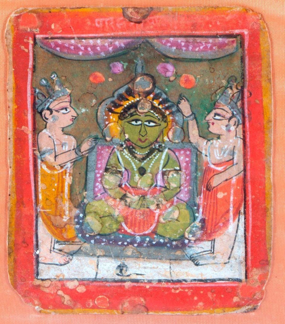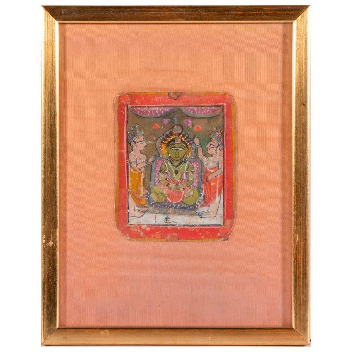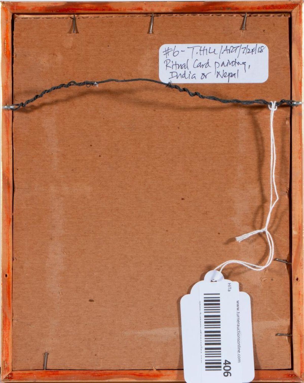 Frame: 10 inches high x 7 ¾. Paper size: 8 ¾ inches high x 6 ½. Image: 4 ¼ inches high x 3 ½. Medium: Hand painted card. Condition: Wear and some fading with age. Date: 19th century.