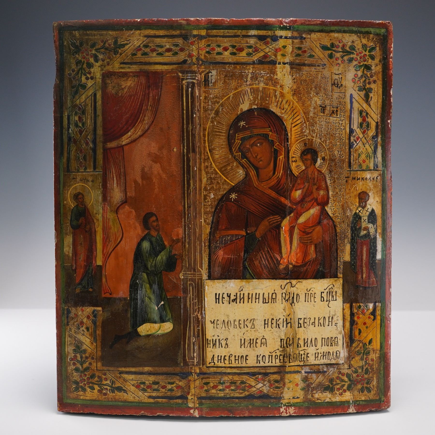 Russian Orthodox icon depicting The Unexpected Joy, hand-painted in tempera on a wood panel with two inset back slats. The central image features the Virgin Mary holding the Christ Child, both with finely detailed haloes. To the left, a kneeling male figure, representing a repentant sinner, prays before the icon of the Virgin, flanked by a standing saint. The right border includes a depiction of St. Nikolai, with floral and geometric border motifs. A large panel at the bottom bears a Russian inscription that reads, "The Unexpected Joy of the Most Holy Theotokos," referencing the theme of repentance and divine intercession. The reverse bears a faint handwritten inscription in Cyrillic reading Nechaiannaya Radost, further confirming the subject as The Unexpected Joy. Additional markings on the back appear to be in Cyrillic but are too faint and worn to decipher. This icon follows the traditional Unexpected Joy type, a composition that originated in late 17th-century Russian devotional art and remained widely venerated. The back of the panel shows typical age wear and has a modern sawtooth hanger attached.